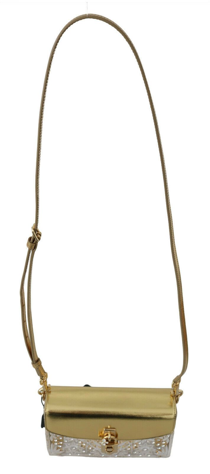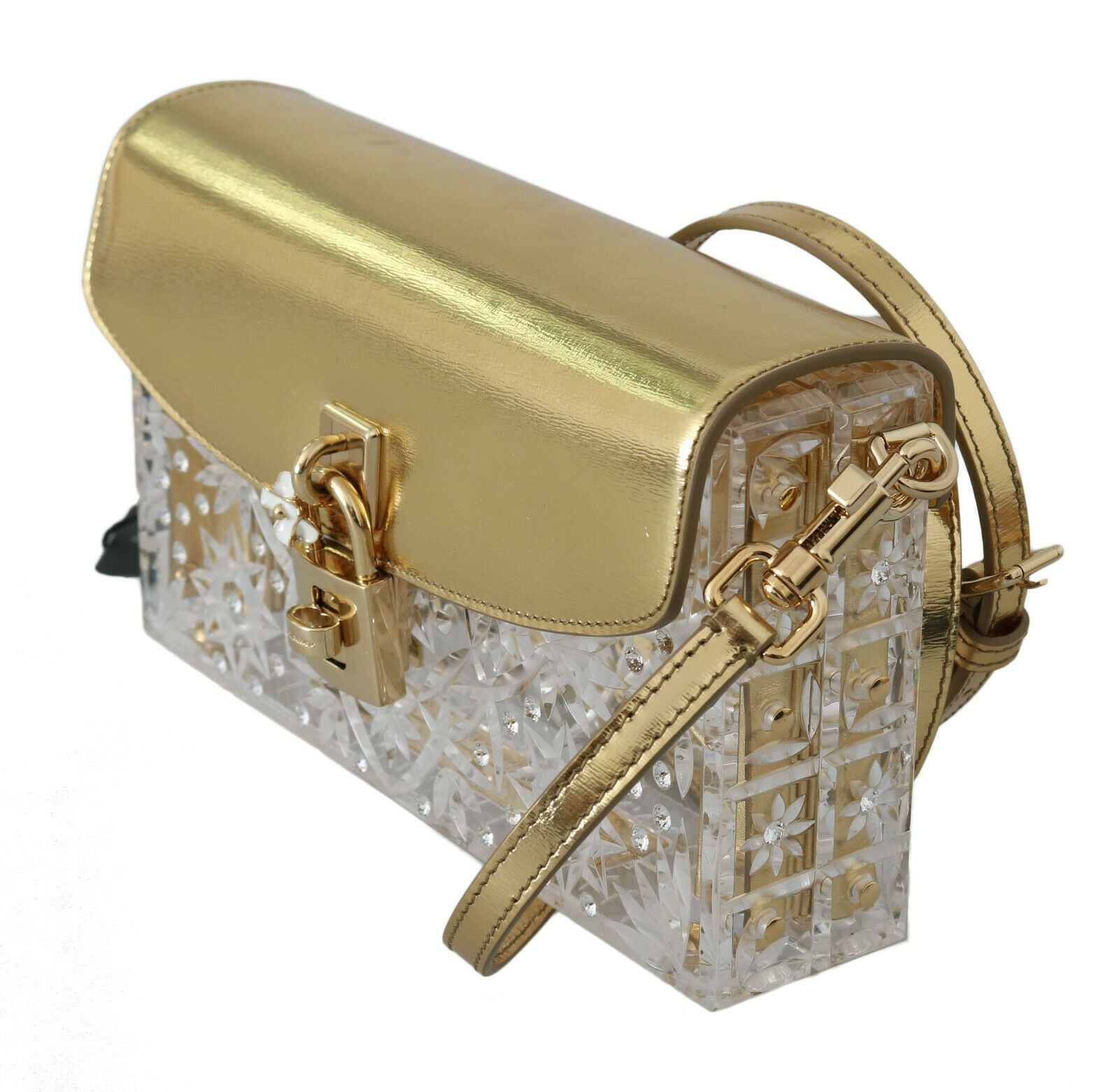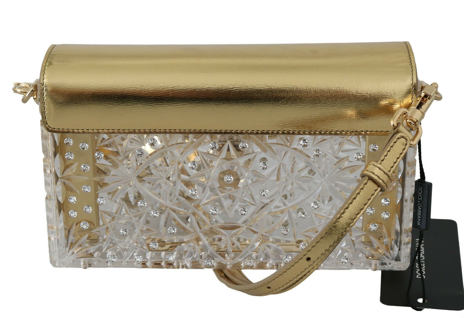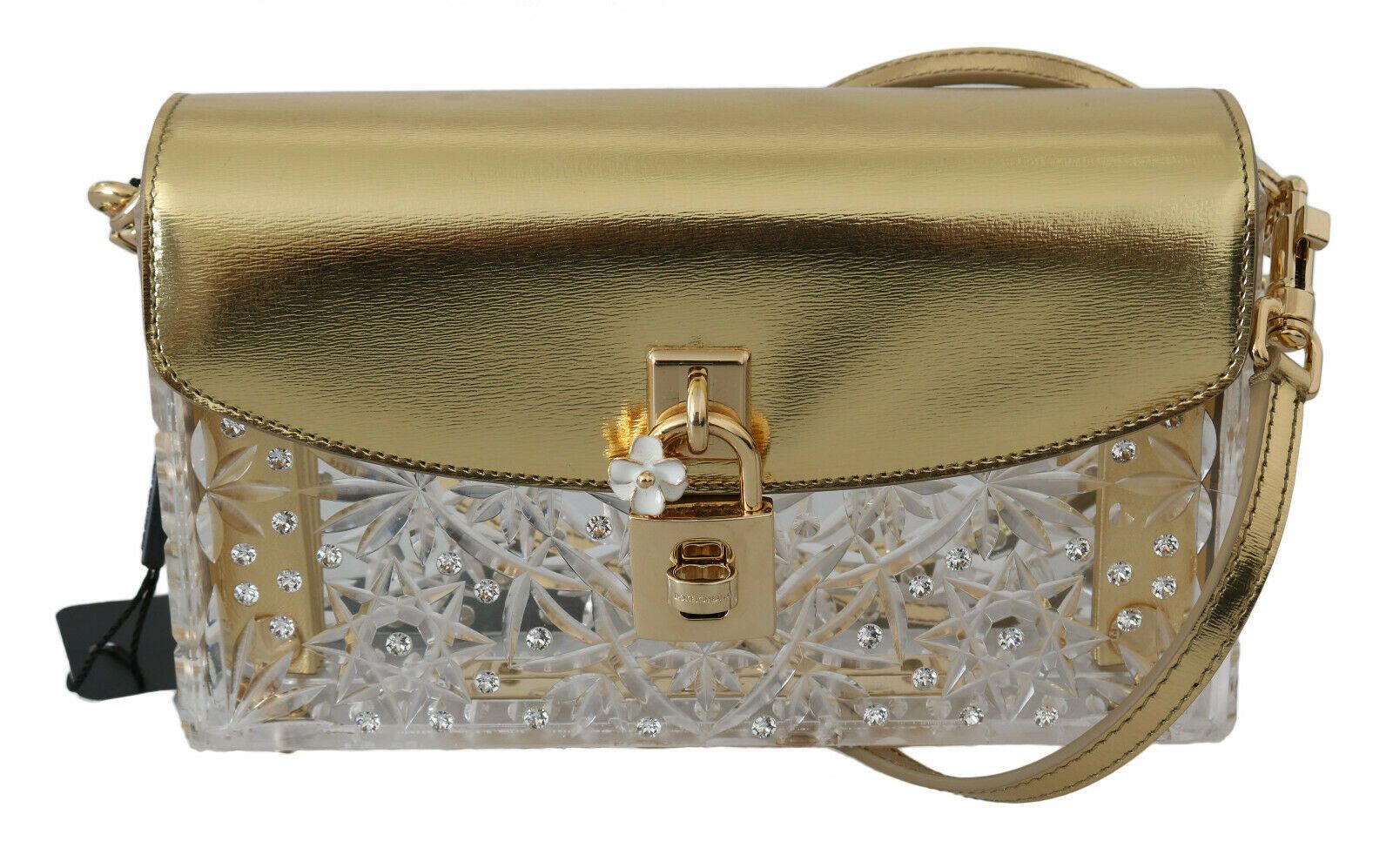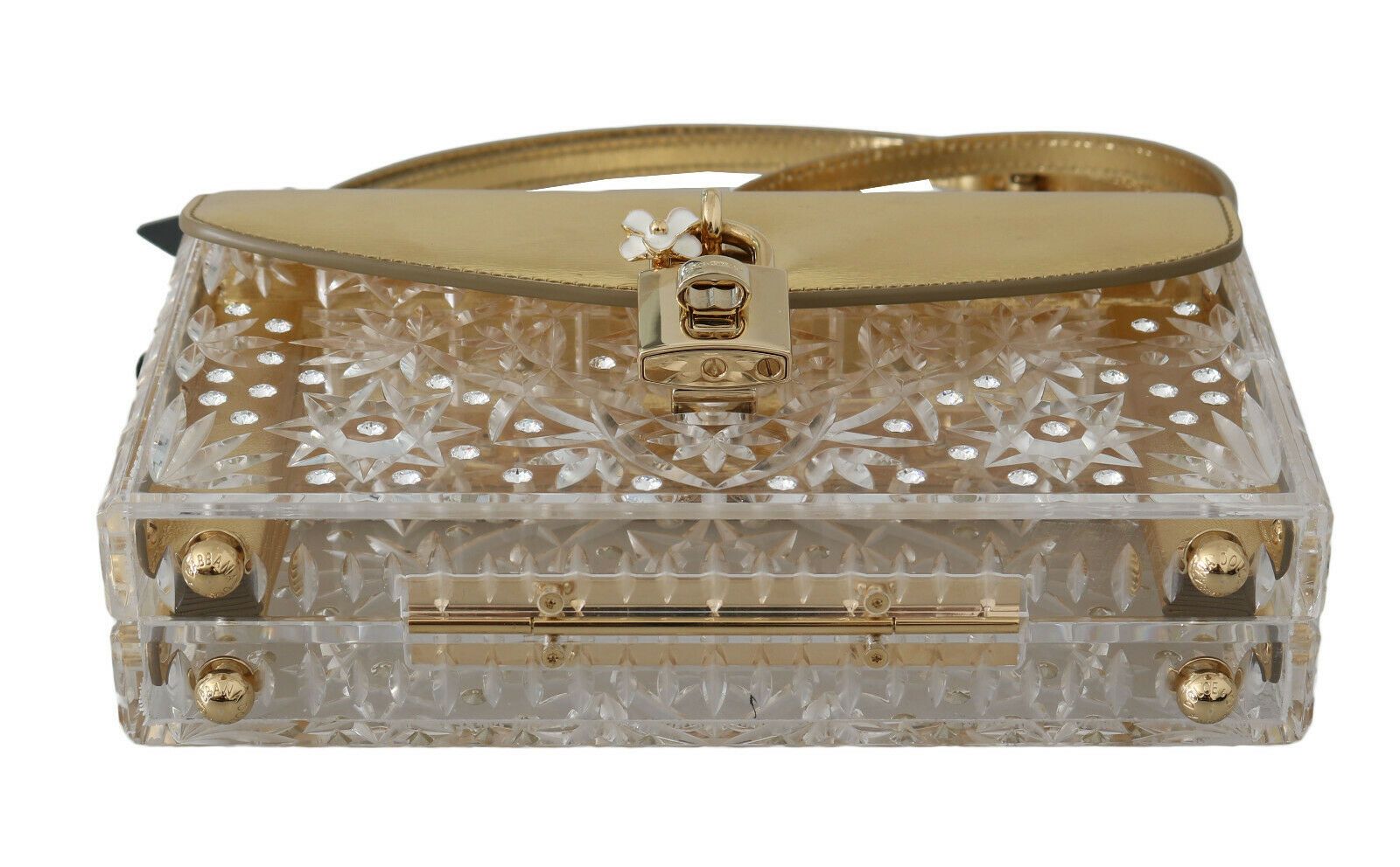 Indulge in the epitome of luxury with this stunning Dolce & Gabbana Dolce Box Bag. This exquisite piece is a testament to fine Italian craftsmanship, featuring a dazzling gold plexiglass exterior adorned with clear crystals that exude elegance. Its adjustable and detachable leather strap offers versatile carrying options, while the secure padlock flap closure guards your essentials. A leather interior lining adds a touch of sophistication, making this bag a must-have for any high-end collection.