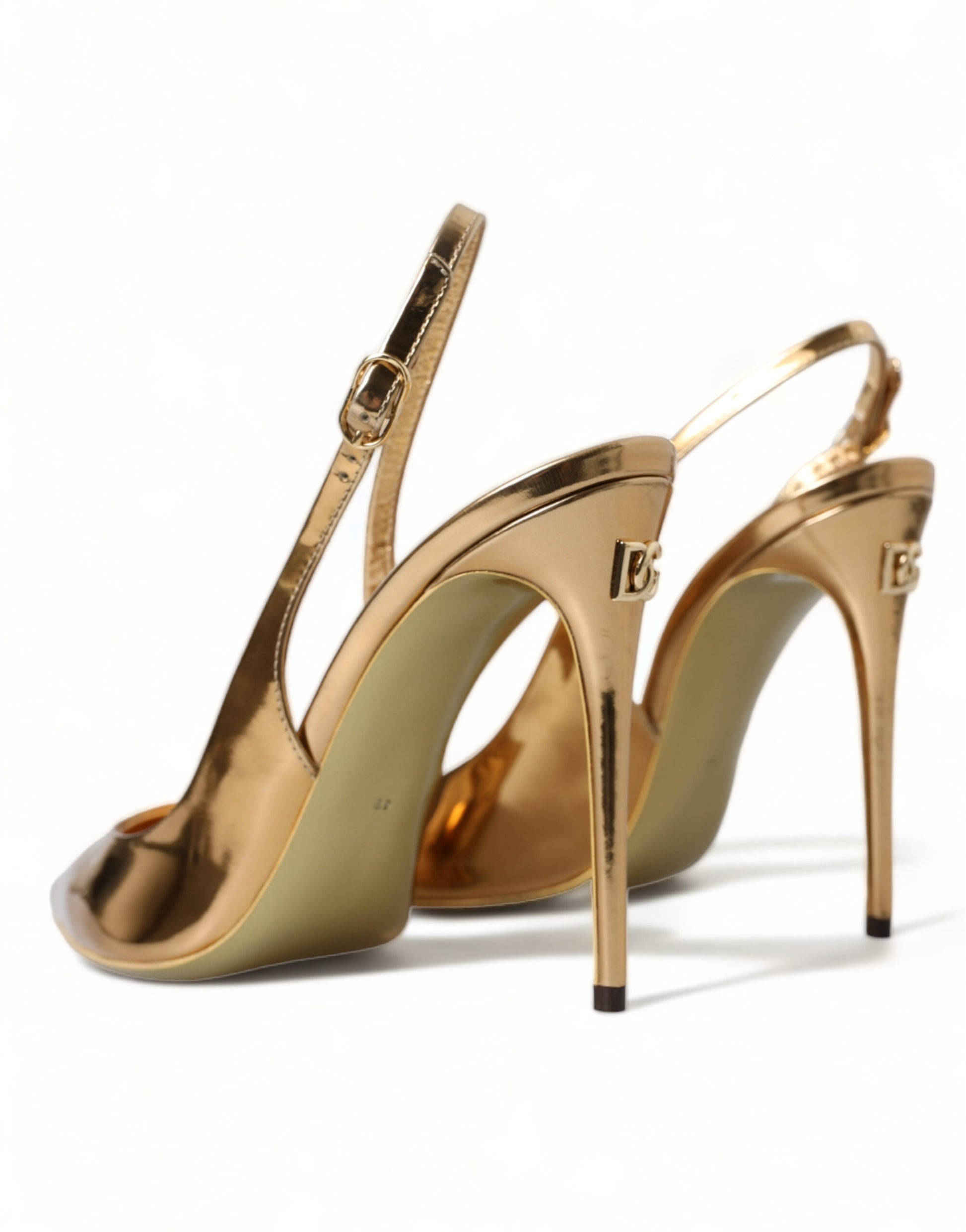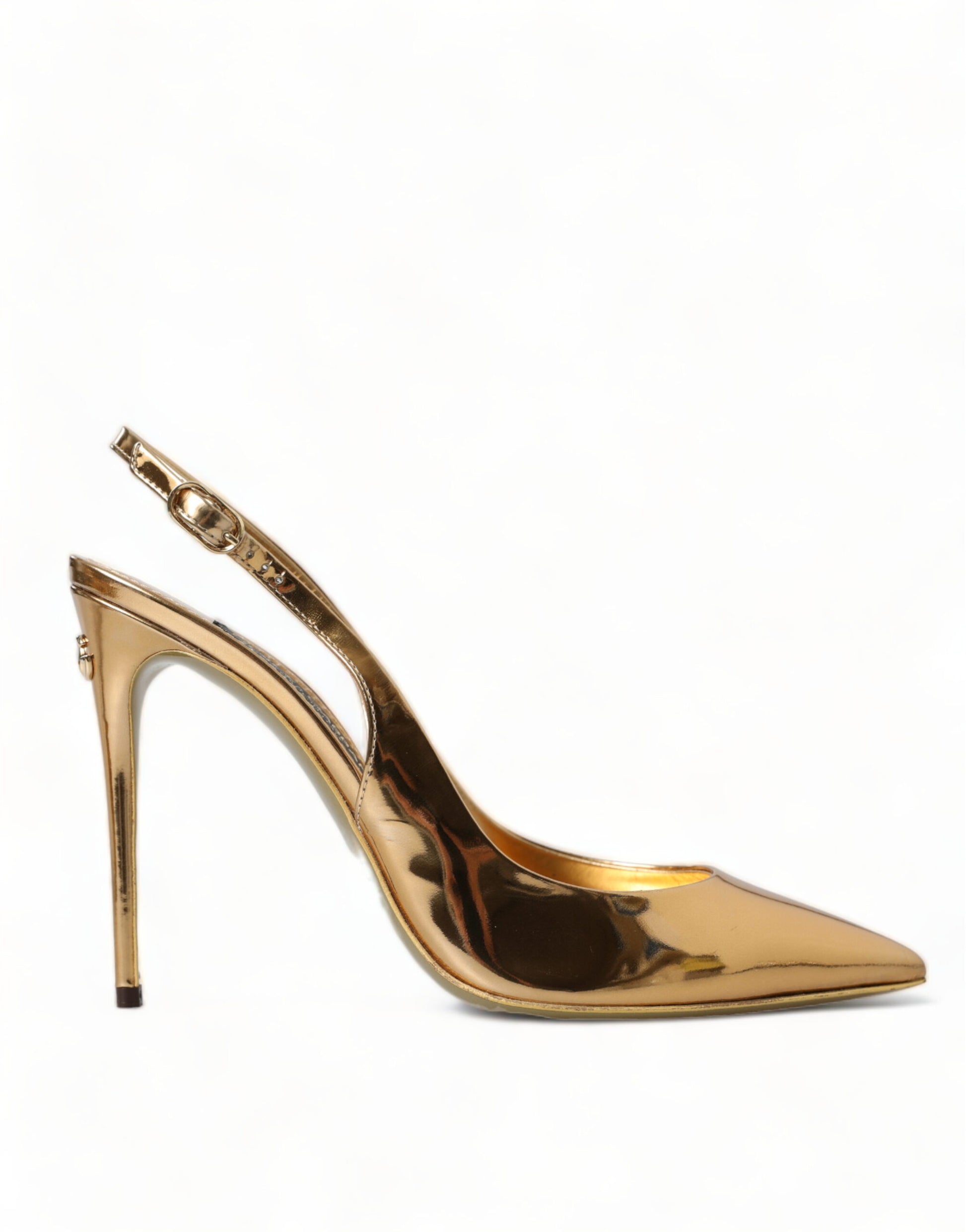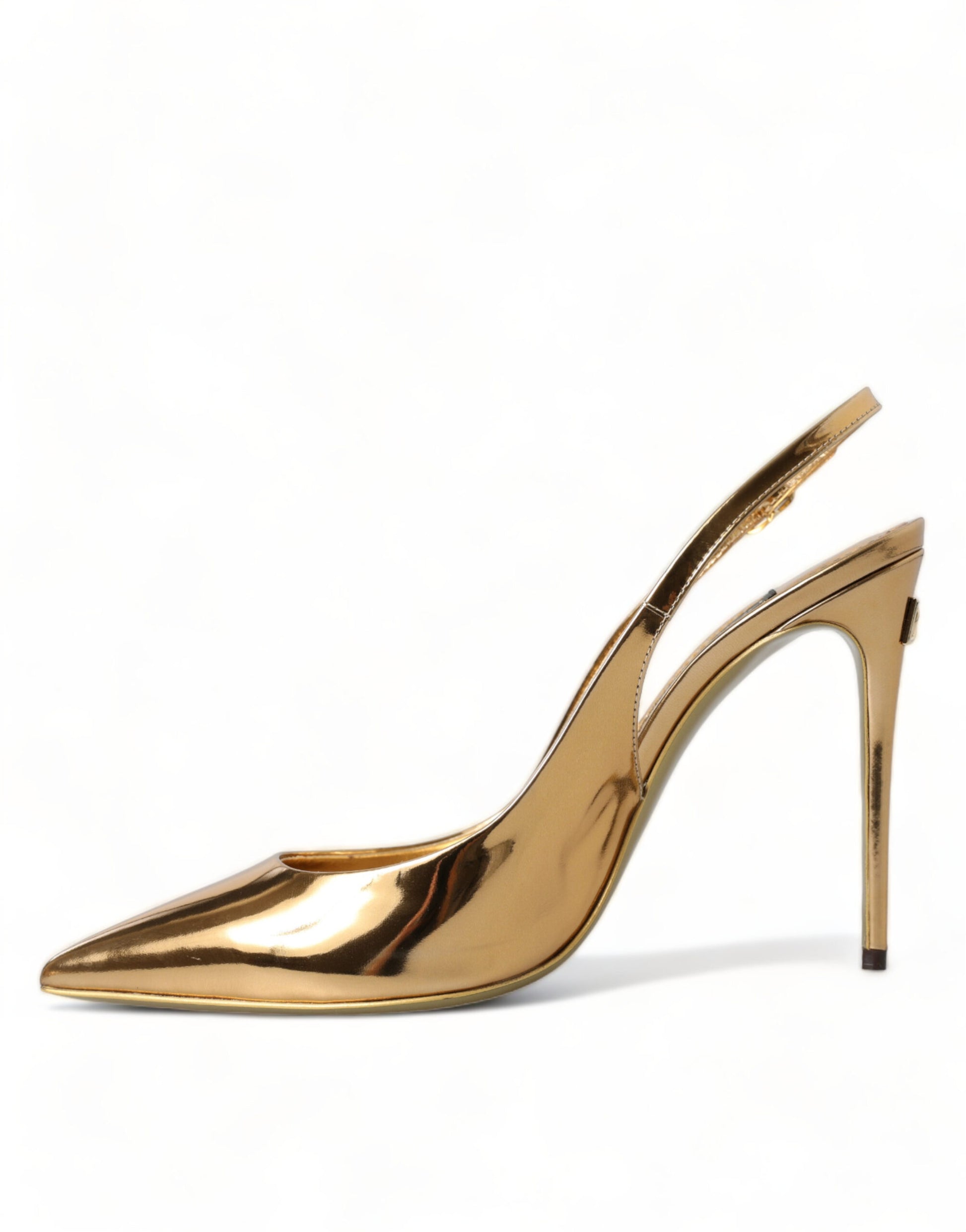 Step into sophistication with these stunning slingback heels from Dolce & Gabbana. Crafted from lustrous gold-tone leather, these pumps elevate any ensemble instantly. Made in Italy, they embody luxury with their sleek stiletto heels and classic logo detailing, promising both high quality and comfort for your most elegant occasions.