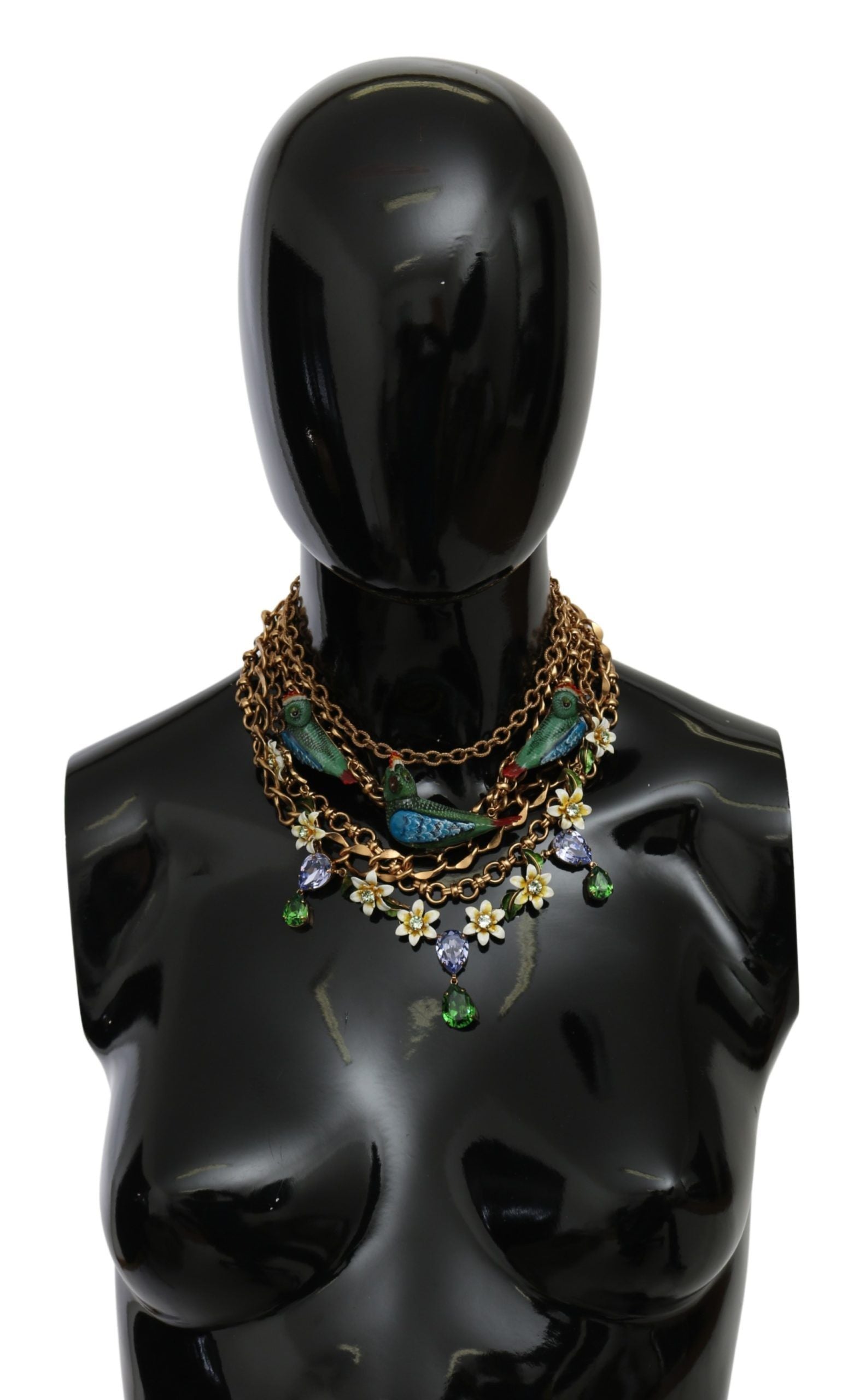 Indulge in the elegance of Dolce & Gabbana with this stunning gold-plated brass necklace, accentuated by sparkling crystals. A luxurious statement piece, it features charming flowers and parrot charms for a touch of playful sophistication. Crafted with care in Italy, this necklace is a testament to artisanal craftsmanship and the brand’s attention to detail. Elevate your jewelry collection with this exclusive and rare necklace, complete with a secure lobster clasp closure and iconic logo details. A treasure to behold and a spectacle to wear, perfect for those who covet exceptional accessories.