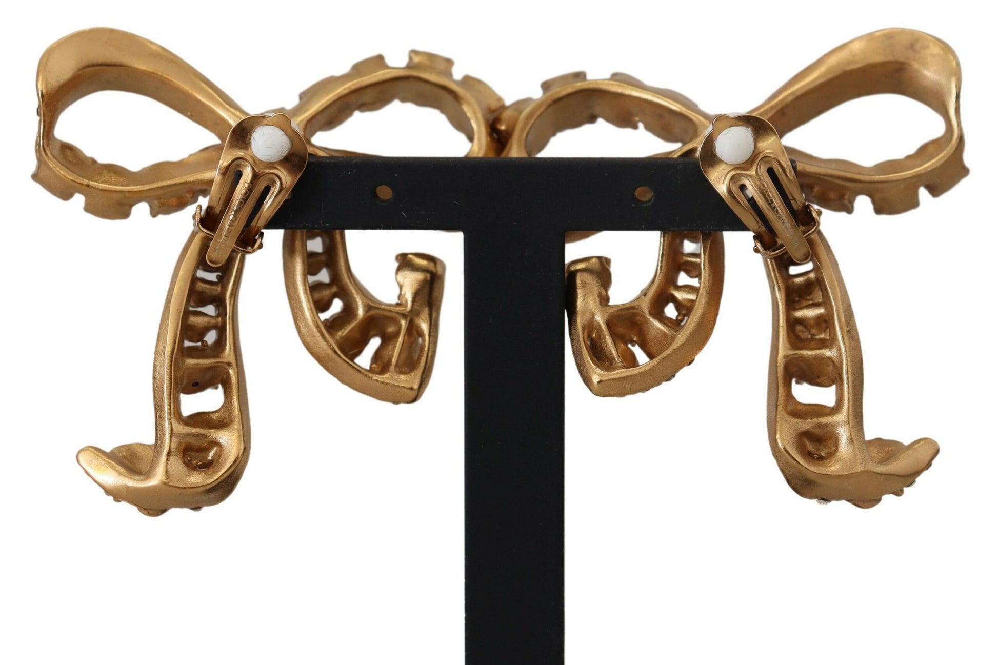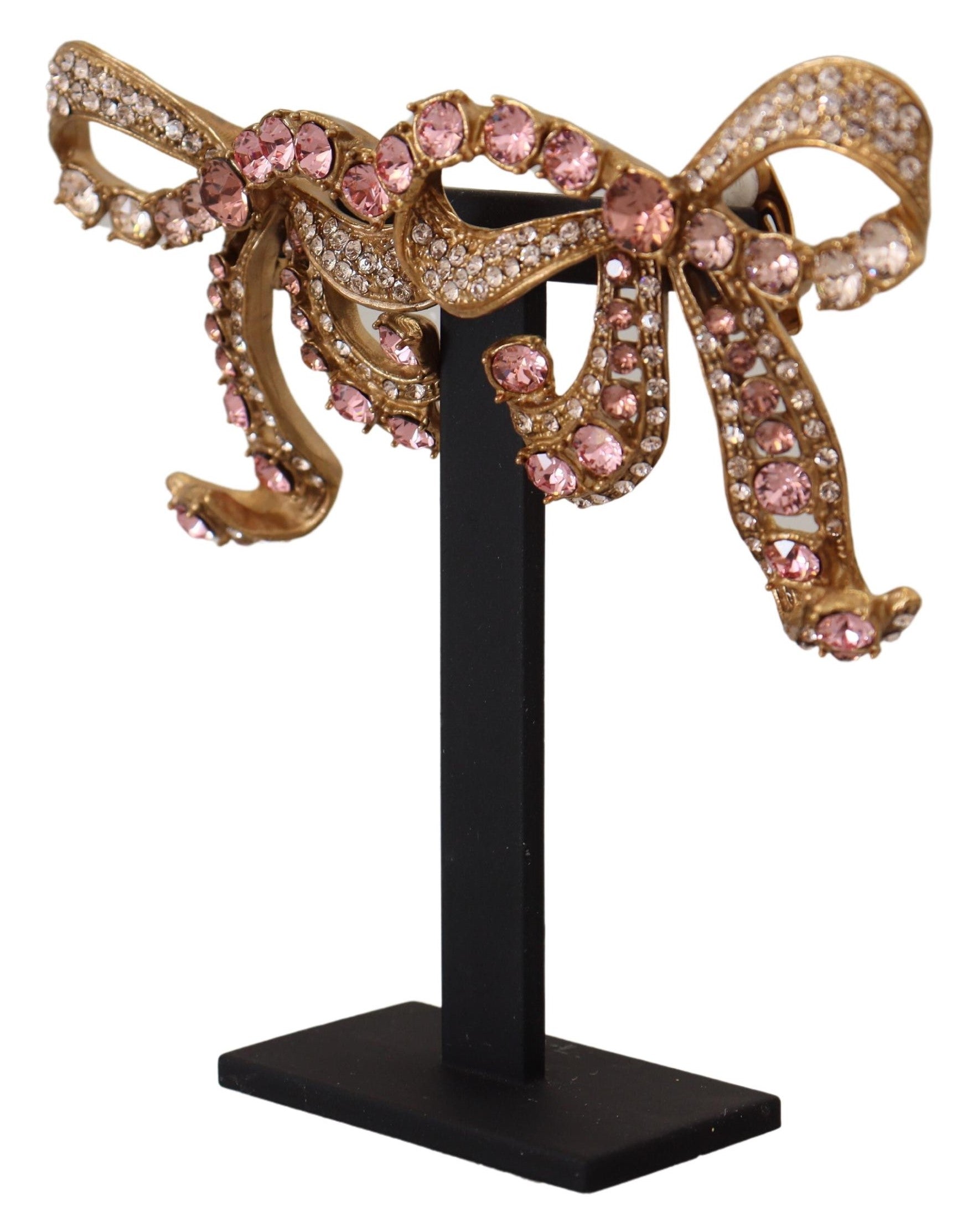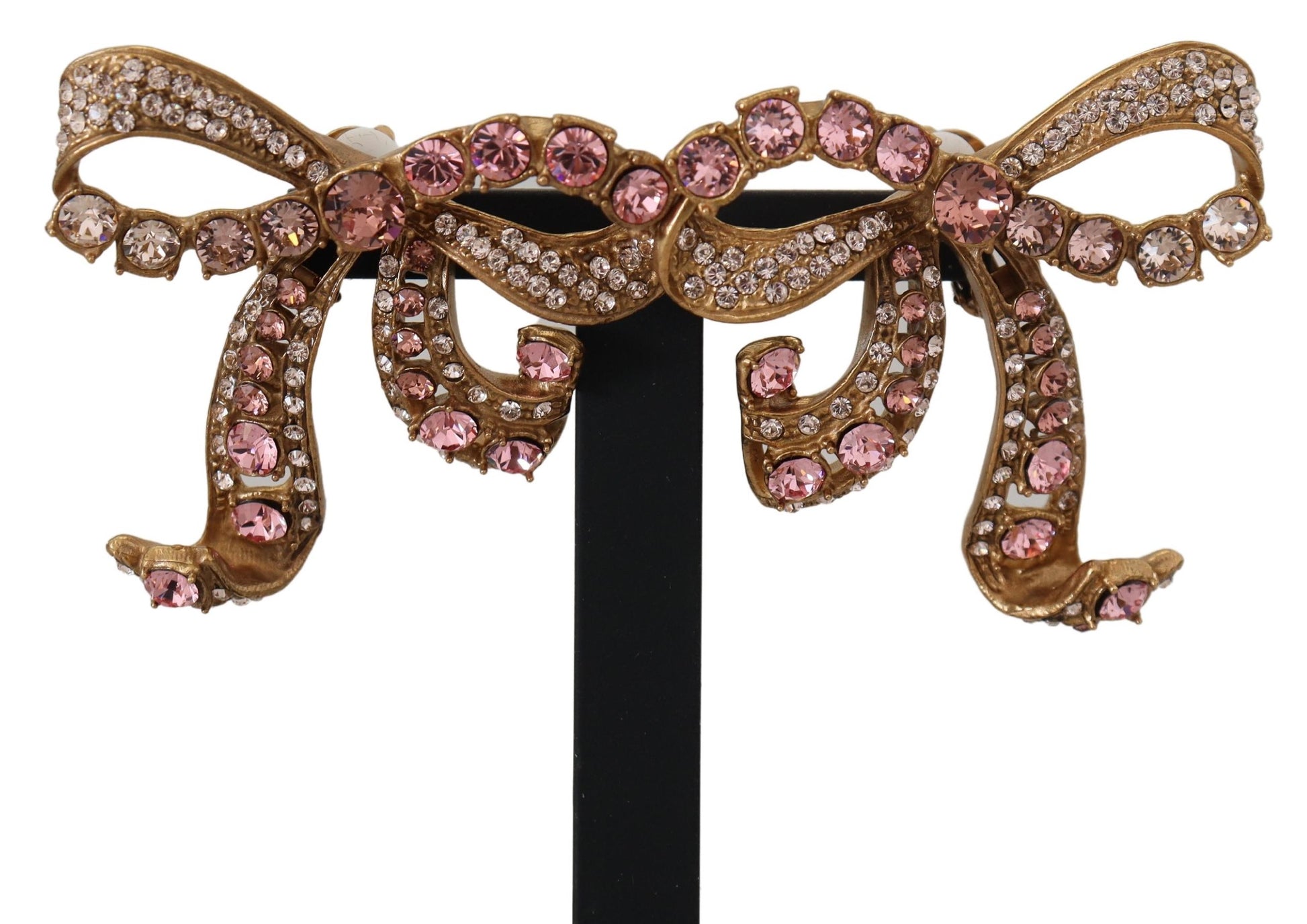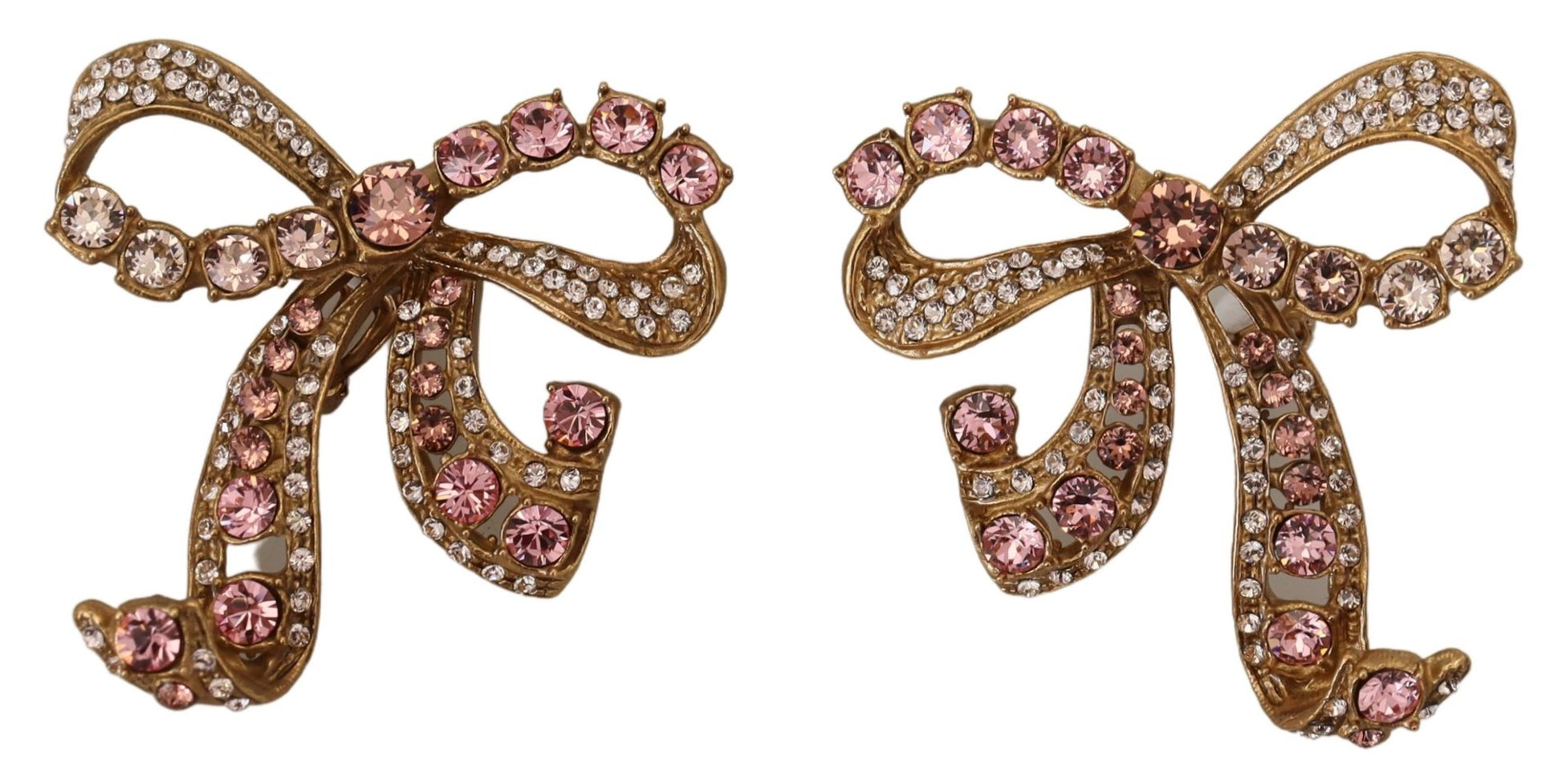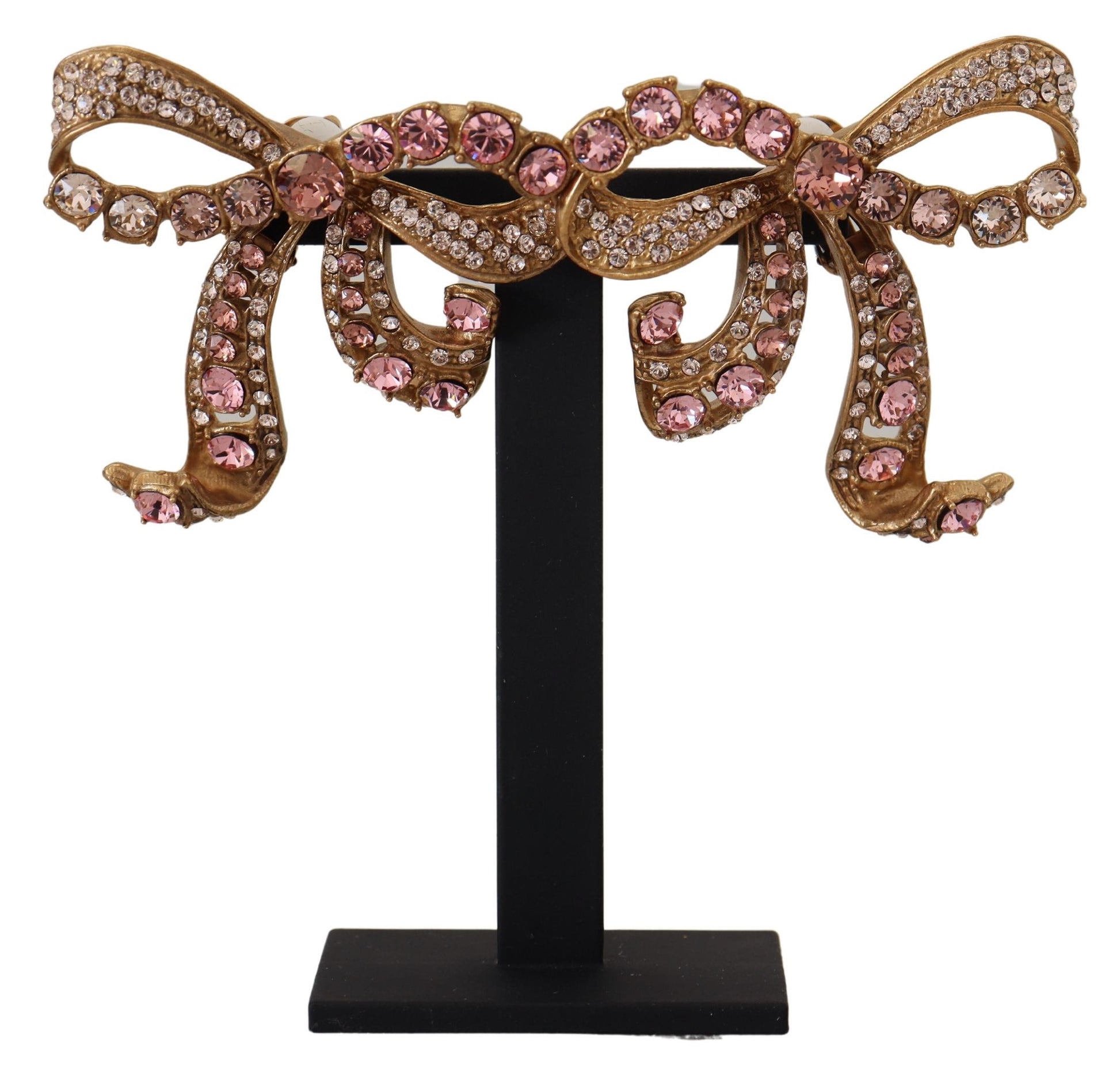 Discover the epitome of elegance with these stunning clip-on earrings by Dolce & Gabbana. Featuring a delicate bow motif, these pieces are meticulously crafted combining 70% brass and 30% glass to create an accessory that spells luxury. Gracefully adorned with pink and clear crystals, they catch the light to add a sophisticated sparkle to any ensemble. Made in Italy, these earrings exude the brand’s renowned craftsmanship and attention to detail, making them a perfect choice for those who appreciate high-fashion flair.