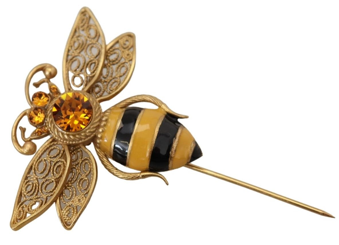Adorn your ensemble with a touch of elegance from Dolce & Gabbana. This exquisite gold-plated brass brooch shaped like a bee is a stunning accessory that adds a sparkle of sophistication to any outfit. Crafted in Italy with meticulous attention to detail, it features shimmering crystals that catch the light beautifully. The iconic logo detail ensures authenticity and luxury appeal, making this piece a perfect gift or a treasured addition to your collection.