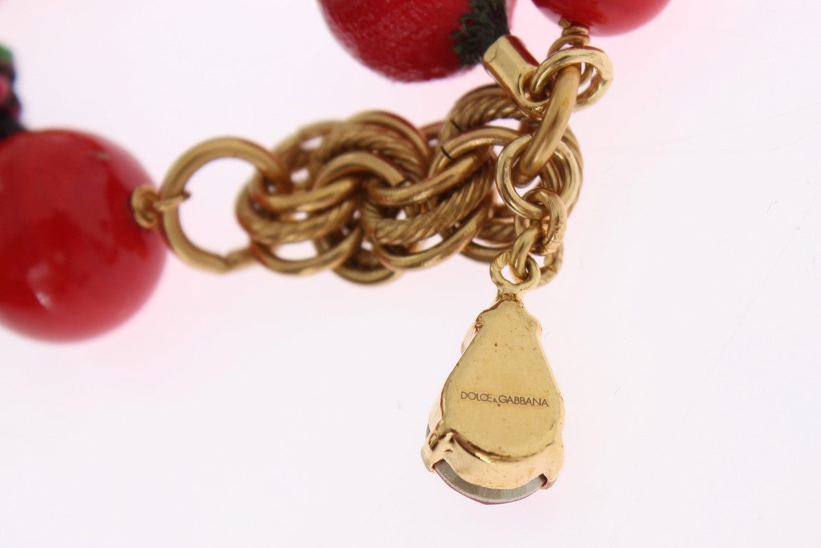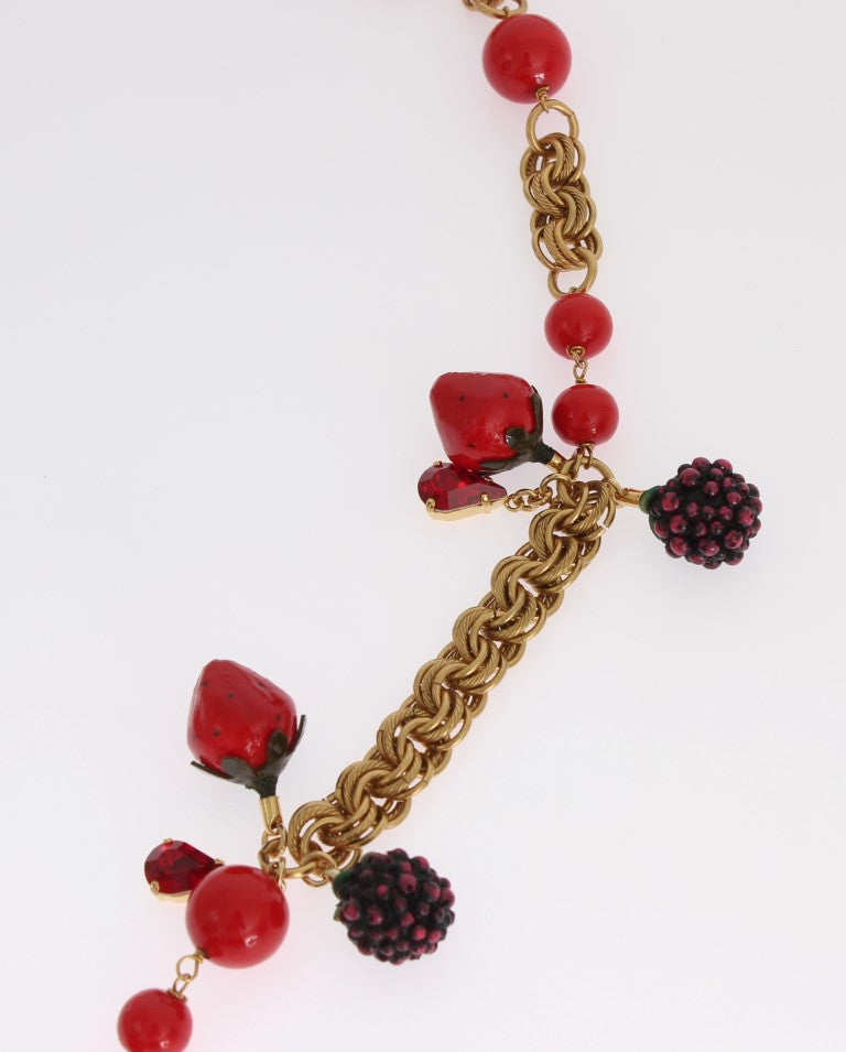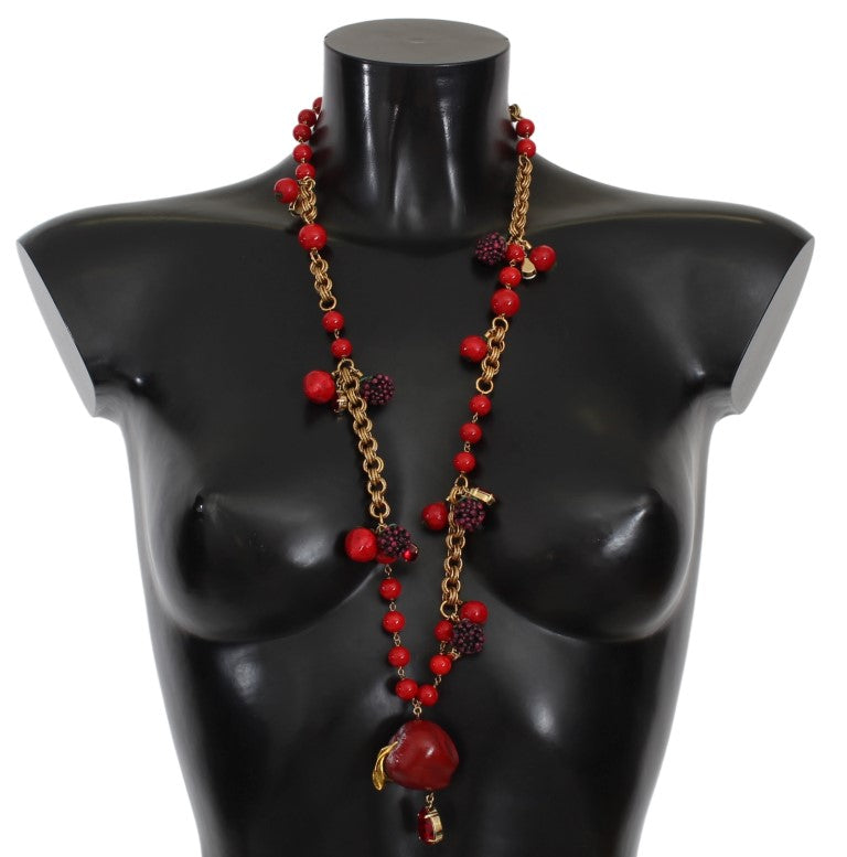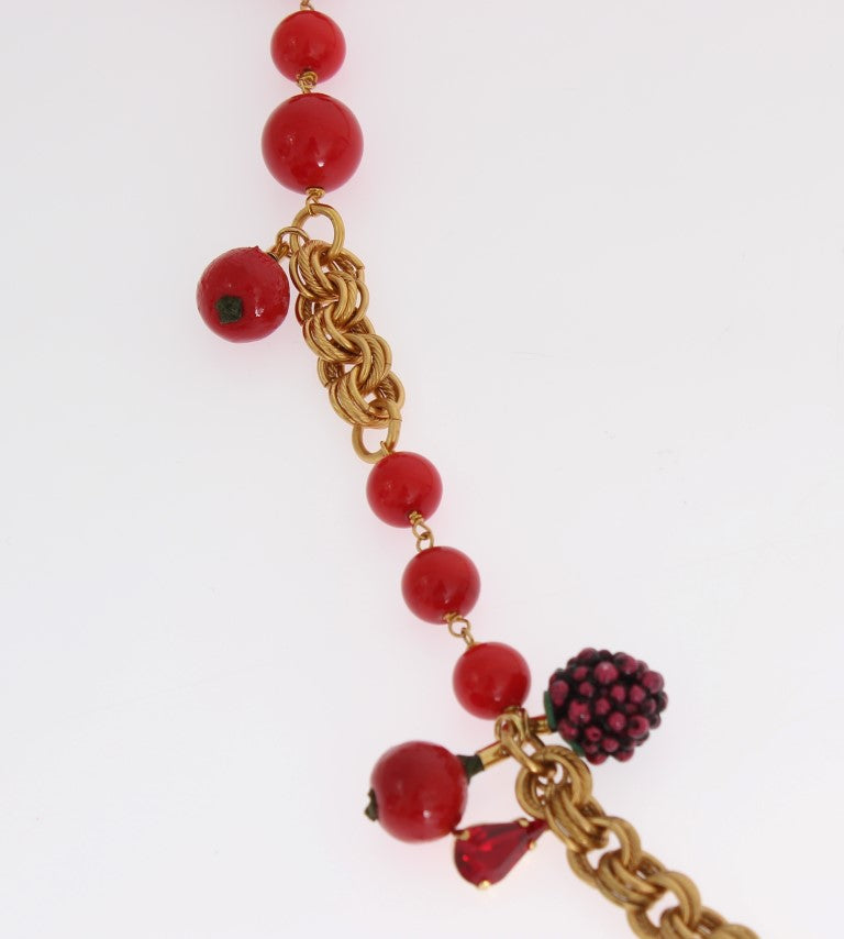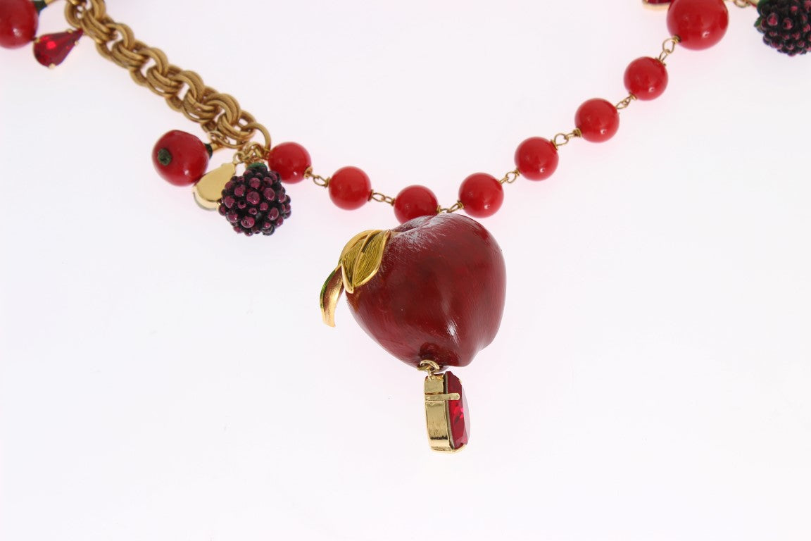 Exquisite craftsmanship meets whimsical charm with this luxurious Dolce & Gabbana necklace, featuring a delightful array of Sicilian fruit motifs and sparkling crystals. A bold and playful piece that promises to elevate your ensemble with an opulent touch of the Mediterranean.