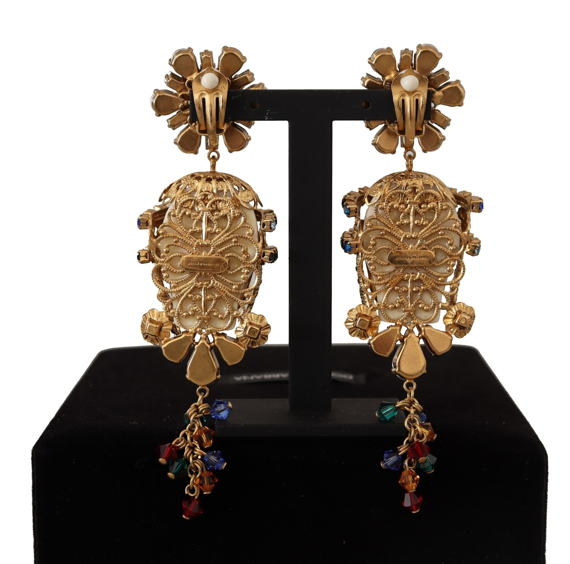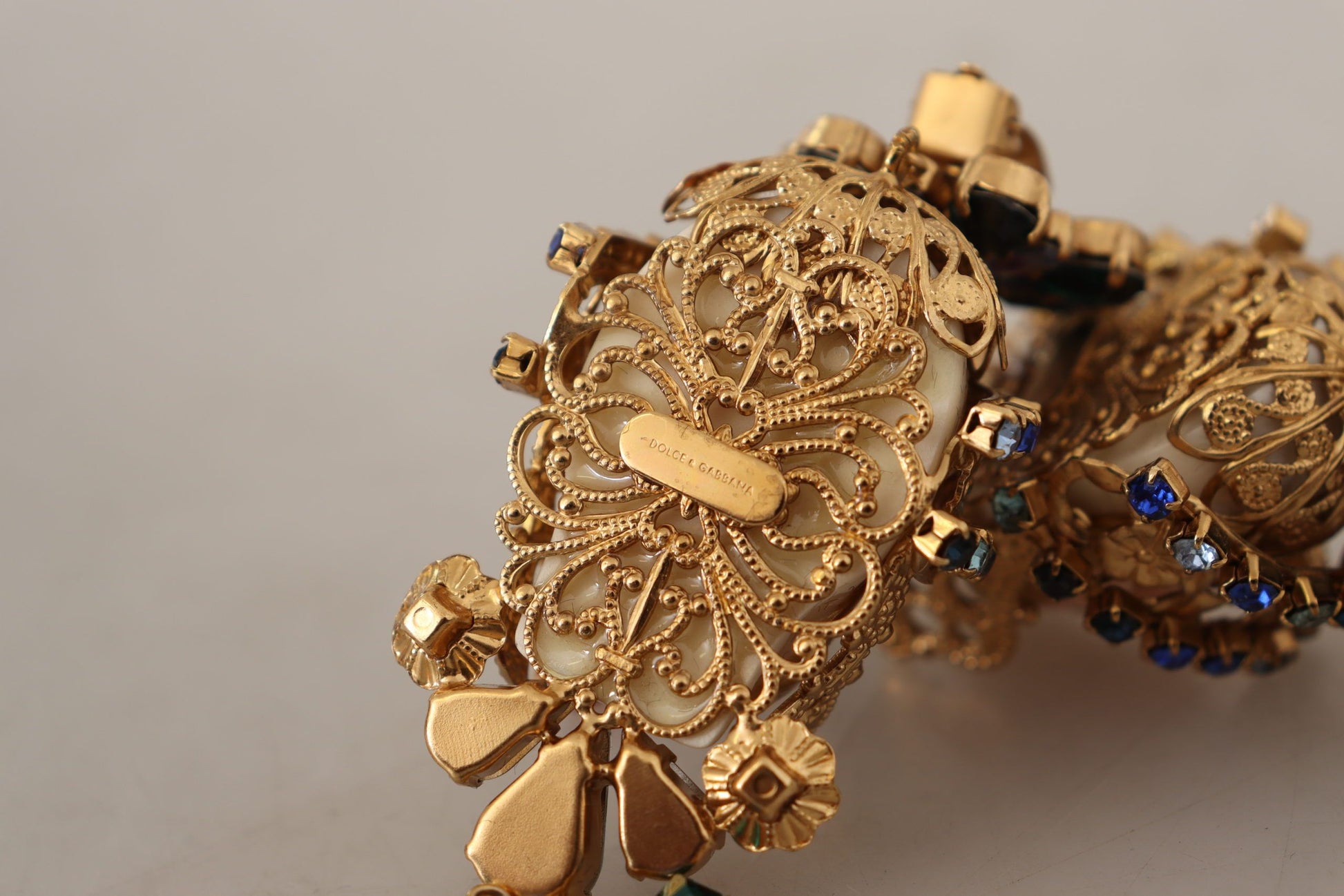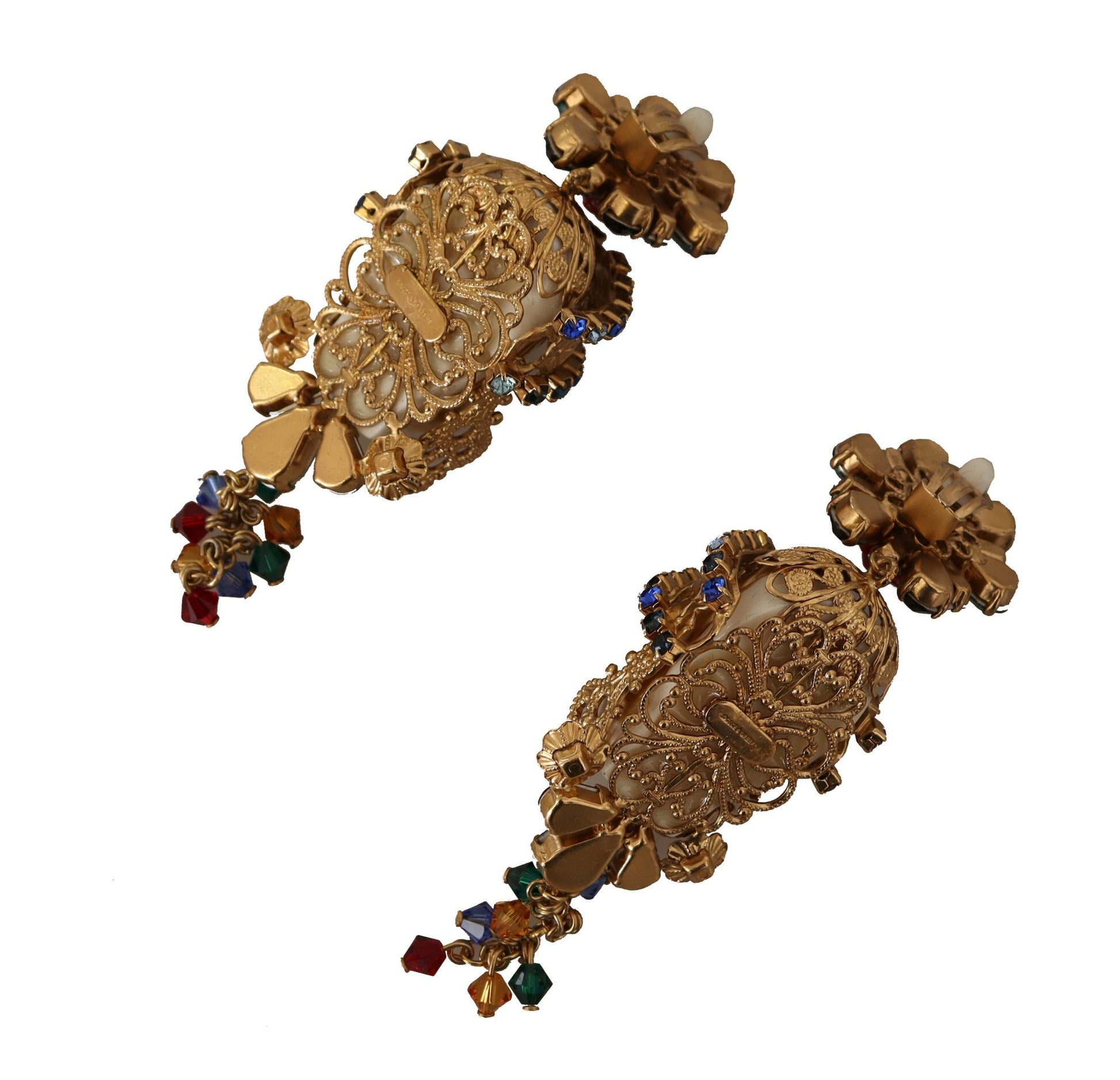Illuminate your ensemble with a touch of Italian elegance by Dolce & Gabbana. These striking clip-on earrings make a dazzling statement with their Pupi Doll motif and a cascade of multicolored crystals set against a luxurious gold hue. Designed for distinctive tastes, they instantly add glamour to any outfit. Perfect for a sophisticated evening or a standout casual look.