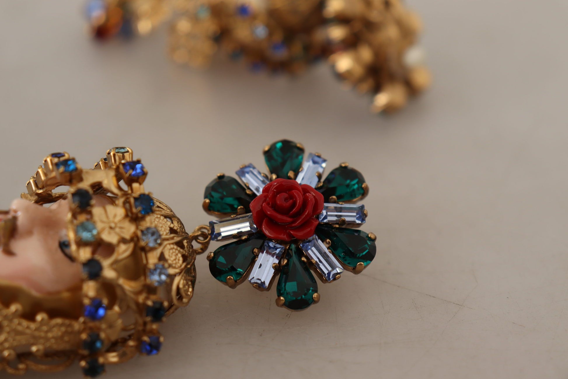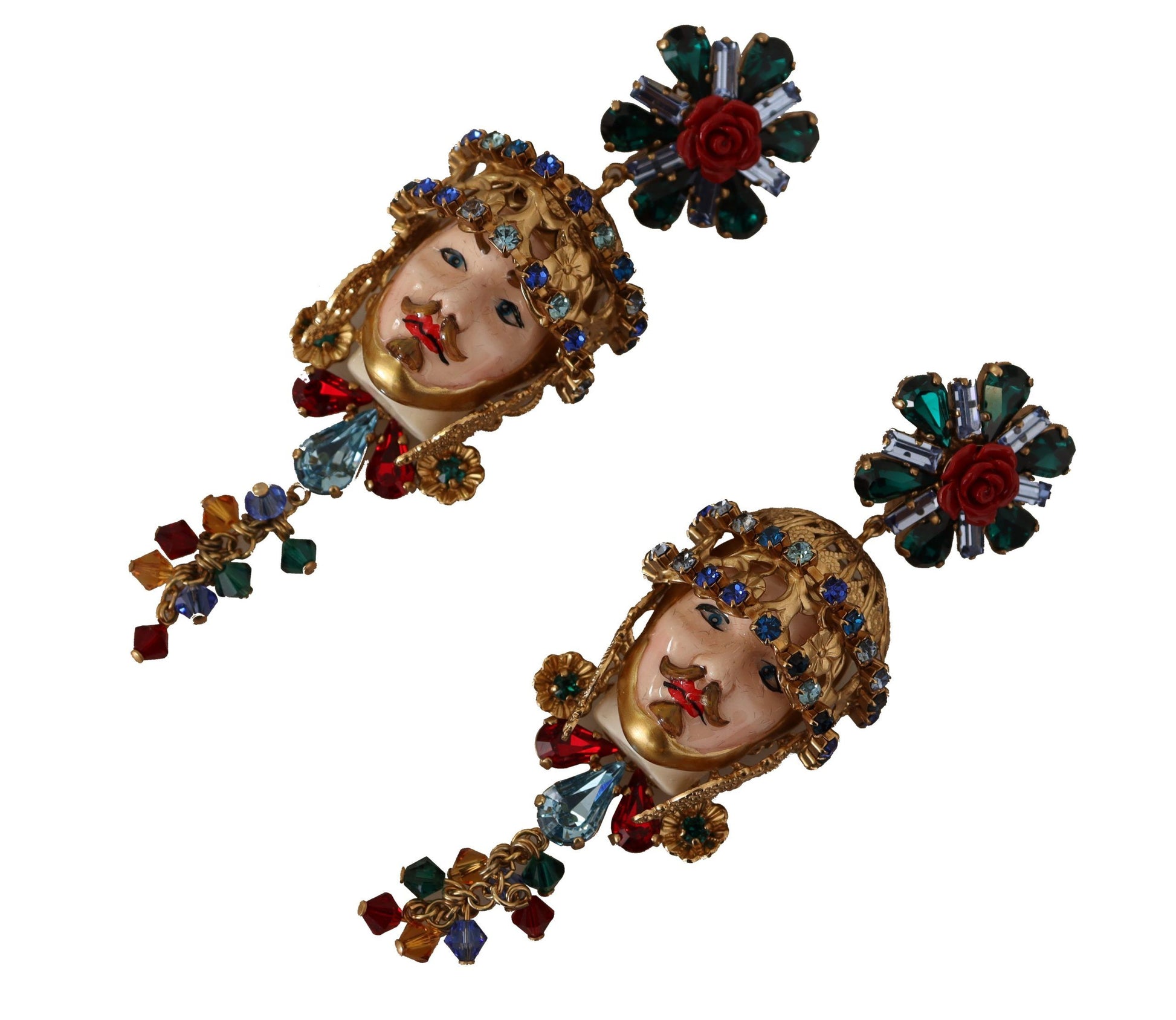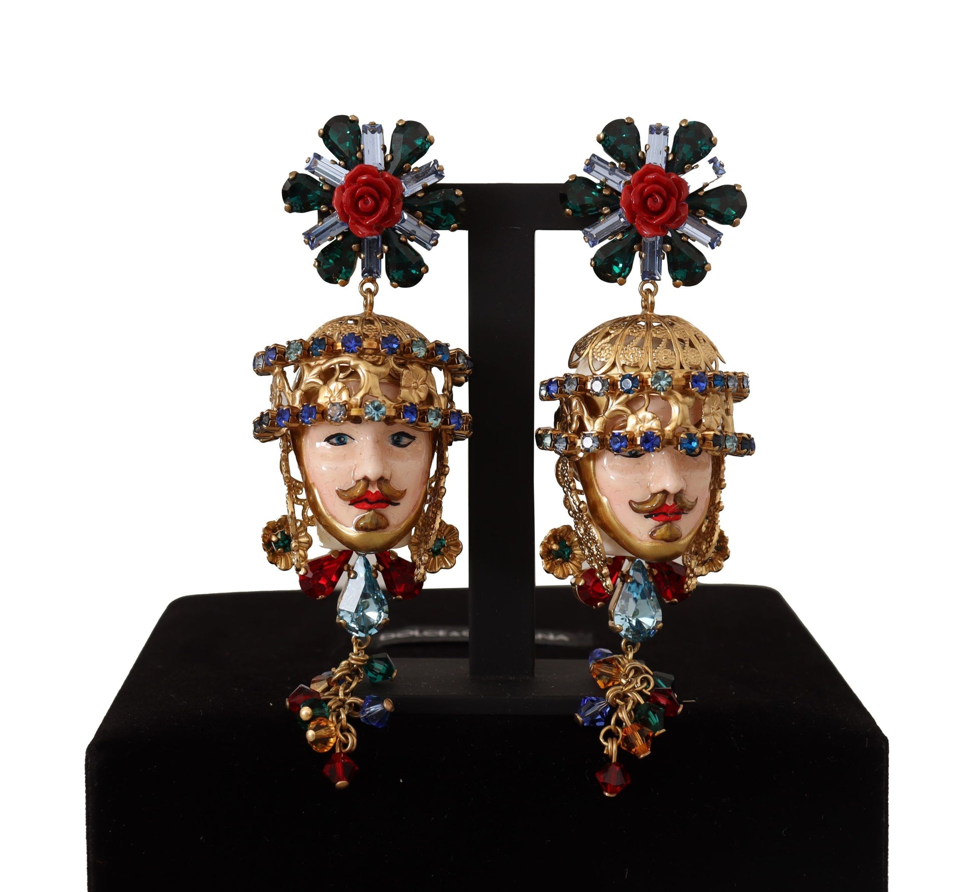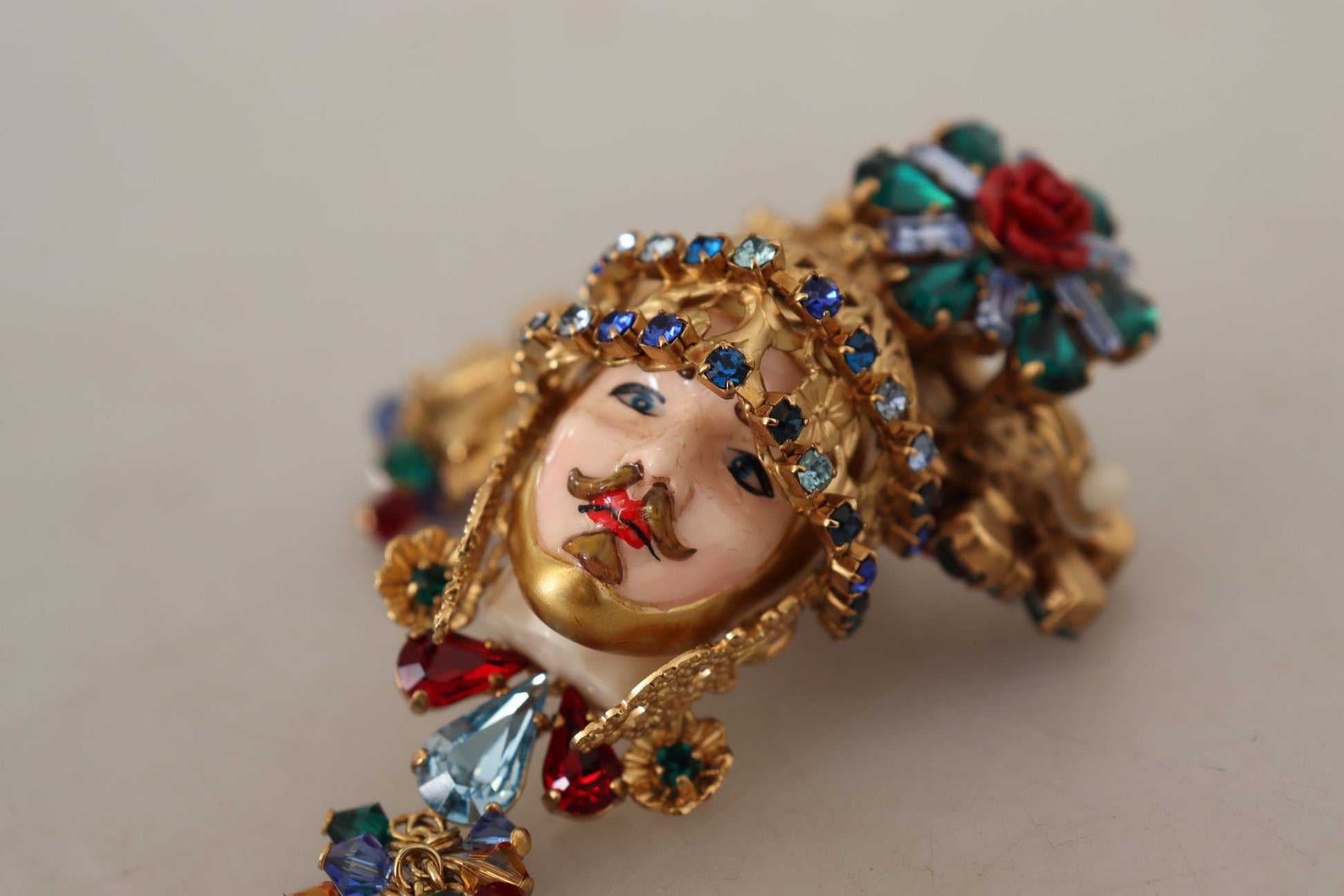 Illuminate your ensemble with a touch of Italian elegance by Dolce & Gabbana. These striking clip-on earrings make a dazzling statement with their Pupi Doll motif and a cascade of multicolored crystals set against a luxurious gold hue. Designed for distinctive tastes, they instantly add glamour to any outfit. Perfect for a sophisticated evening or a standout casual look.