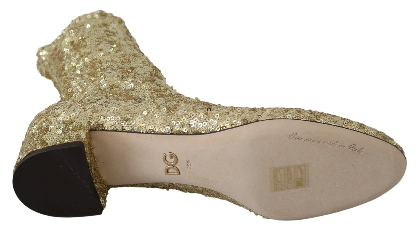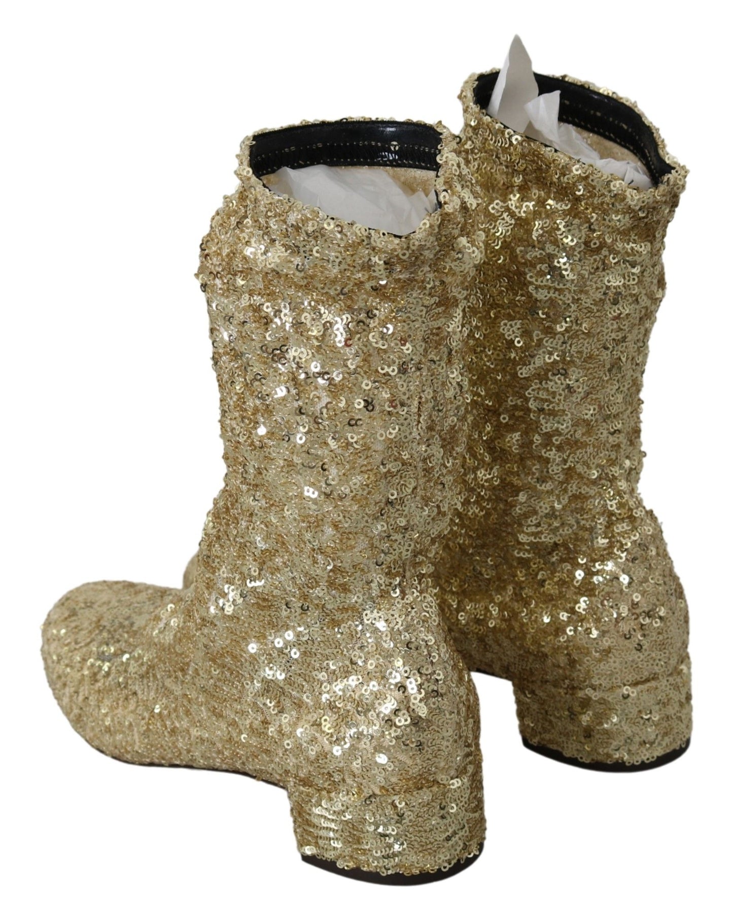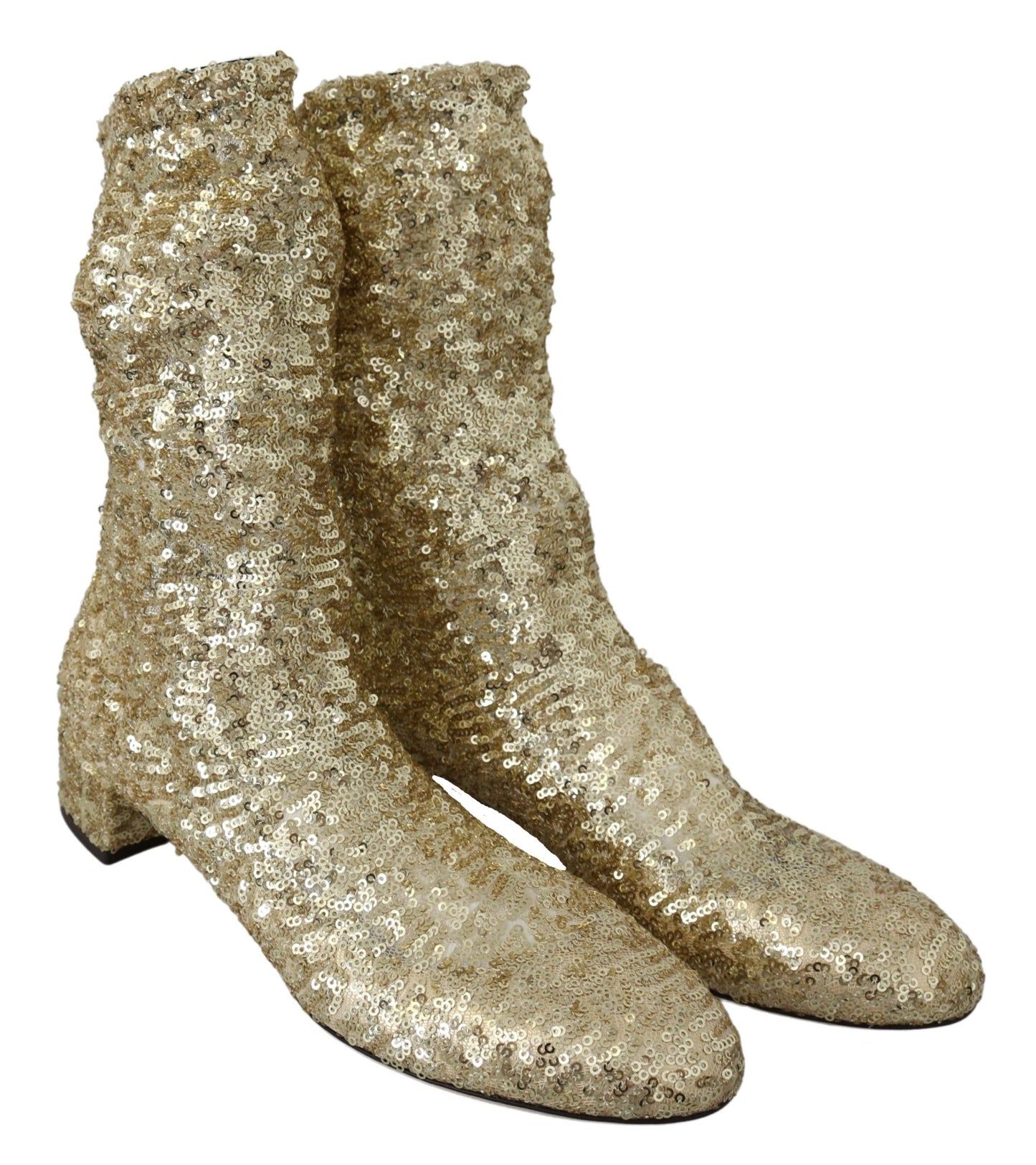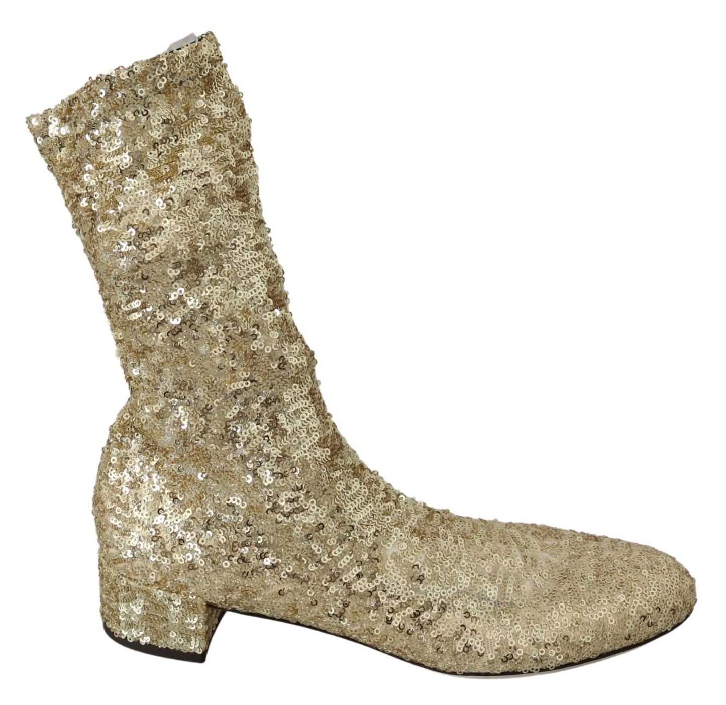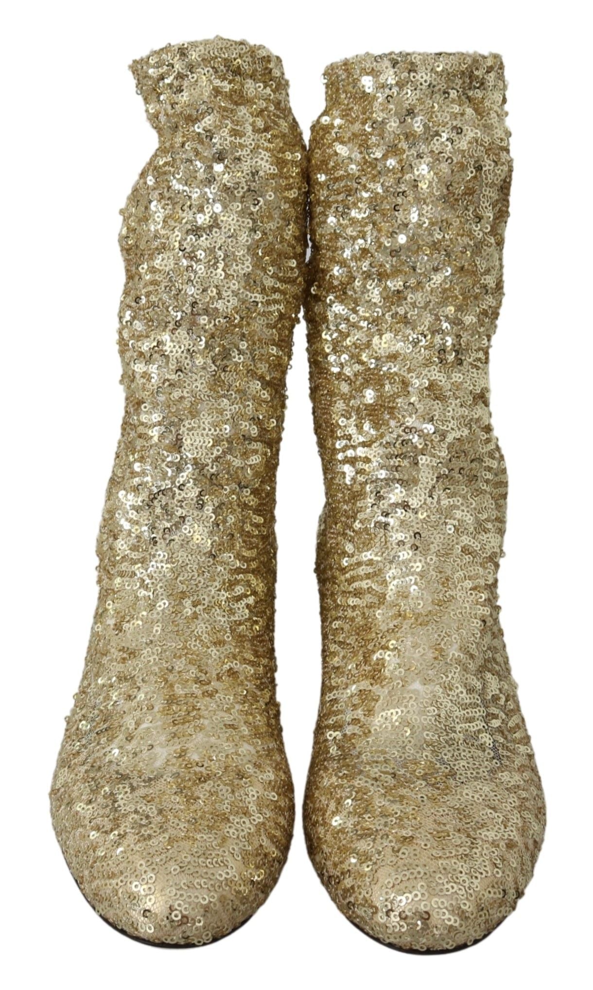 Step into luxury with these stunning Golden Elegance Ankle Boots from iconic fashion house Dolce & Gabbana. Impeccably crafted, these boots feature a dazzling gold hue that will add a glamorous touch to any outfit. Made with high-quality nylon stretch material and a leather sole, these boots offer both supreme comfort and style. Complete with signature logo details, they are a testament to Italian craftsmanship and luxury fashion.
