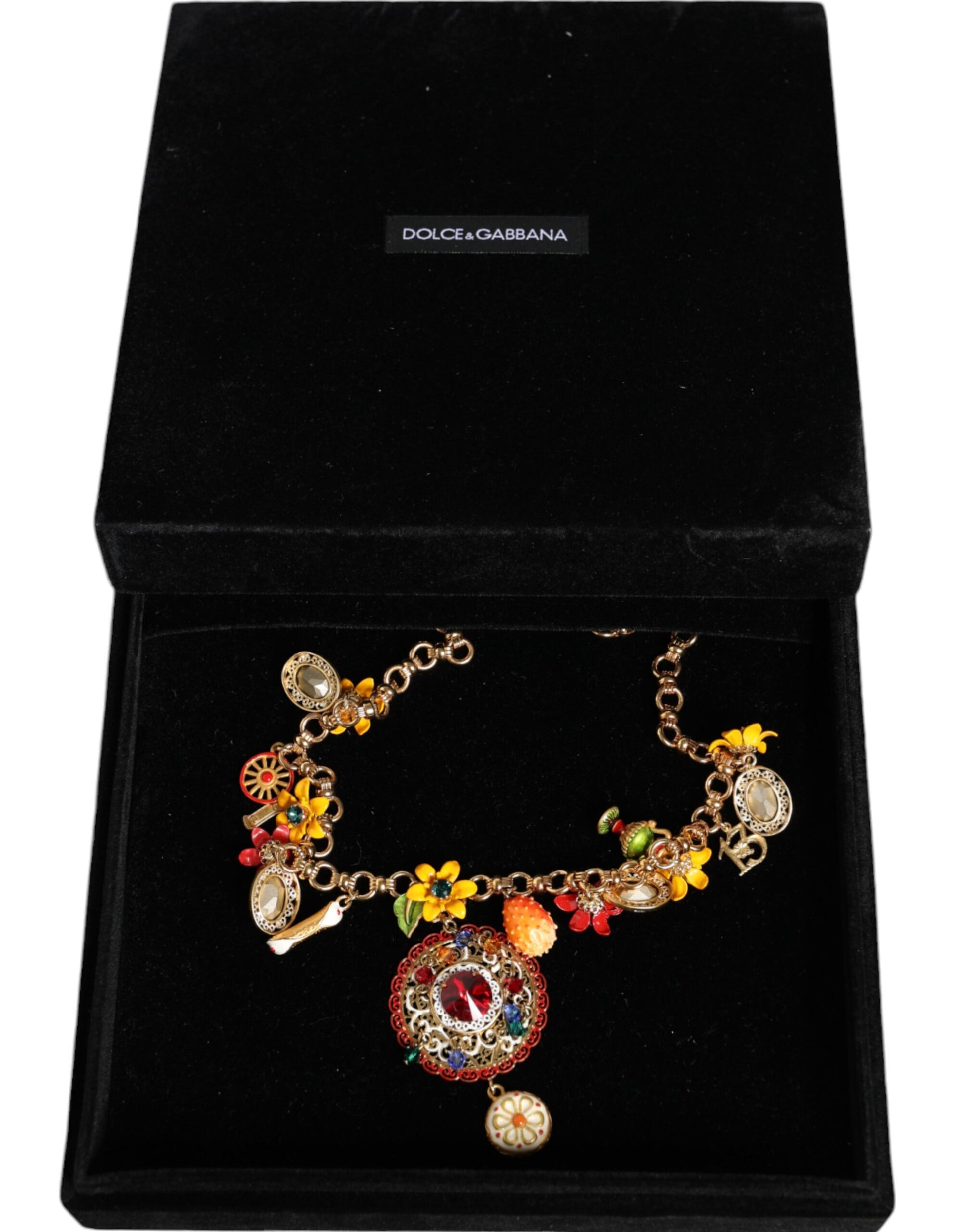 Gorgeous brand new with tags, 100% Authentic Dolce & Gabbana gold-tone metal statement necklace with dangling multicolored rhinestones throughout, small round and teardrop medallions.