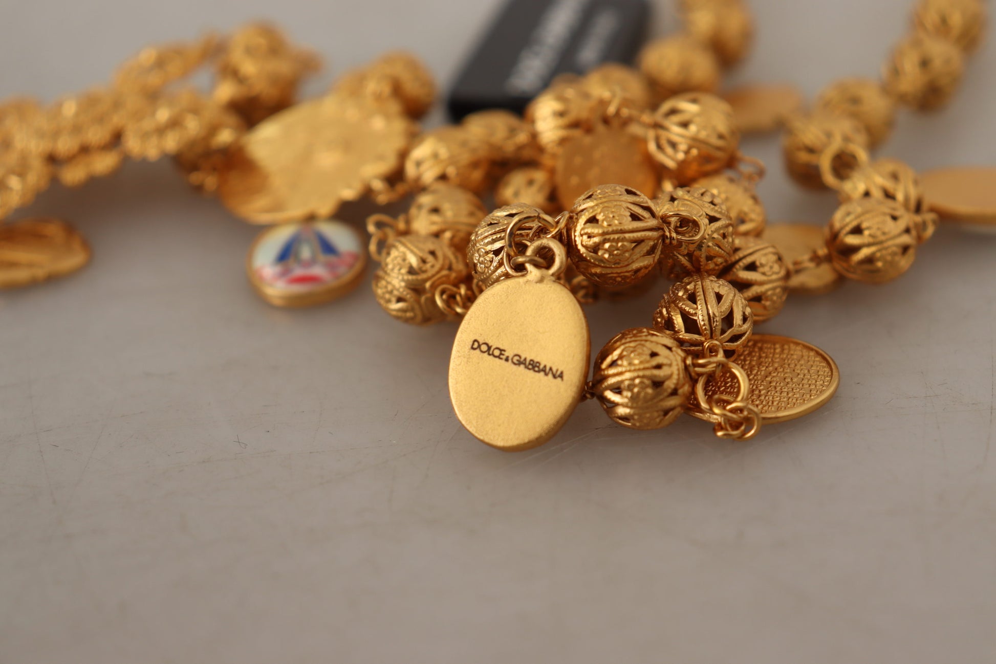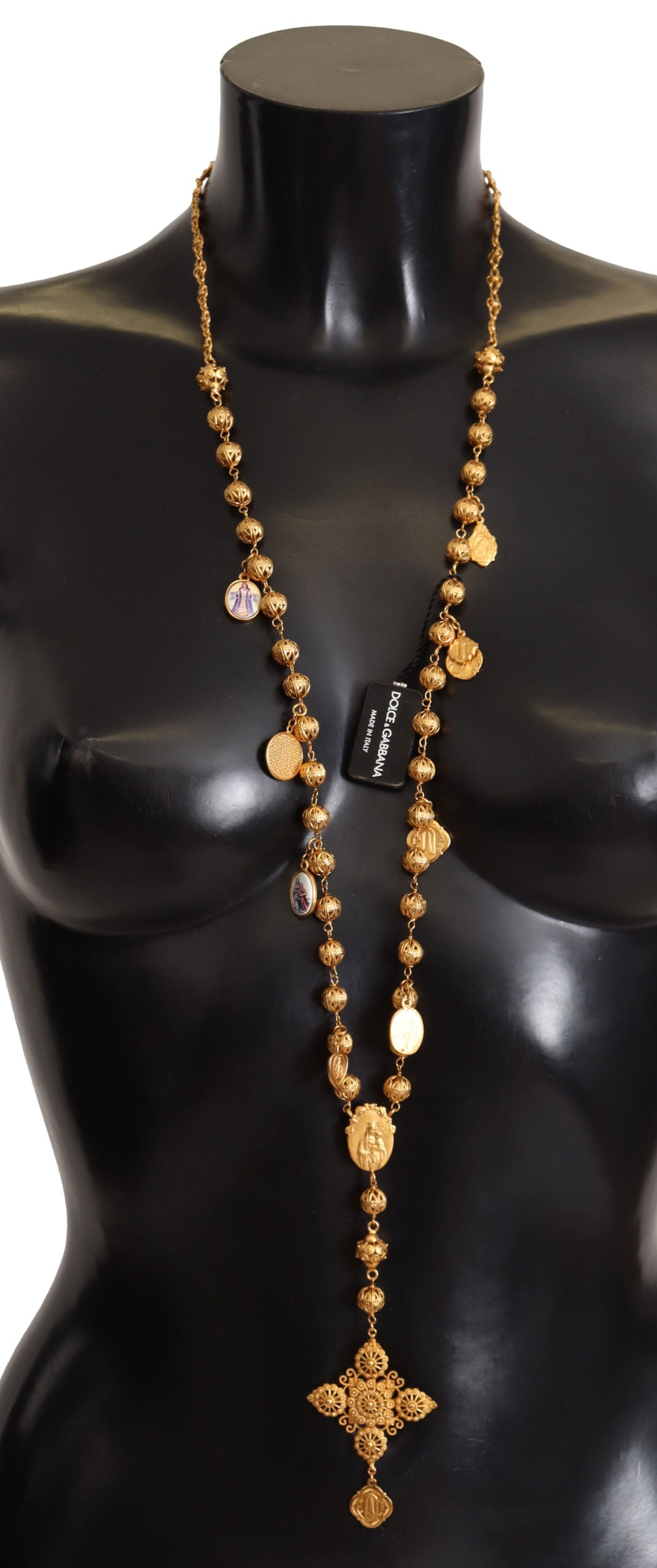 Discover the epitome of luxury and grace with the Dolce & Gabbana gold tone brass charm necklace. This exquisite piece is brand new with tags, ensuring 100% authenticity and pristine condition. It features a captivating cross pendant that dangles regally from a sophisticated chain, manifesting an aura of elegance and faith. Adorned with the iconic logo, this charming necklace was crafted with precision and passion in Italy and is a testament to the brand’s unwavering commitment to luxury. A versatile addition to your jewelry collection, it can elevate any ensemble with its radiant gold color and divine presence.