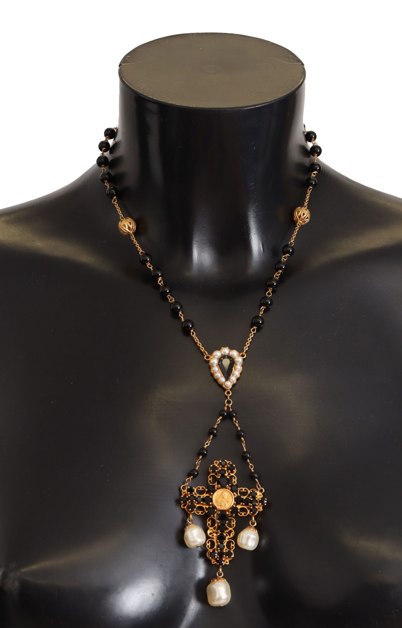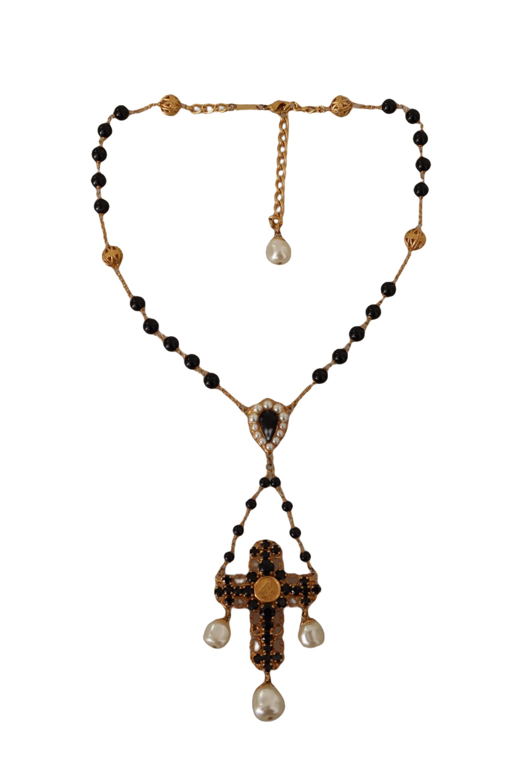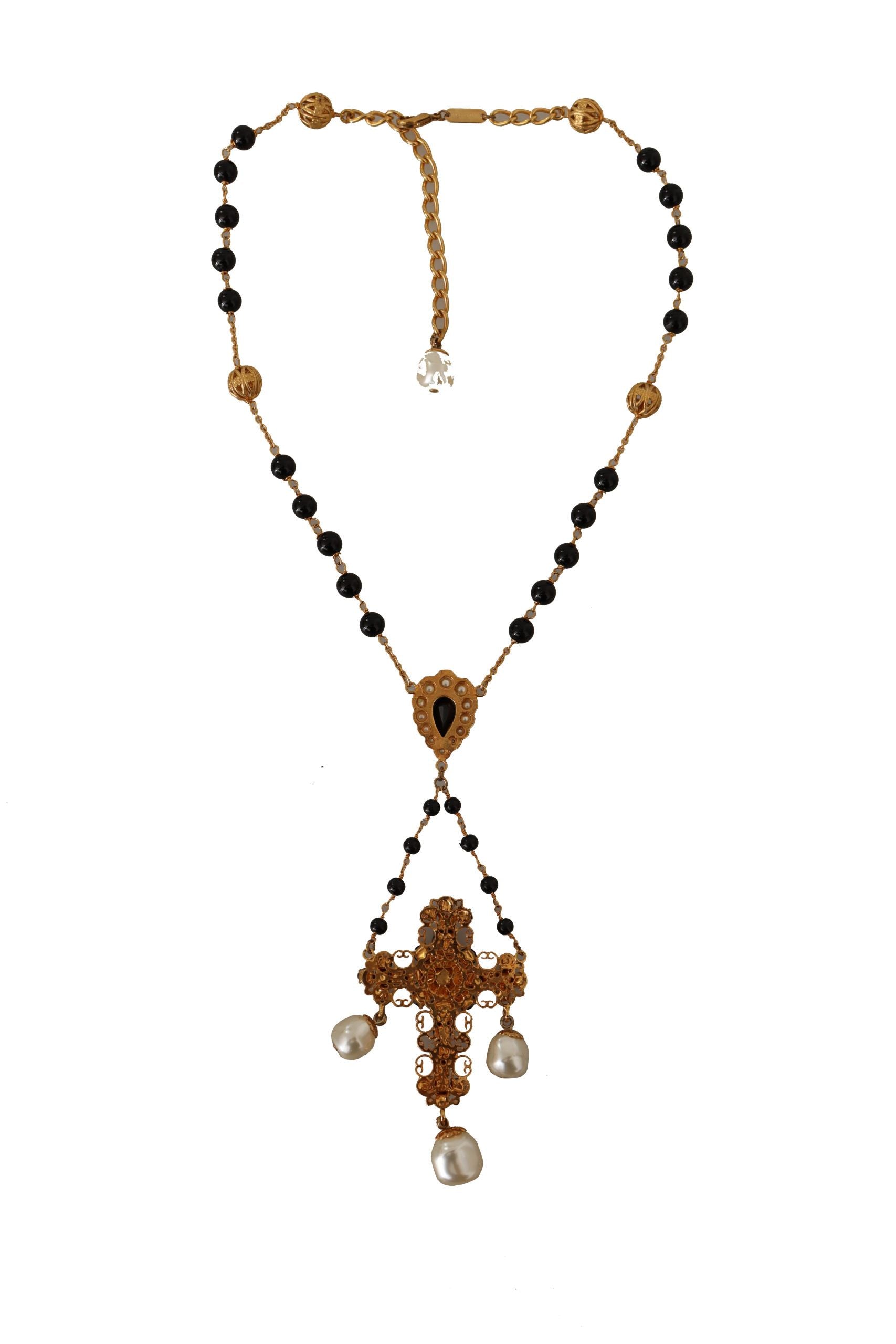 Adorn your neckline with the exquisite allure of this Gorgeous, brand new Charm Cross necklace. A luxurious addition to any ensemble, crafted with sparkling black crystals embedded in a lustrous gold-tone brass setting. This finely made piece by Dolce & Gabbana brings an aura of sophistication to your jewelry collection. It fastens securely with a lobster clasp, ensuring both comfort and style. Proudly made in Italy, this necklace exudes the elegance and craftsmanship synonymous with the Dolce & Gabbana brand.