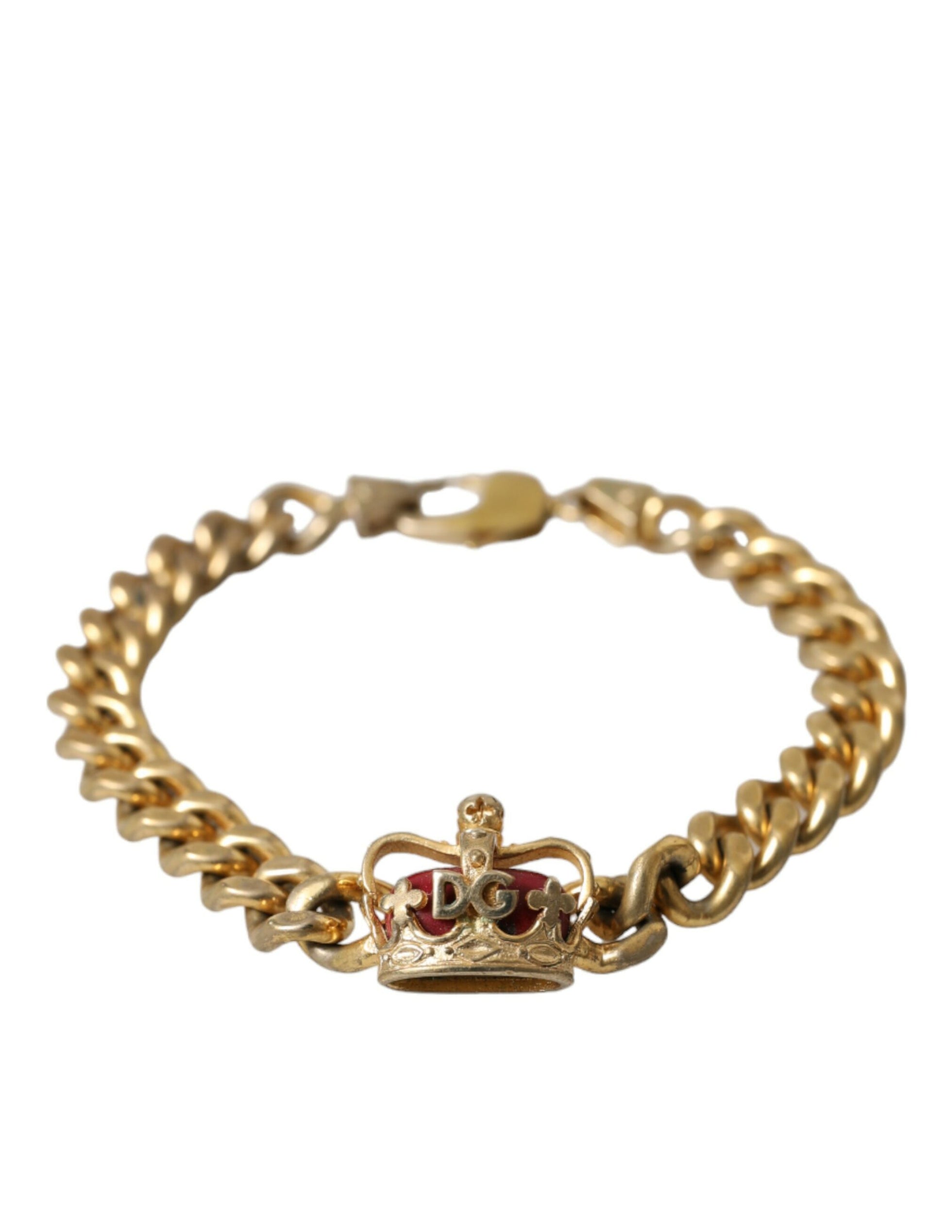 Indulge in the elegance of this exquisite Dolce & Gabbana curb chain bracelet, crafted in lustrous gold-tone brass and highlighted with a striking enamel accent in vivid red. This luxurious piece embodies sophistication with its bold graphic hardware and a secure lanyard clasp fastening. A perfect fusion of fashion-forward design and traditional Italian craftsmanship, it’s sure to add a dash of glamour to any outfit.