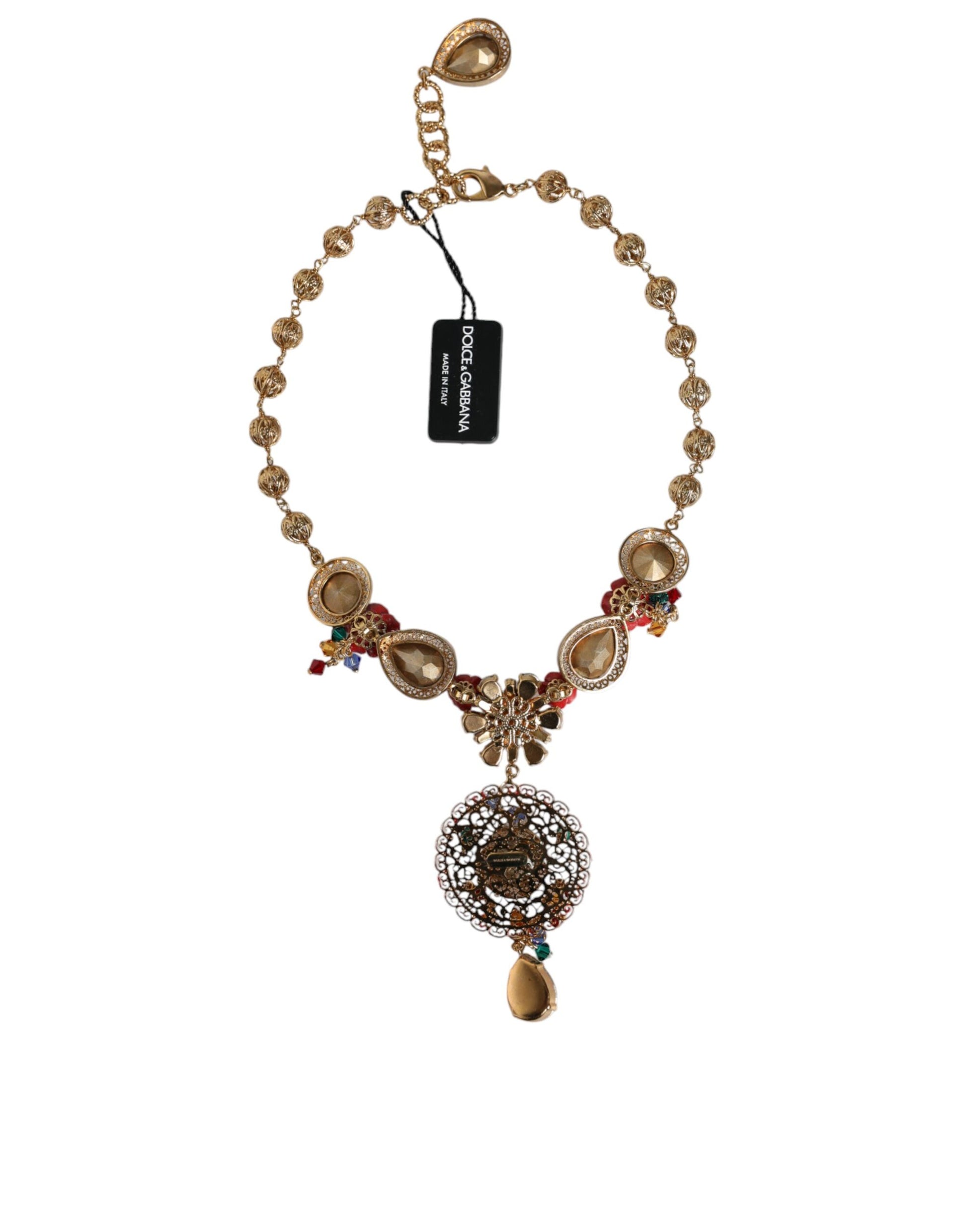 Gorgeous brand new with tags, 100% Authentic Dolce & Gabbana gold-tone metal statement necklace with gold-tone mini globes, dangling multicolored rhinestones throughout, small round and teardrop medallions.