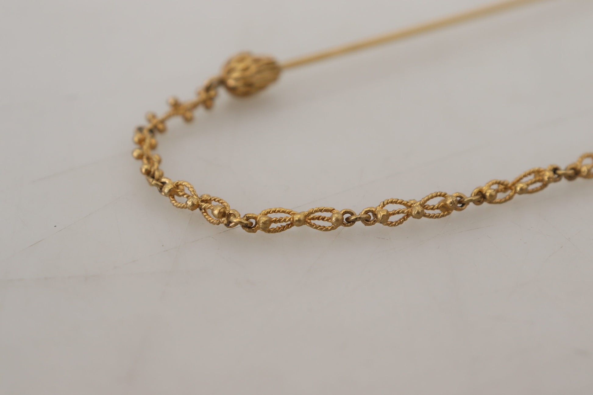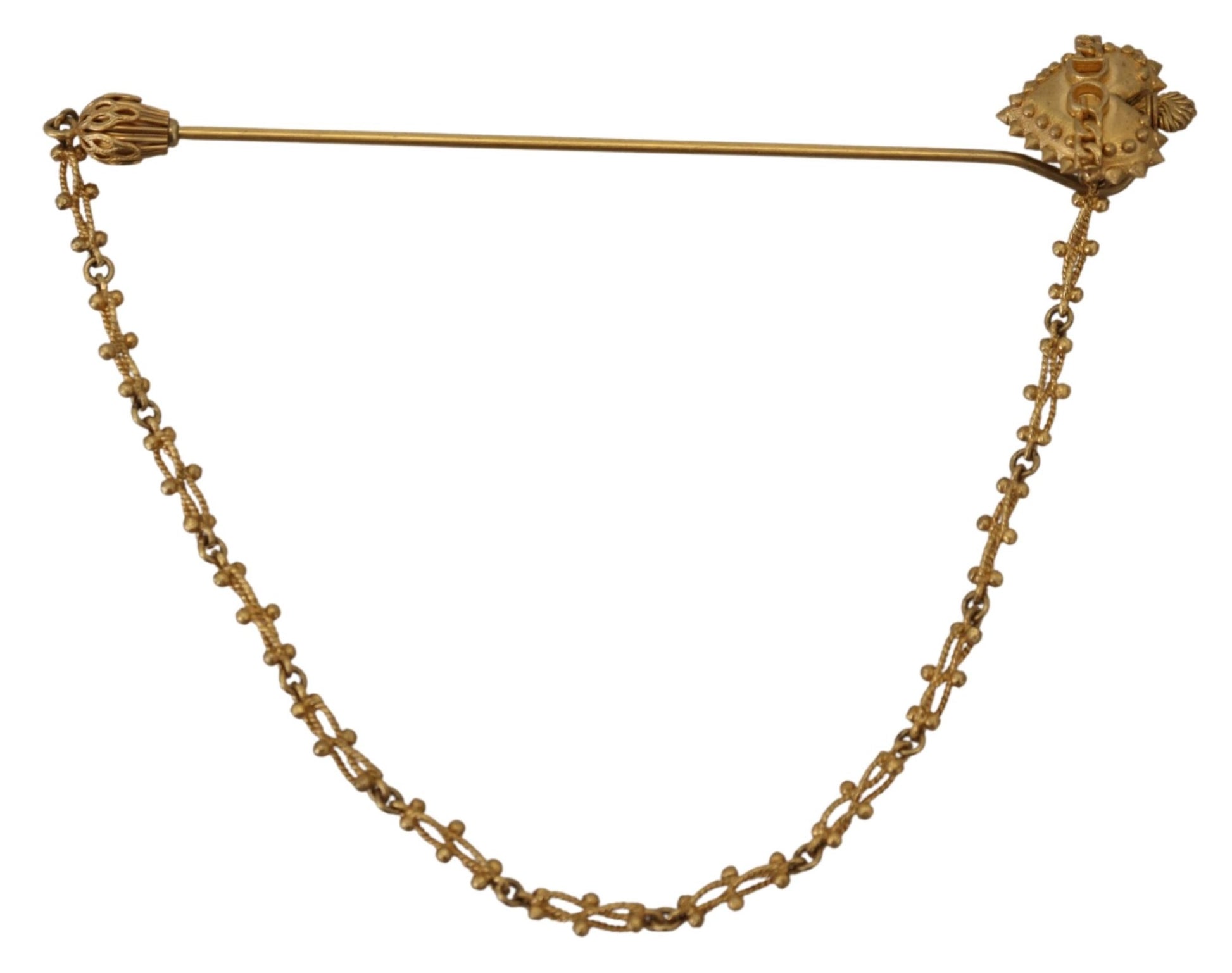 Discover the epitome of elegance with this magnificent gold tone brooch pin from the renowned designer Dolce & Gabbana. A luxurious addition to your accessory collection, this beautiful piece boasts intricate details that reflect your exquisite taste. Perfect for adding a touch of glamour to any outfit, it comes brand new with tags and in its original box, ensuring its authenticity and pristine condition.