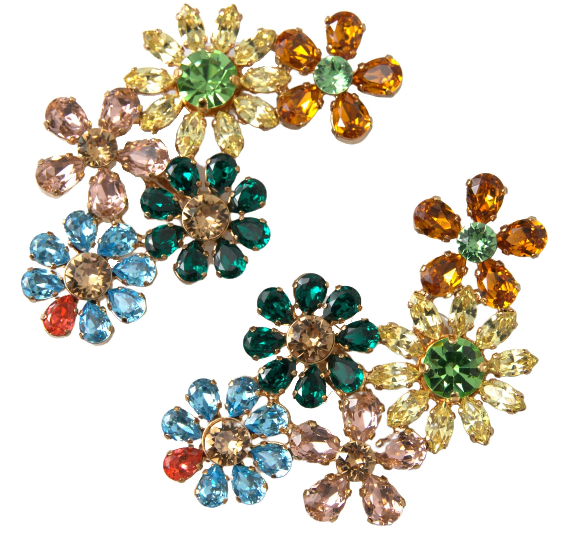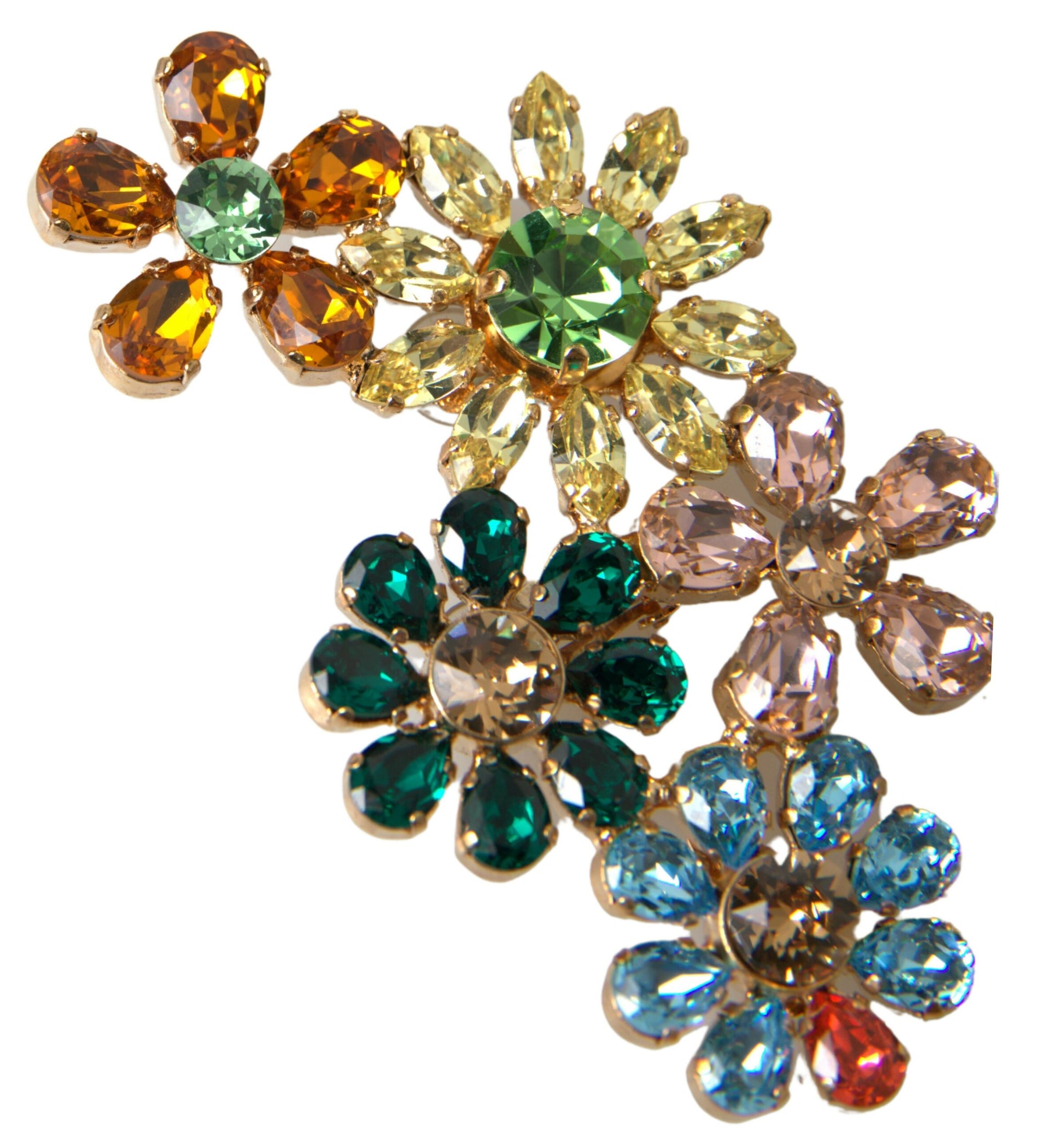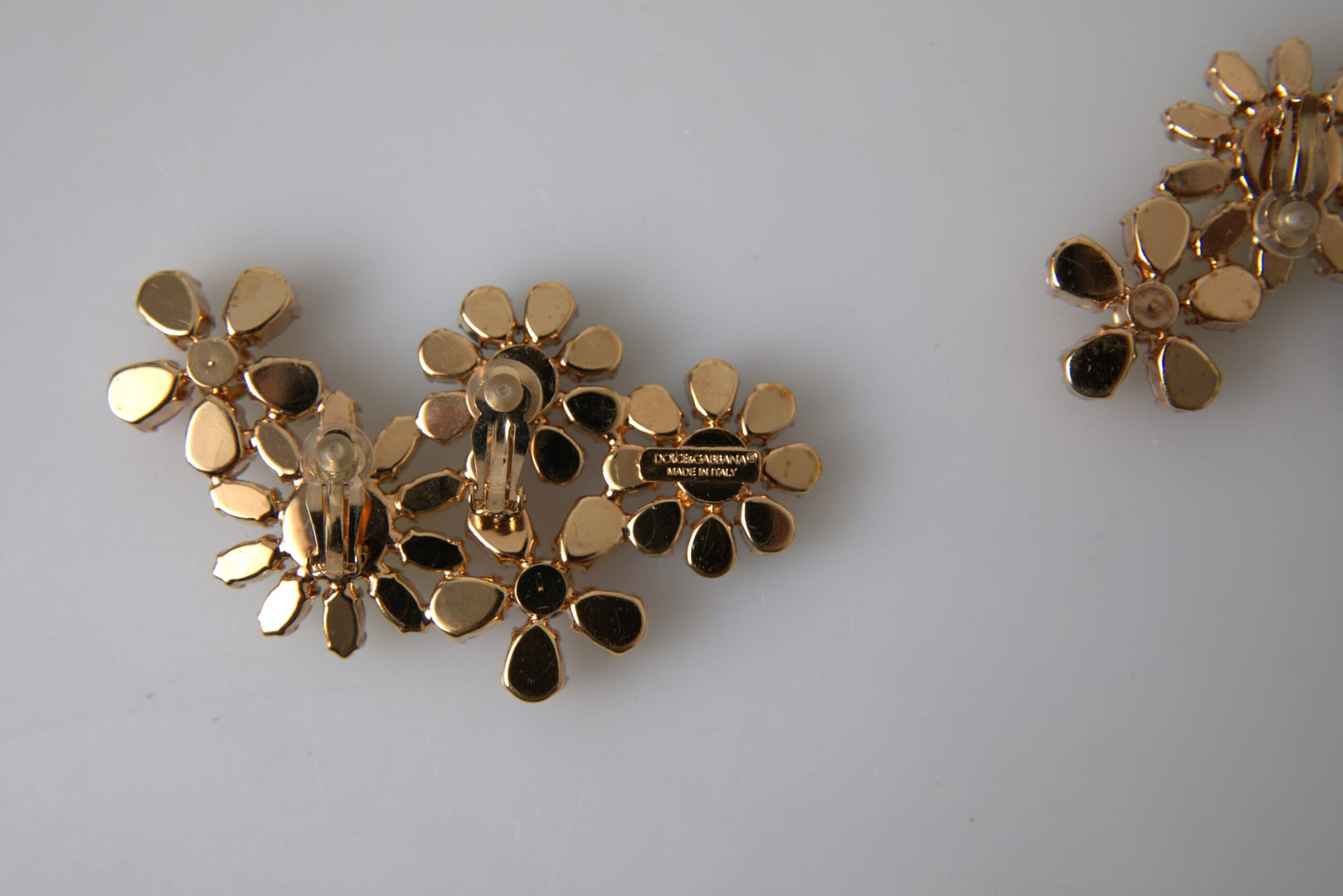 Indulge in the epitome of luxury with these exquisite Dolce & Gabbana crystal-embellished clip-on earrings. These dazzling accessories are sure to turn heads with their intricate floral design and sparkling multicolored crystals set against a lustrous gold backdrop. Perfect for adding a touch of glamour to any outfit, they have been crafted with the finest materials and the utmost attention to detail.