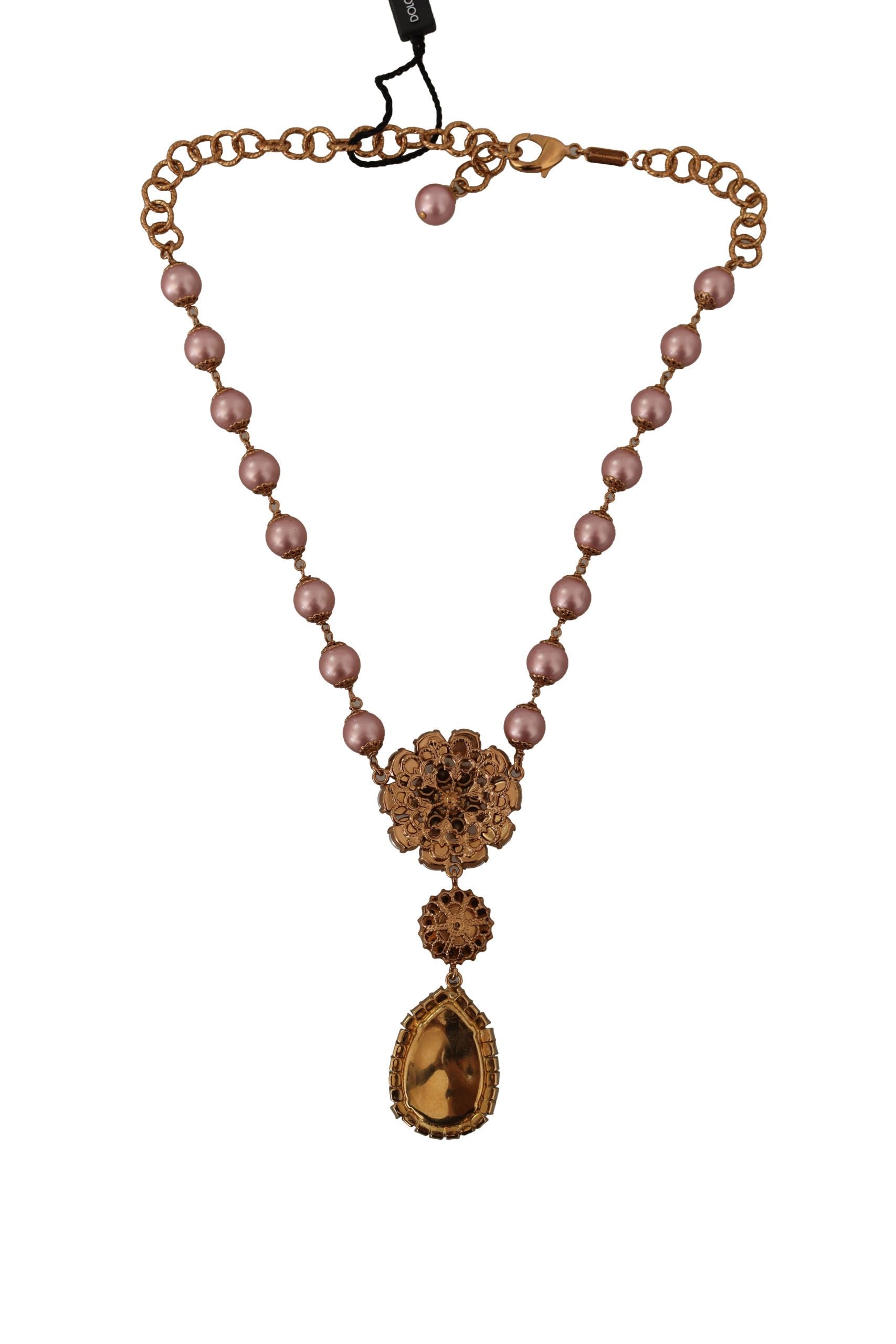 Embellish your neckline with the exquisite elegance of this charm beaded faux pearl necklace from Dolce & Gabbana. Expertly crafted in Italy, this stunning piece is sure to add a touch of sophistication to any ensemble. The blend of lustrous pearls and gleaming gold-tone brass is accented with delicate pink crystals, creating a romantic aesthetic. This necklace secures with a classic lobster clasp, showcasing the brand’s renowned logo details for an added touch of luxury.