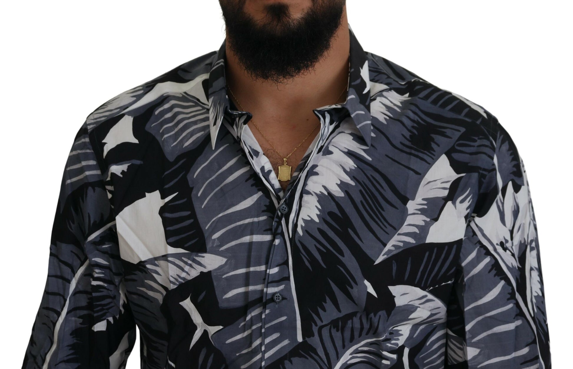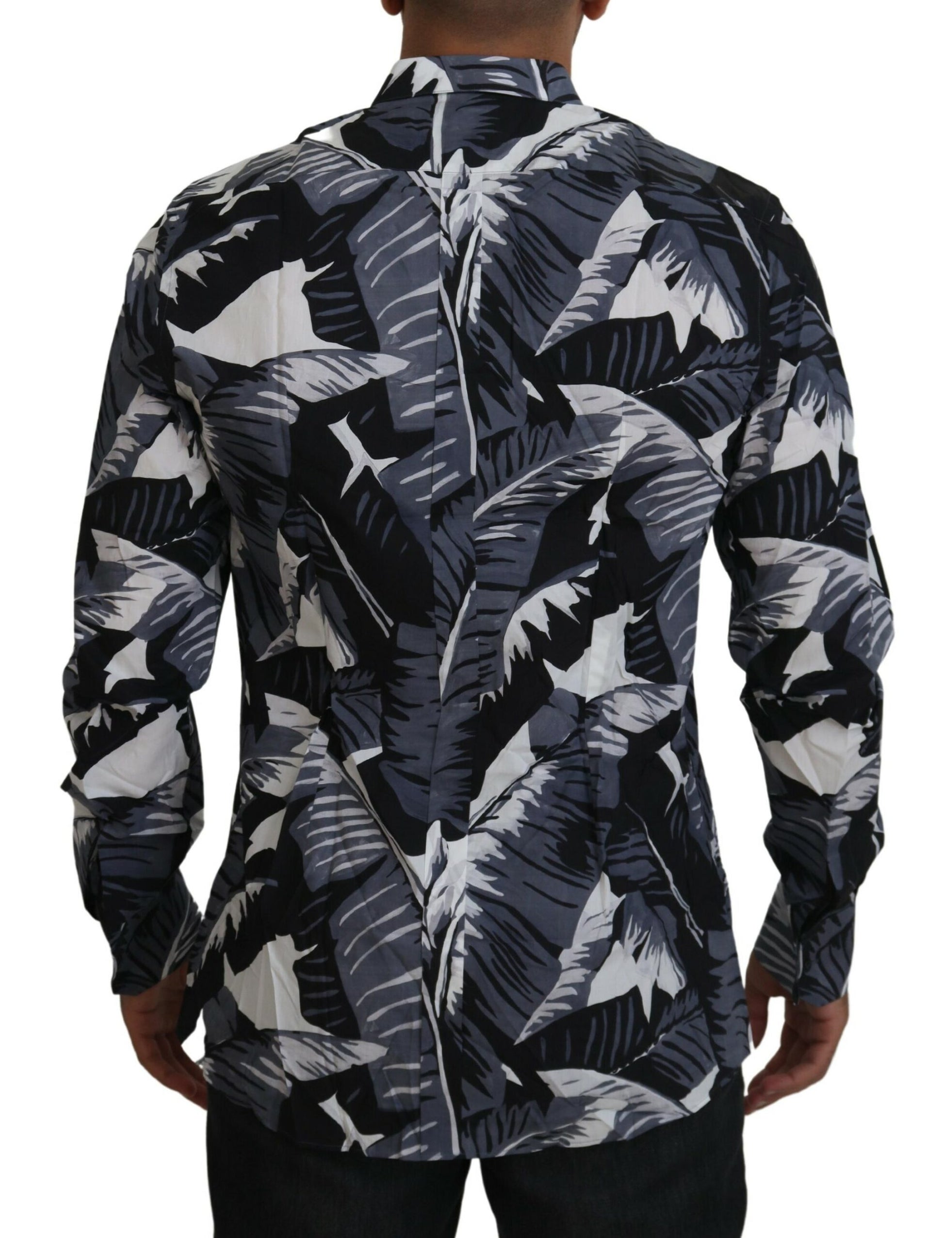 Steal the spotlight with this eye-catching Dolce & Gabbana Casual Shirt, perfect for any fashion-forward wardrobe. This slim fit shirt exudes style with its vibrant banana leaf print in shades of gray, blue, and white, and is crafted from the finest 100% cotton for ultimate comfort. The design features a sleek front button closure, standard cuffs, and subtle logo details, all meticulously made in Italy.