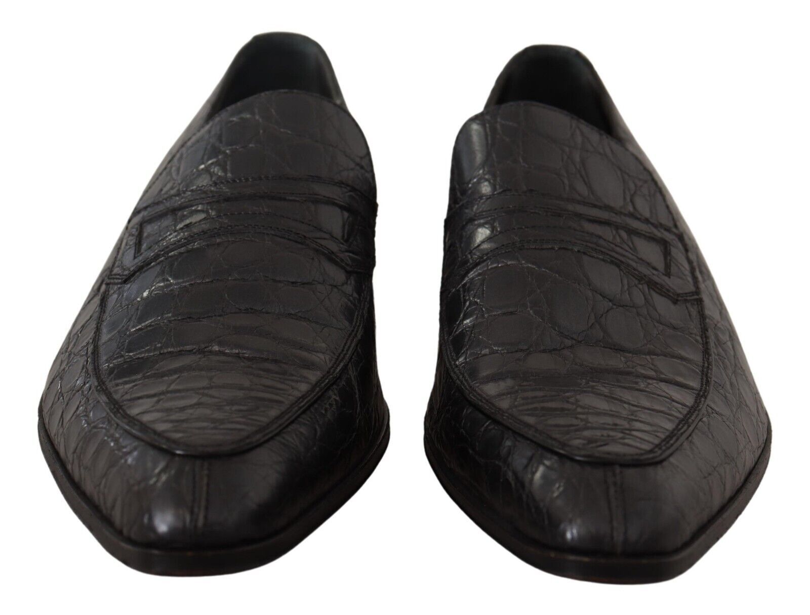 Step into luxury with these 100% Authentic, exquisite Dolce & Gabbana crocodile skin leather loafers. Their sleek design and the sumptuous touch of caiman leather will elevate your formal footwear collection. The blend of gray and black hues creates a sophisticated palette that complements any high-end ensemble. Crafted meticulously in Italy, these loafers are more than just shoes; they are a testament to the wearer’s impeccable taste and stand as a hallmark of true craftsmanship with the iconic Dolce & Gabbana logo details and a premium leather sole.