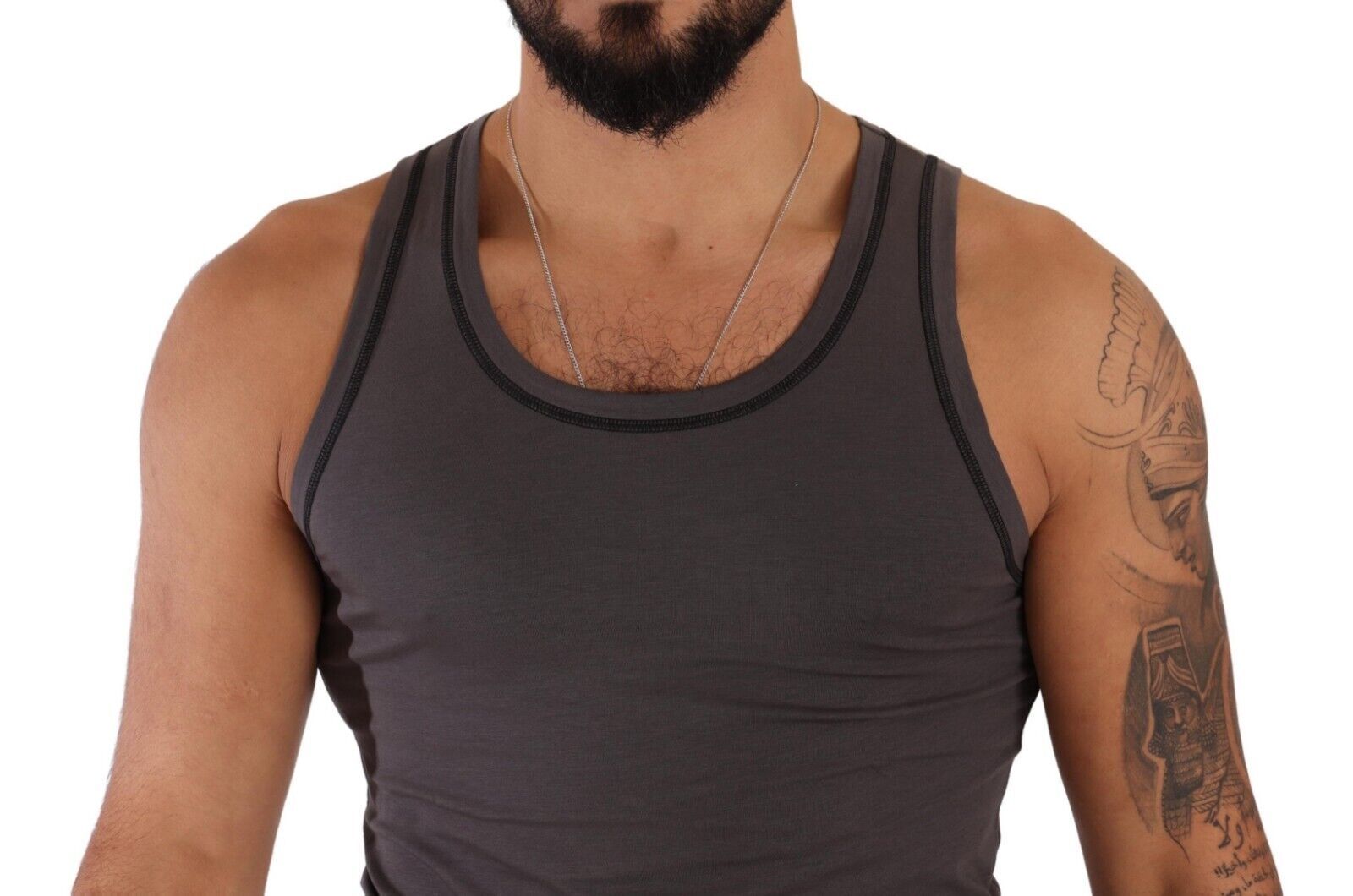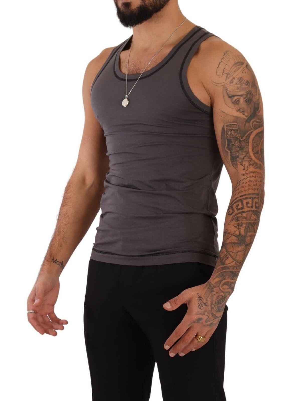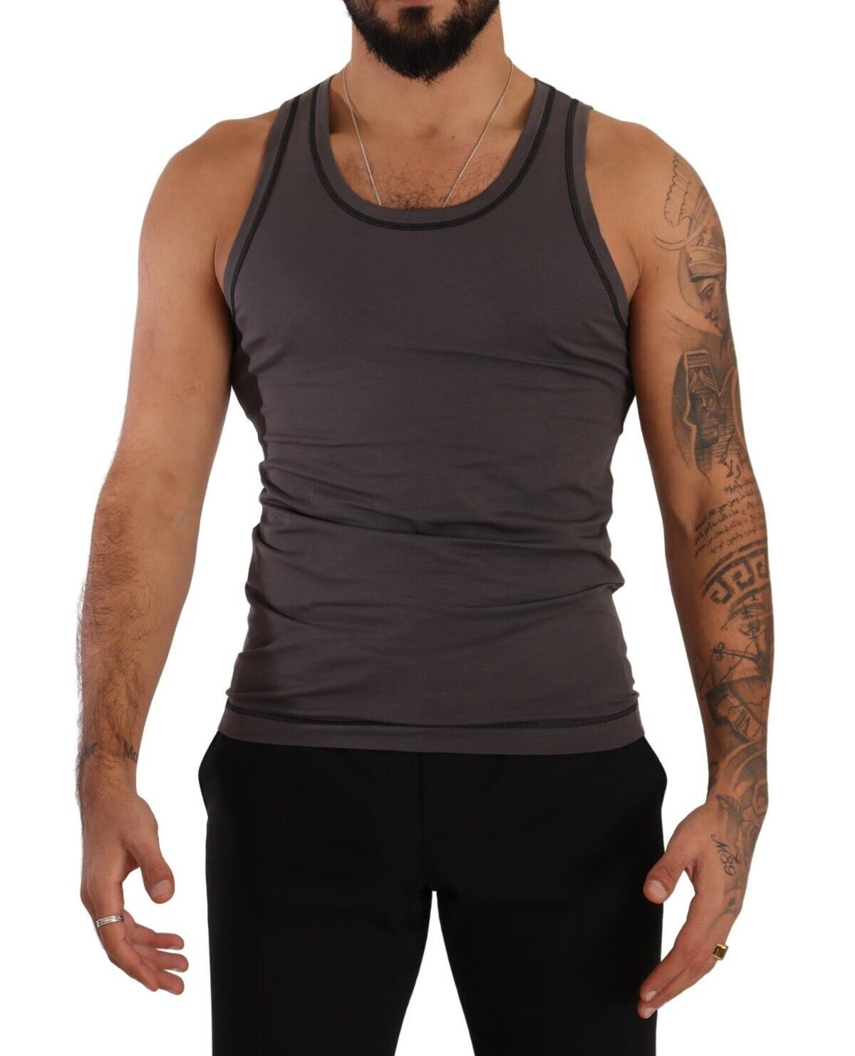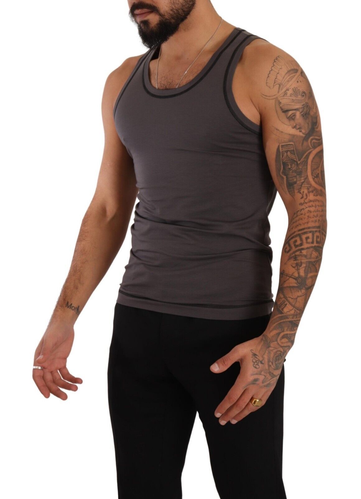 Indulge in the luxurious comfort of this high-quality dark grey tank top from Dolce & Gabbana. Perfect for adding a touch of elegance to your everyday essentials, this piece is a stunning testament to classic style paired with modern design. Crafted with the finest materials, its snug fit and exquisite logo detail make it a must-have in your wardrobe.