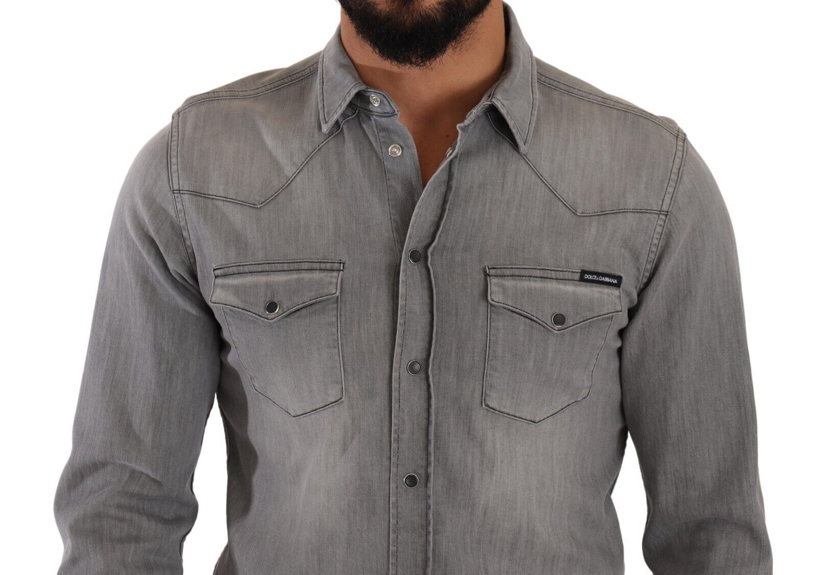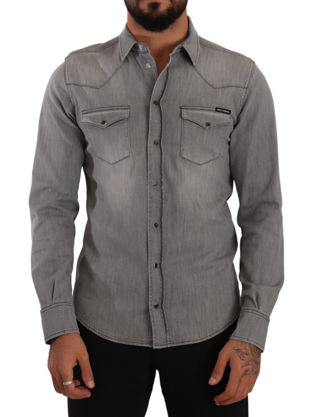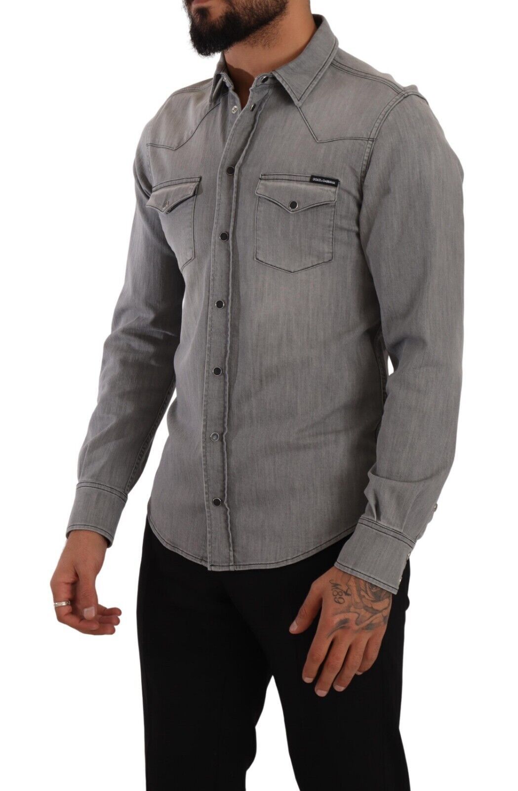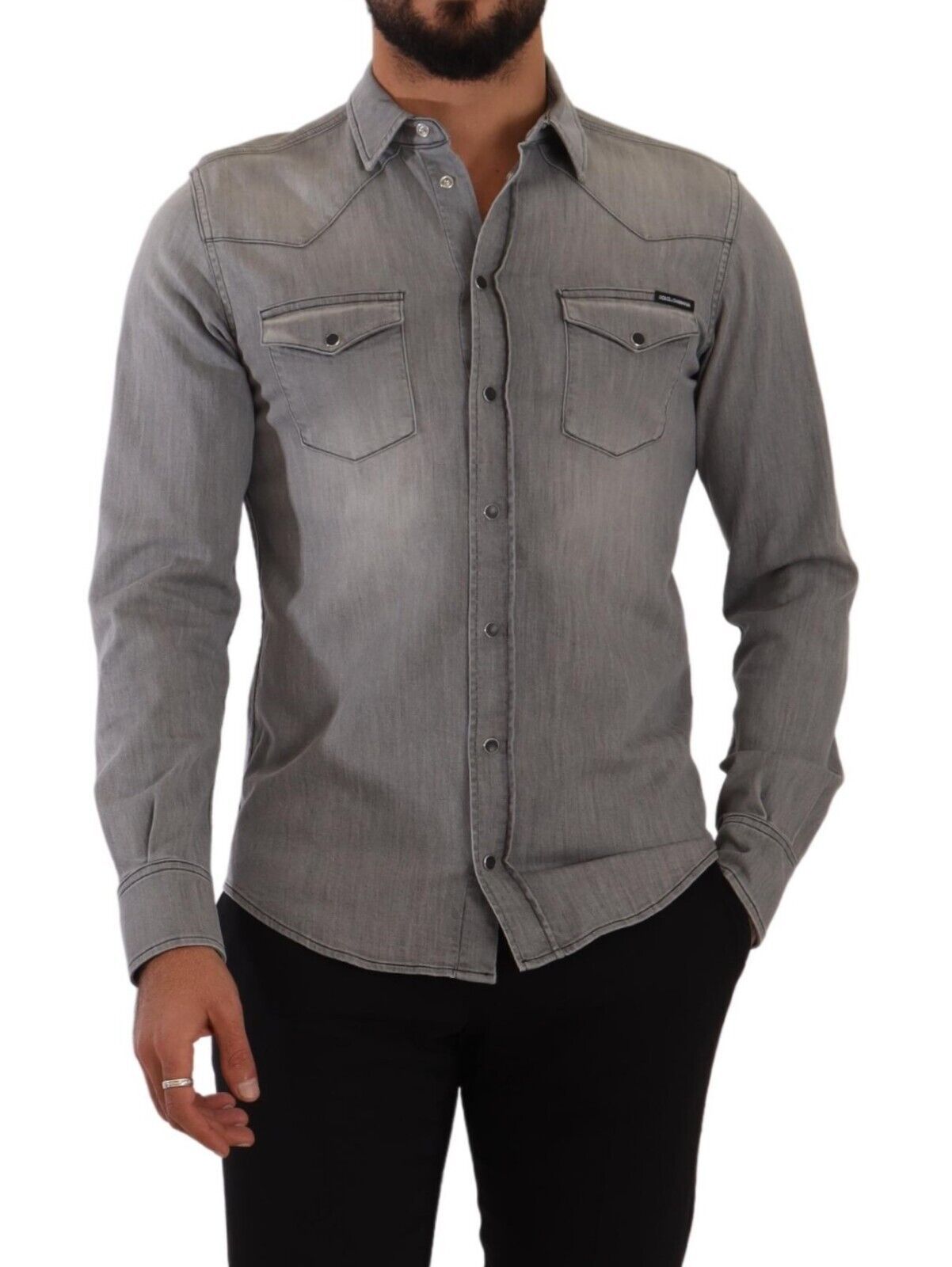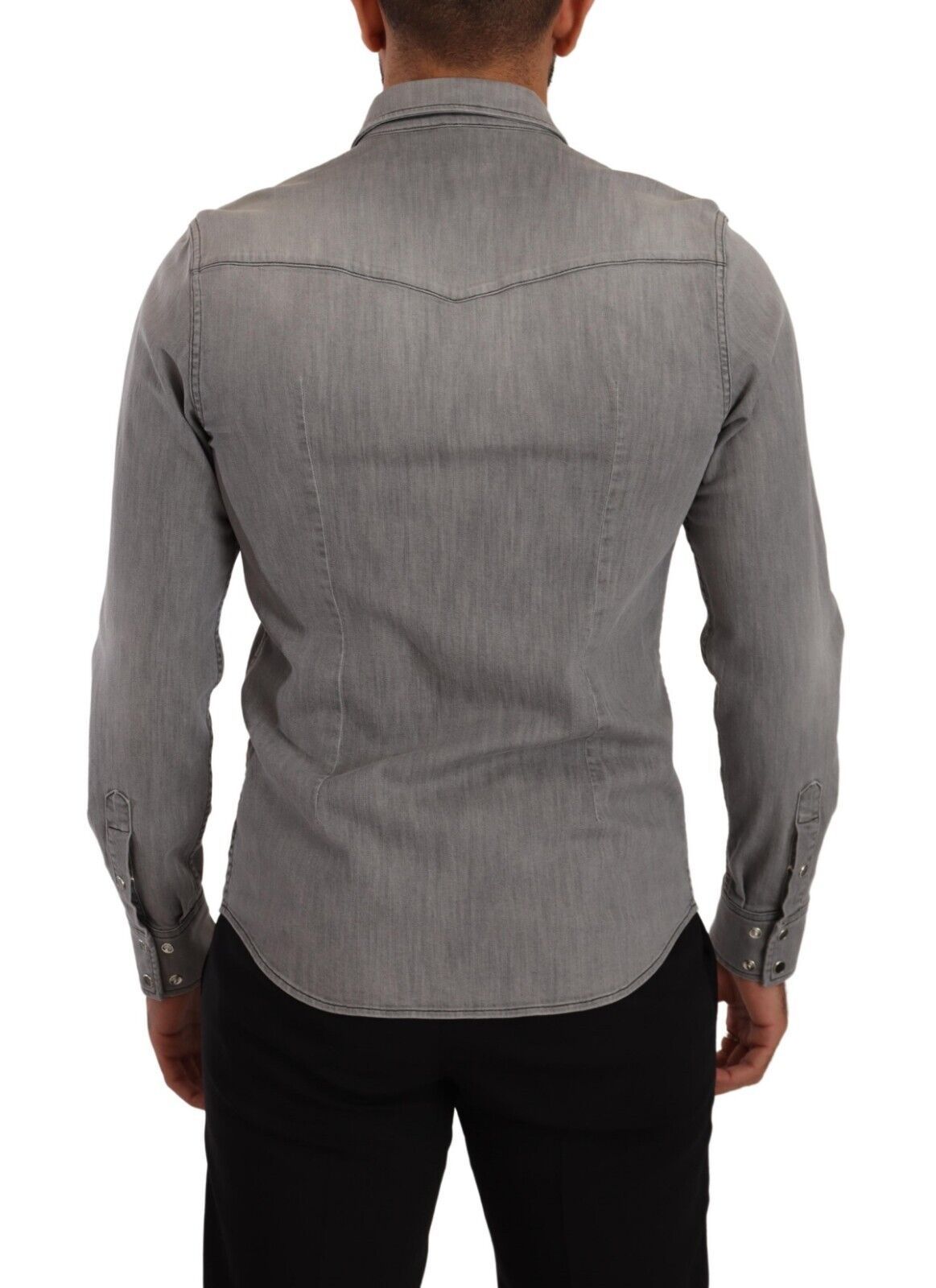 Introducing the epitome of luxury casual wear – this sophisticated, 100% Authentic, new with tags slim fit denim shirt from Dolce & Gabbana is a must-have addition to your wardrobe. Crafted from a premium blend of cotton and elastane, this piece offers continued comfort and a sleek appearance. The modern gray hue makes it a versatile choice for various occasions, whether for a day out or an evening event. Made in Italy, it features a button-down closure and exquisite logo details, reflecting your impeccable taste in fashion.