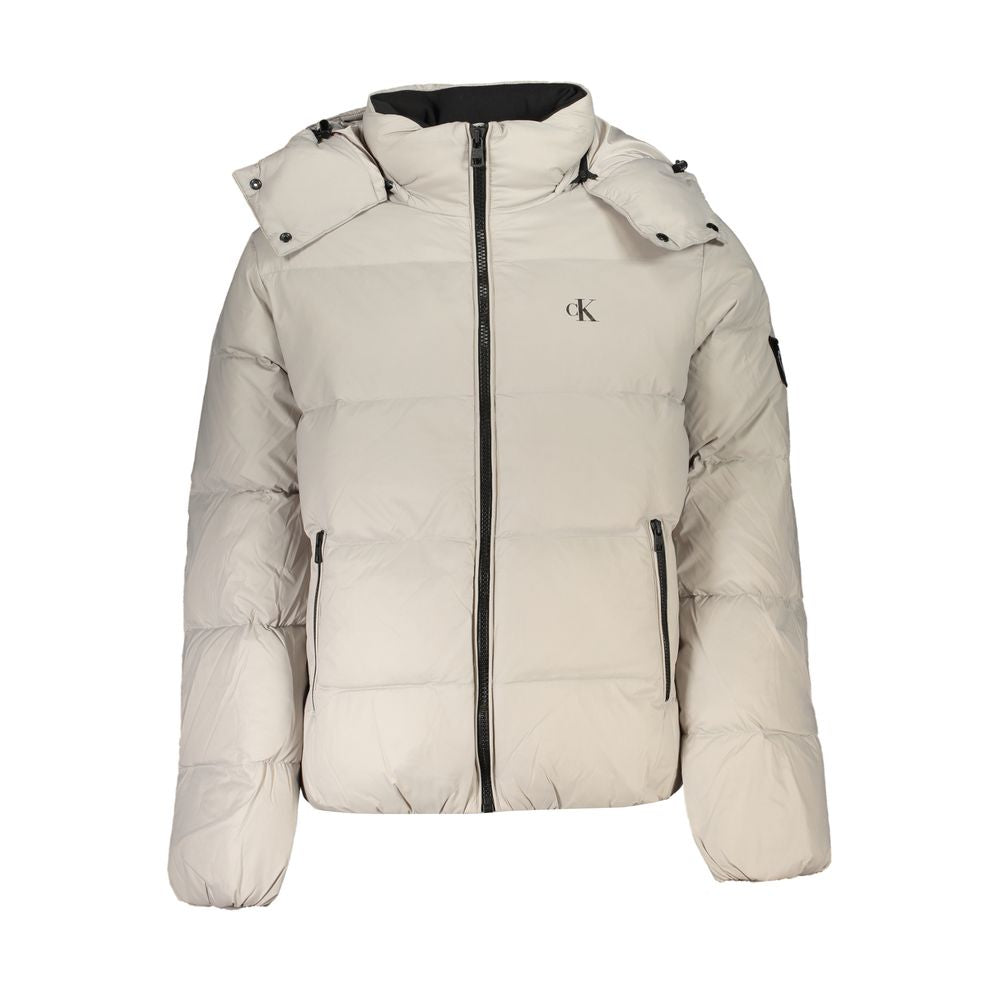 Transition through the seasons in style with this versatile Calvin Klein jacket. Crafted with eco-conscious 95% recycled nylon, it features long sleeves and a convenient removable hood perfect for unpredictable weather. Practicality meets fashion with two external pockets, an internal pocket for your essentials, and distinct Calvin Klein branding details. This sleek gray jacket embodies both sustainability and elegance.