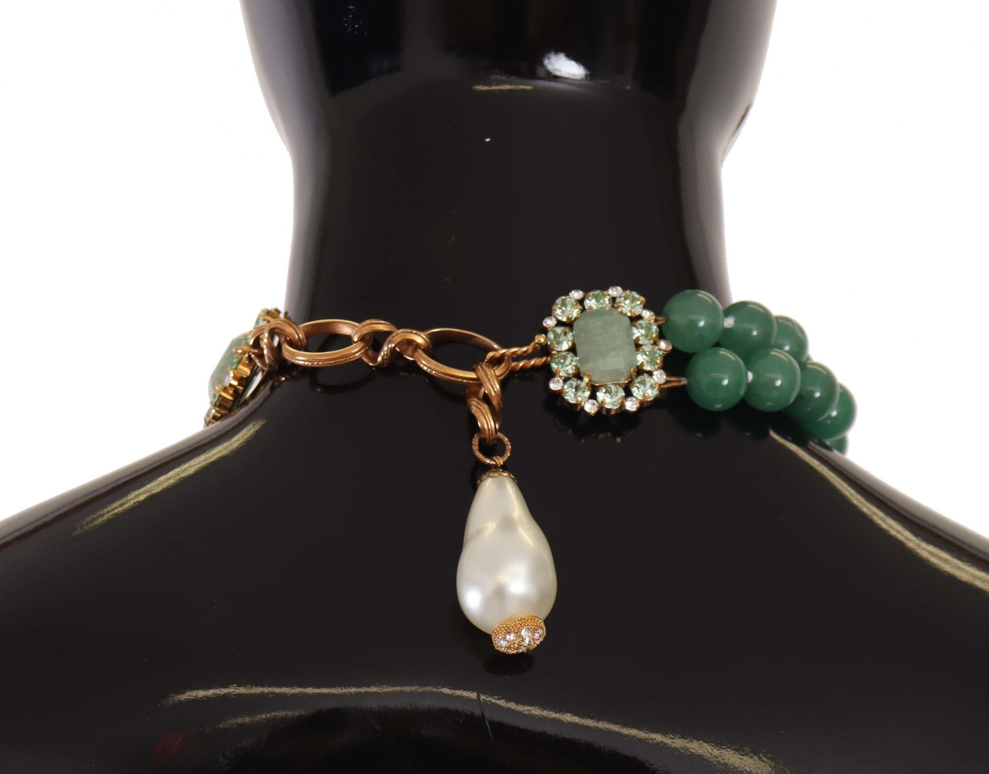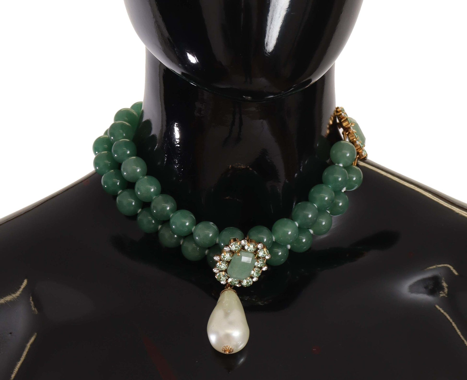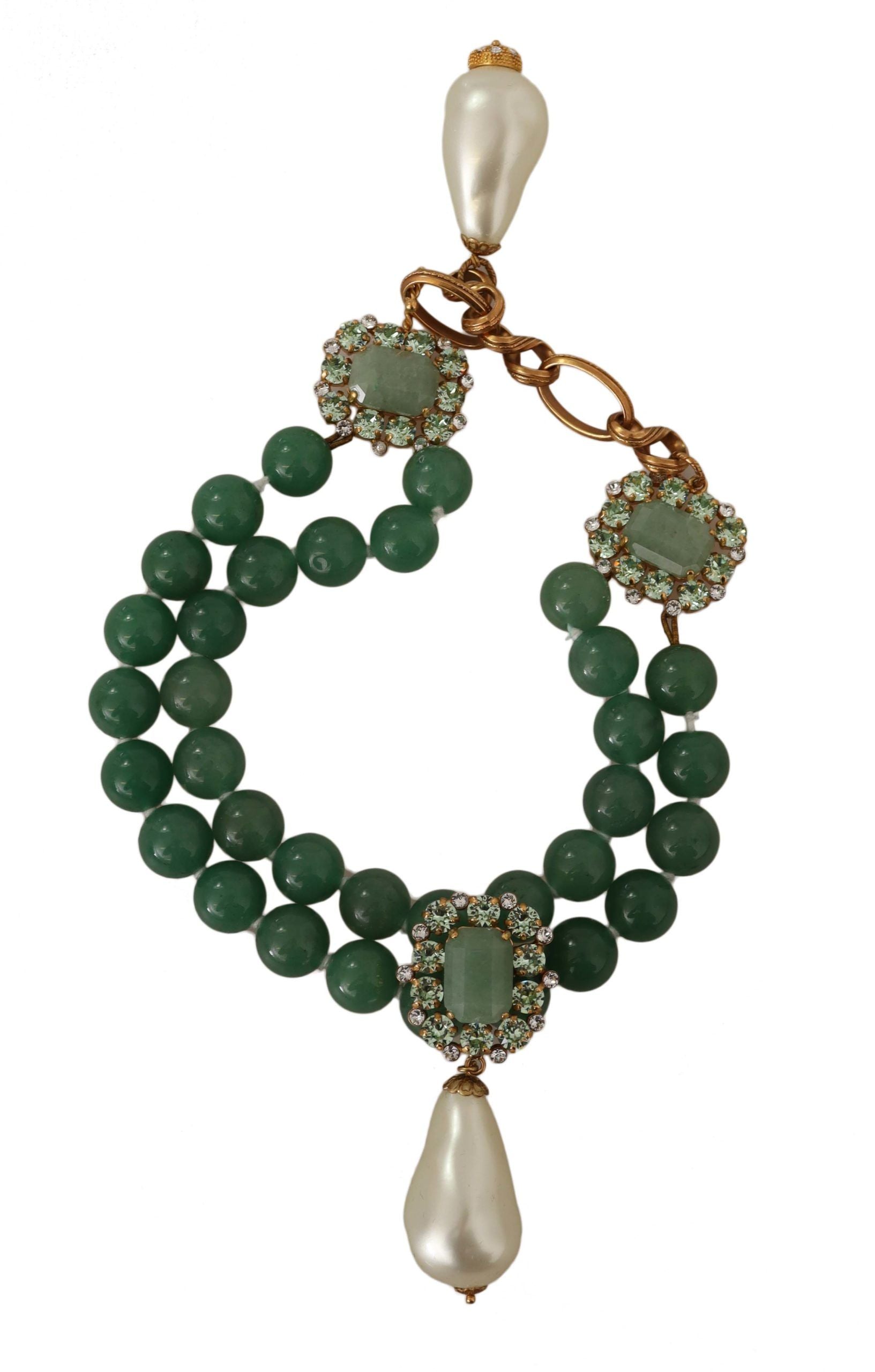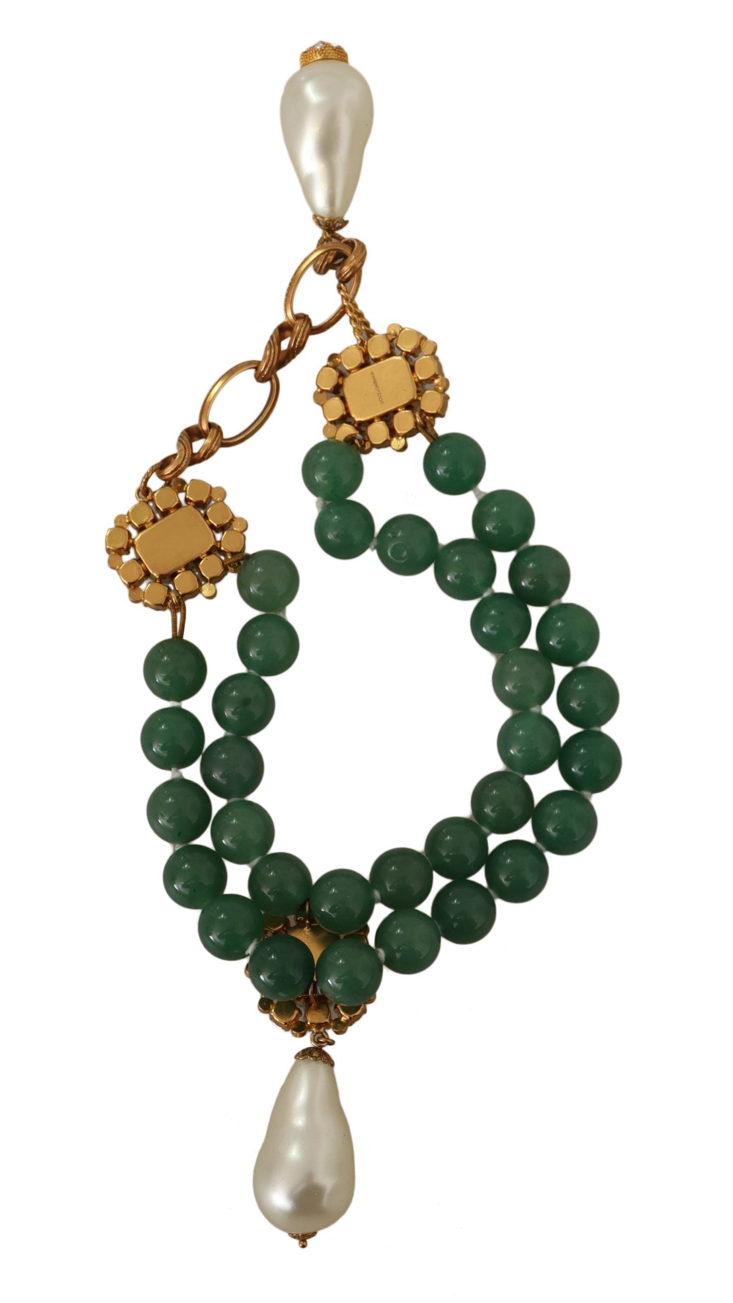 Indulge in the opulence of Dolce & Gabbana with this exquisite two-strand charm necklace, prominently featuring green aventurine beads for a touch of earthy elegance. A golden twisted chain insert adds a lavish twist, while the square buckles sparkle with transparent crystals. Ornate pendants of drop-shaped pearls dangle delicately, completing this luxurious accessory that embodies Italian craftsmanship.