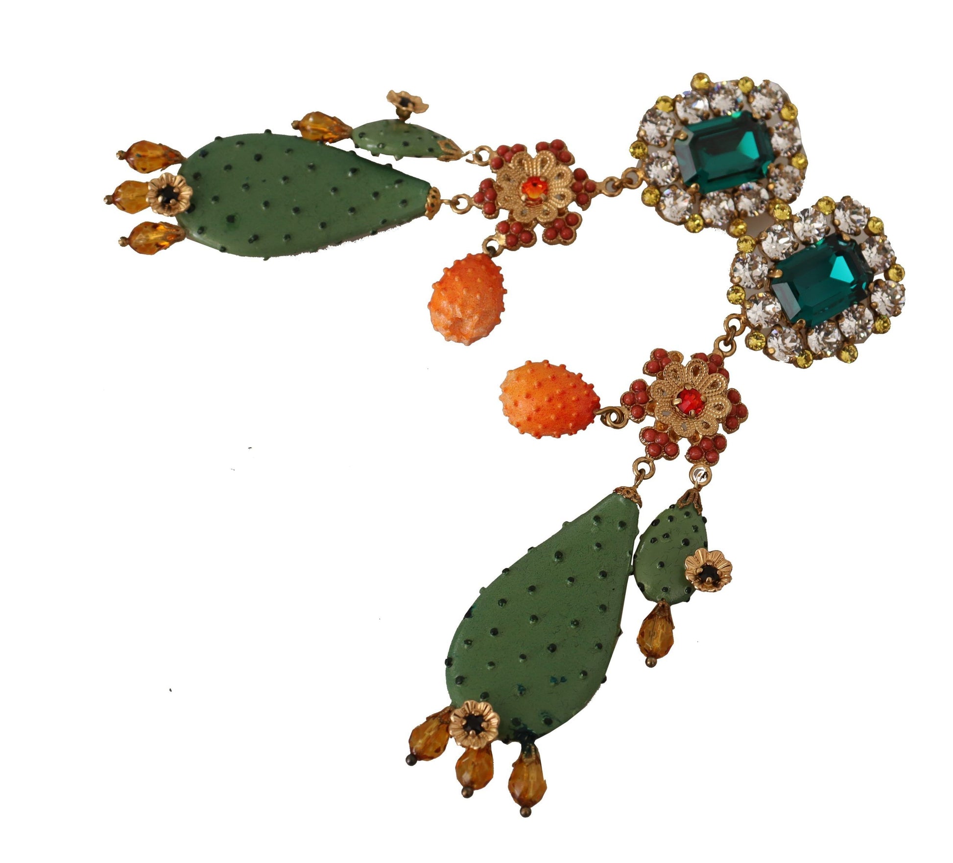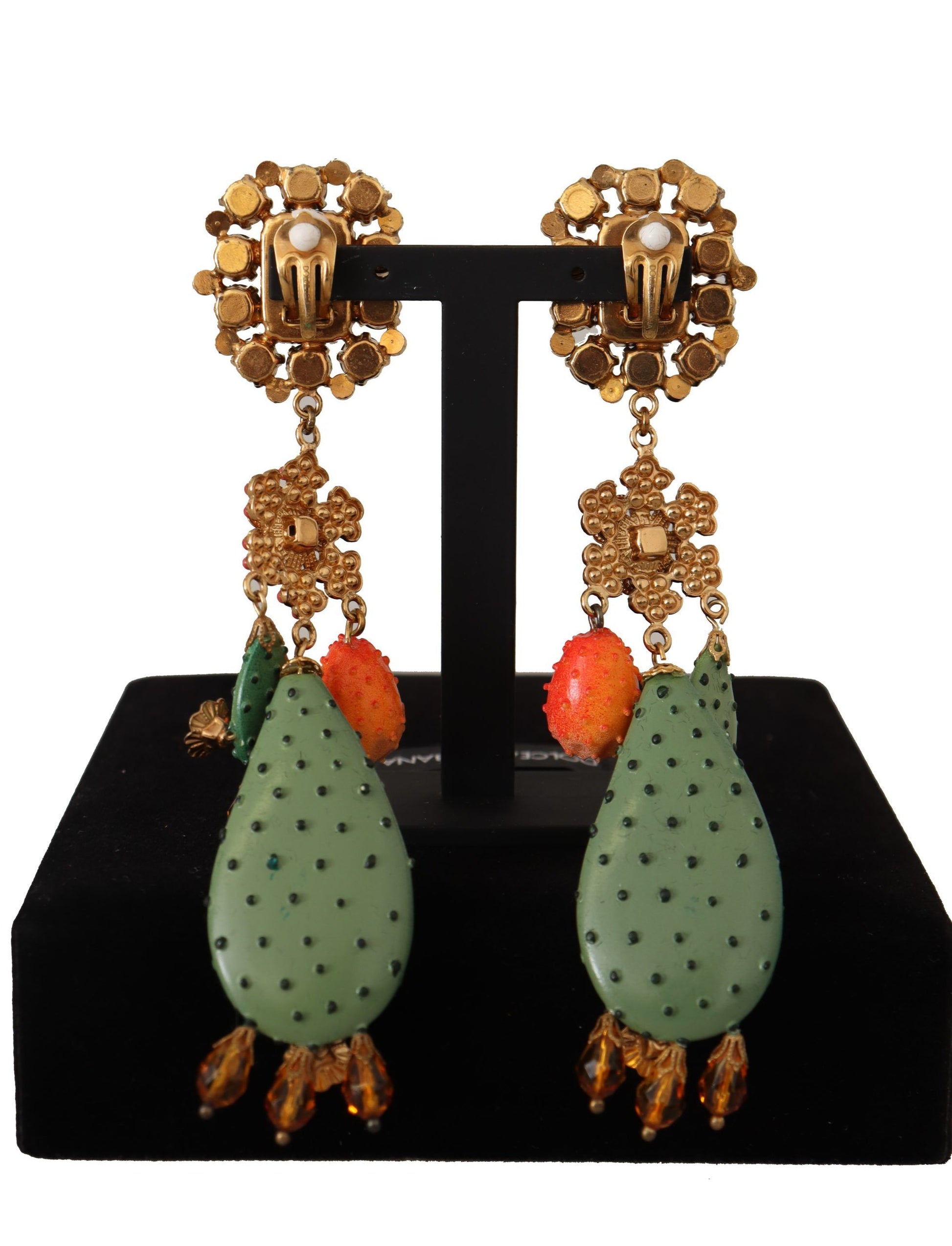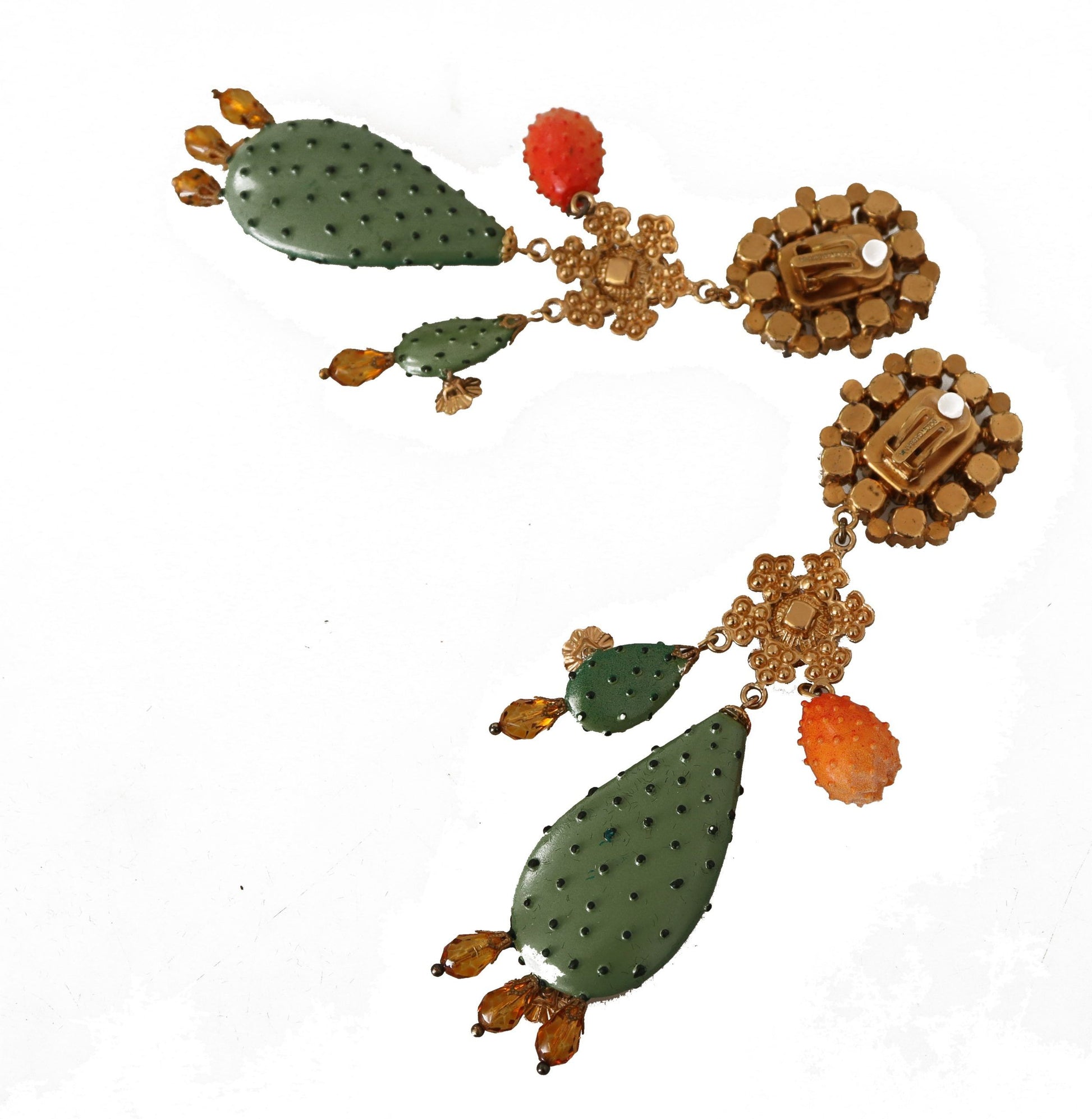 Discover the epitome of Italian elegance with these stunning clip-on earrings from Dolce & Gabbana. Adorned with a vibrant floral cactus motive, these dangling beauties are designed to make a statement. Composed of a luxurious mix of materials that catch the light, featuring brass, plastic, glass, and resin, they’re perfect for adding a touch of glamour to any outfit. The gleaming gold hue complemented by multicolor crystals create a mesmerizing sparkle. Each earring is meticulously crafted with the designer’s iconic logo details, ensuring authenticity and unparalleled style. Made in Italy, they measure a dramatic 12cm length, ideal for turning heads at any soirée.