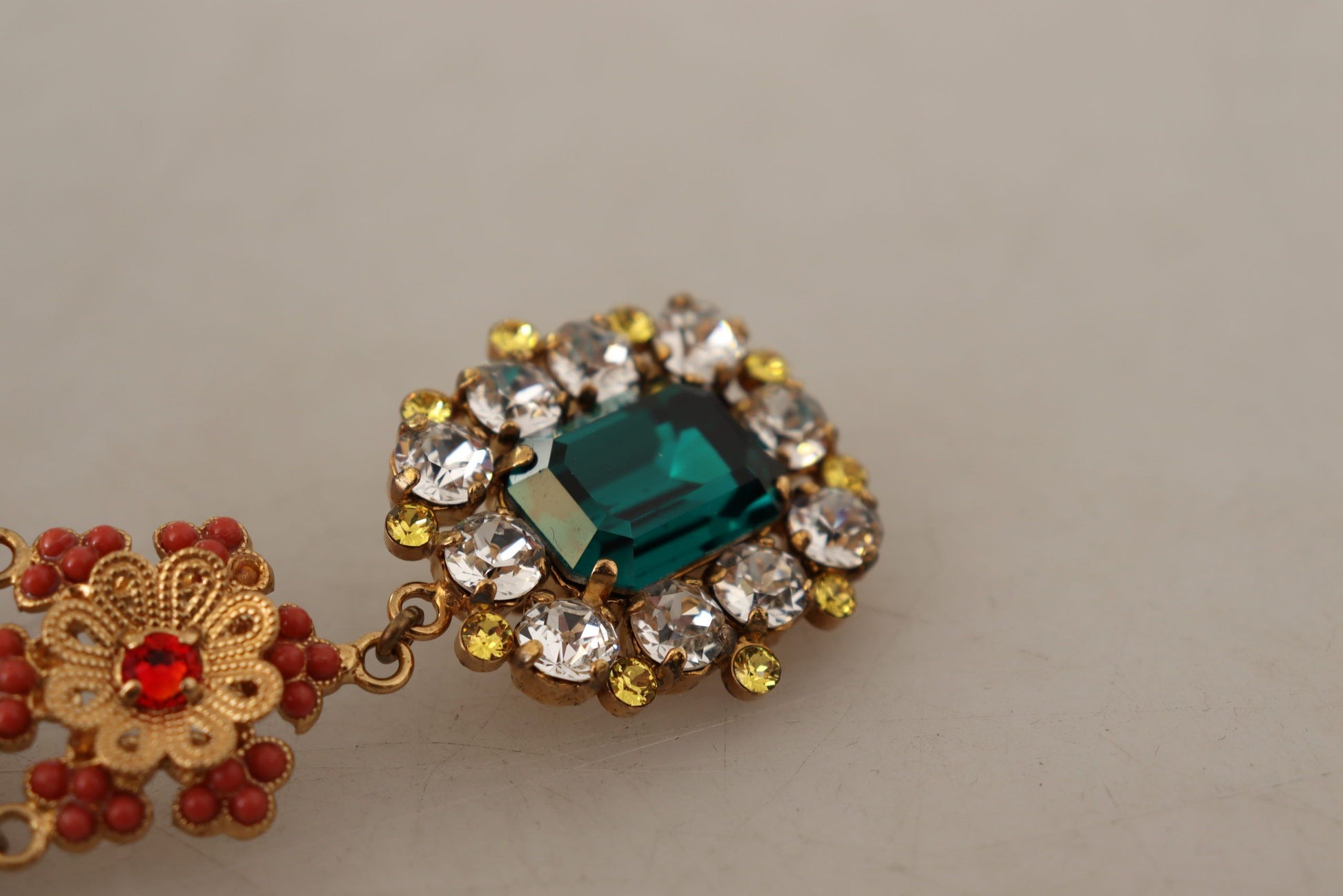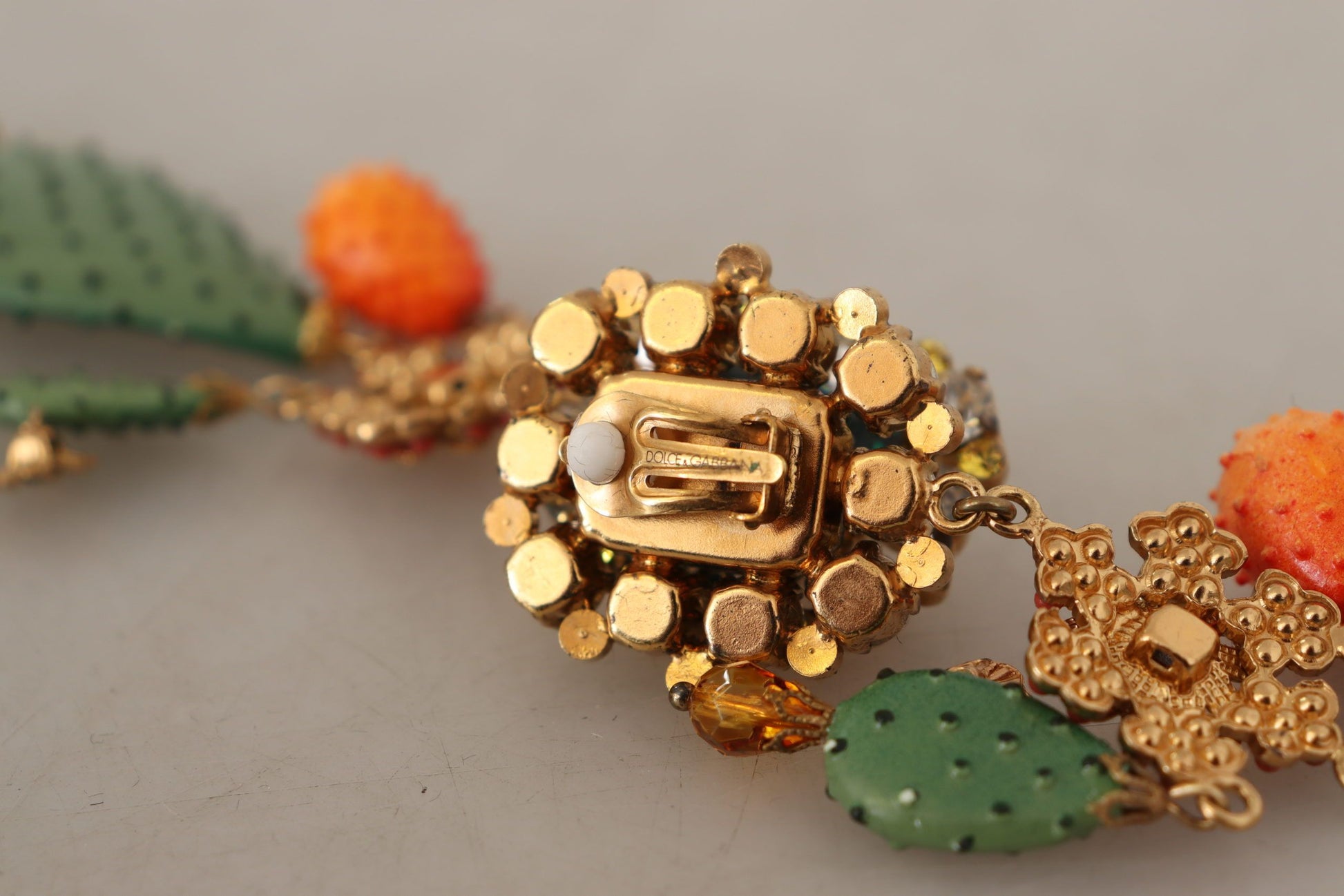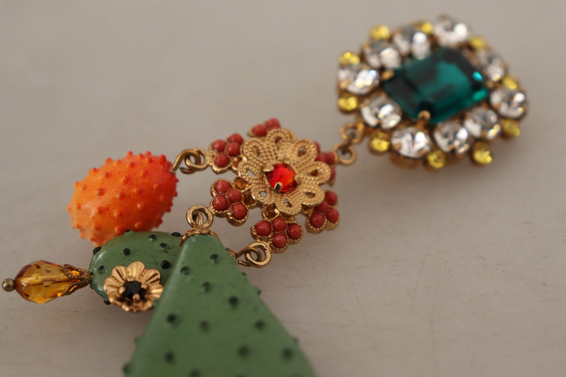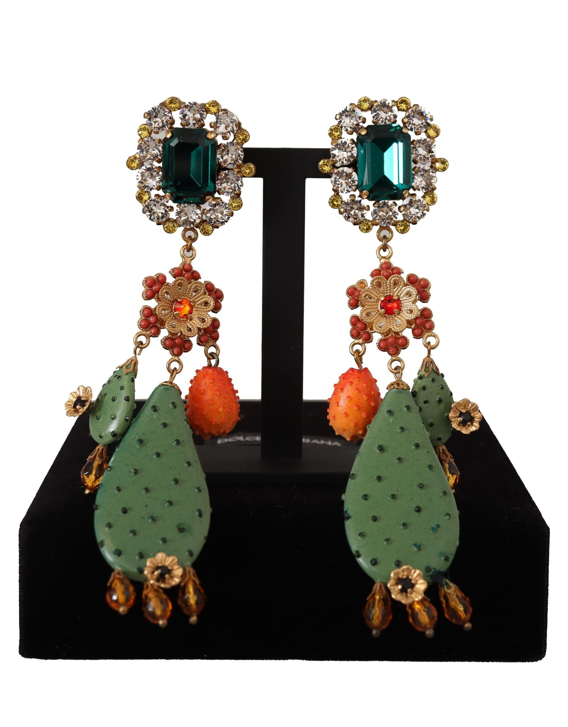Discover the epitome of Italian elegance with these stunning clip-on earrings from Dolce & Gabbana. Adorned with a vibrant floral cactus motive, these dangling beauties are designed to make a statement. Composed of a luxurious mix of materials that catch the light, featuring brass, plastic, glass, and resin, they’re perfect for adding a touch of glamour to any outfit. The gleaming gold hue complemented by multicolor crystals create a mesmerizing sparkle. Each earring is meticulously crafted with the designer’s iconic logo details, ensuring authenticity and unparalleled style. Made in Italy, they measure a dramatic 12cm length, ideal for turning heads at any soirée.