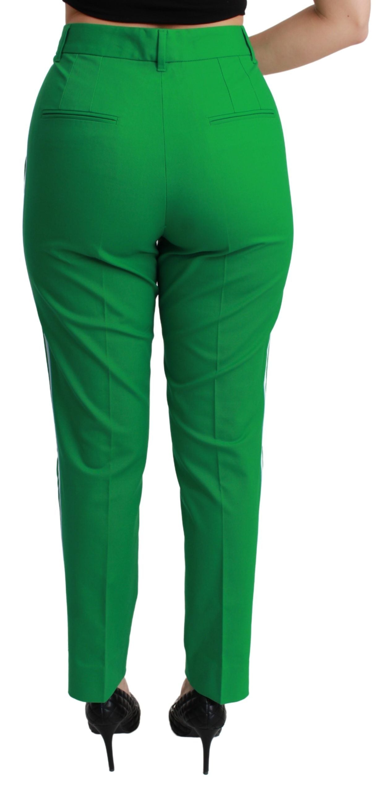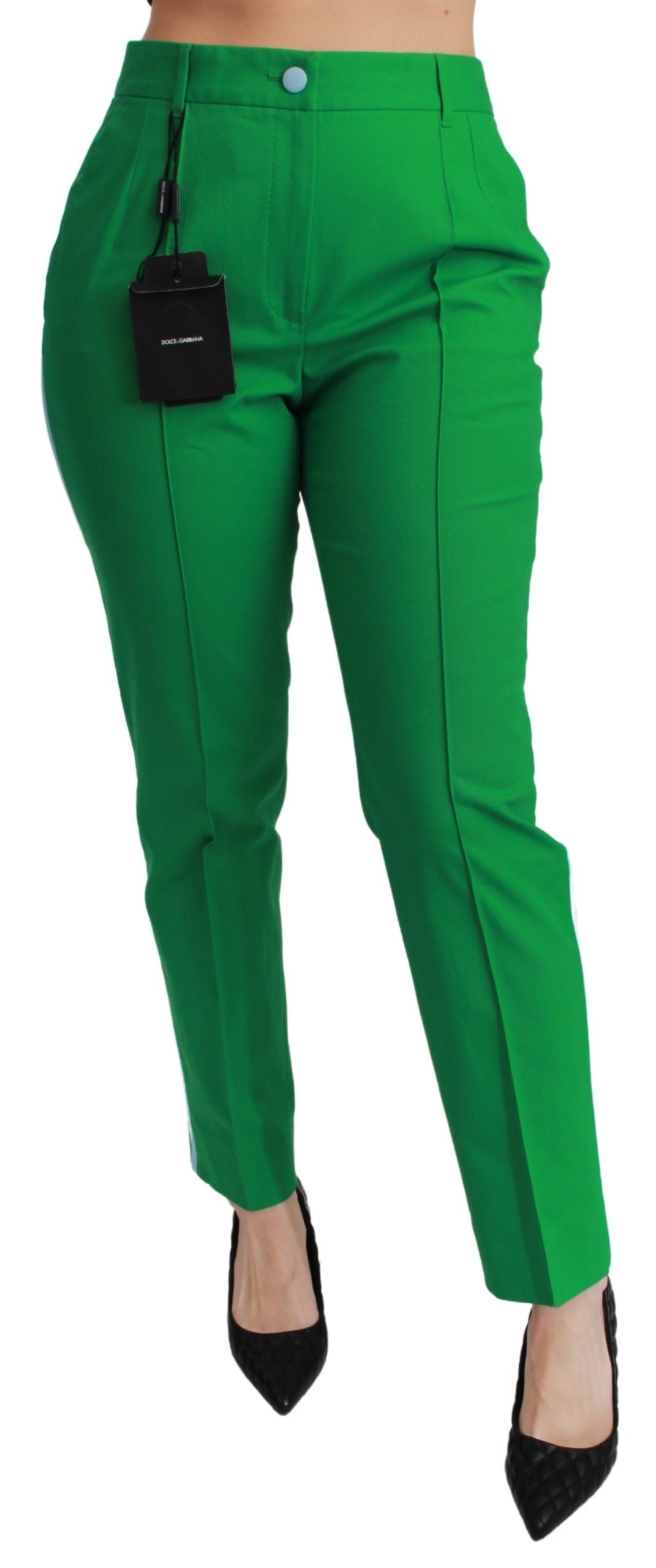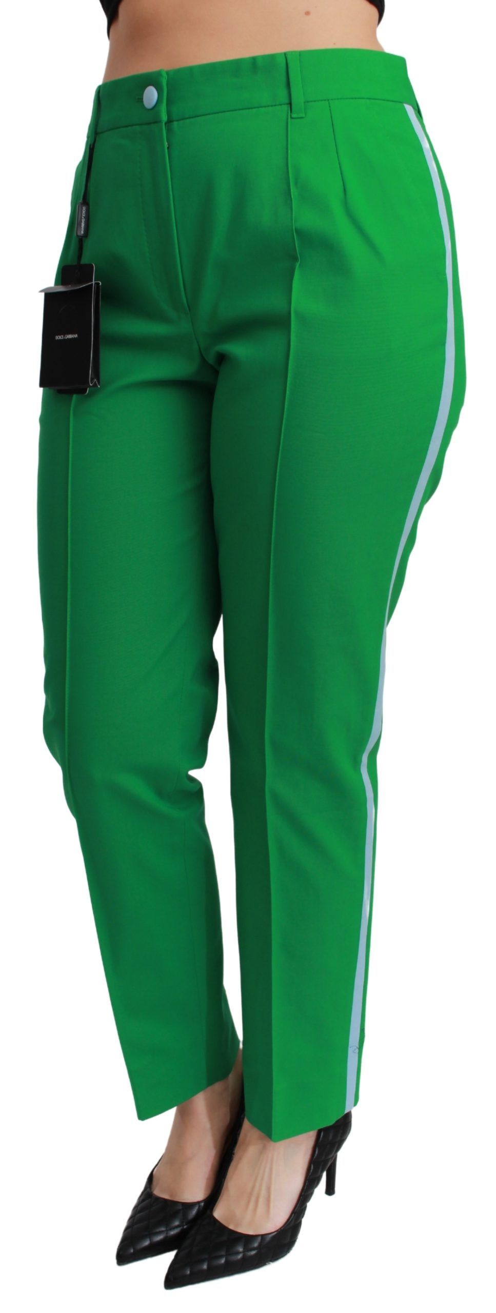 Revitalize your wardrobe with these exquisitely designed Dolce & Gabbana high-waist trousers. Impeccably tailored with a stylish green hue and a chic blue stripe that adds a touch of uniqueness. Perfect for creating sophisticated, fashionable looks for both office chic and evening elegance. Made in Italy ensures the finest quality and craftsmanship.