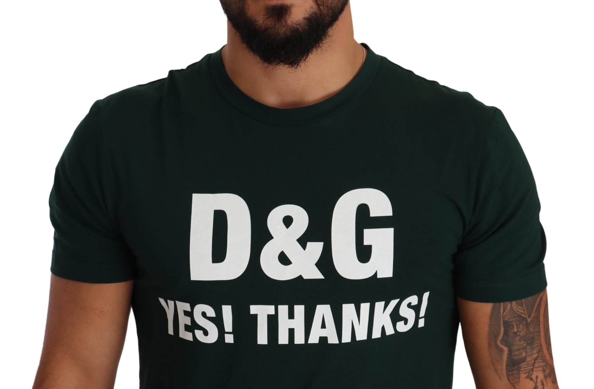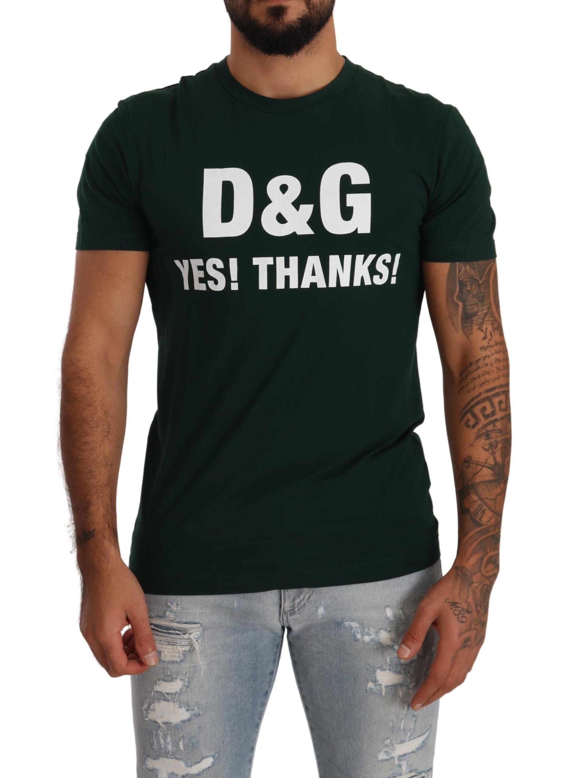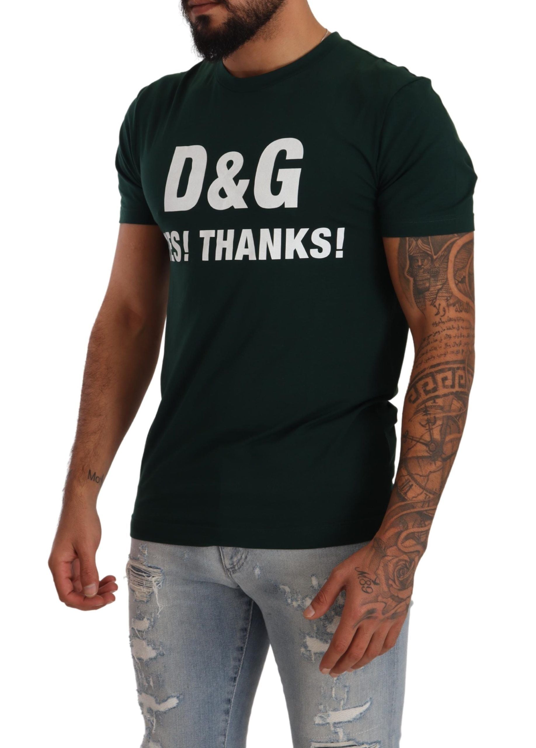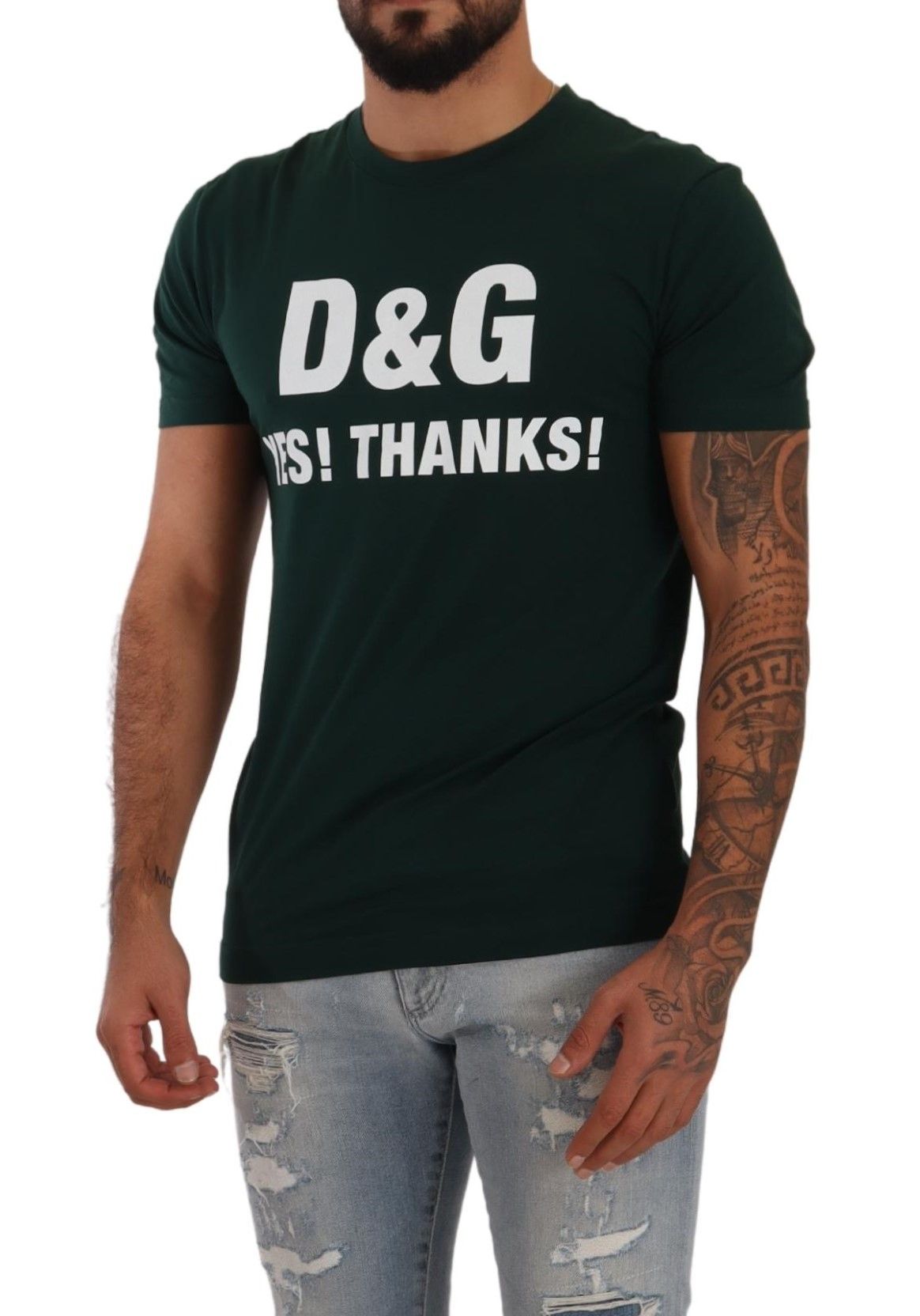 Introducing the epitome of casual luxury – A pristine, 100% Authentic Dolce & Gabbana Crewneck T-shirt. This stunning green piece features a white motif print that spells out ‘D&G YES! THANKS!’ creating a playful yet refined style statement. Crafted from a high-quality blend of cotton and elastane, this T-shirt offers both comfort and a flattering regular fit. Each detail showcases the exceptional Italian craftsmanship Dolce & Gabbana is known for.