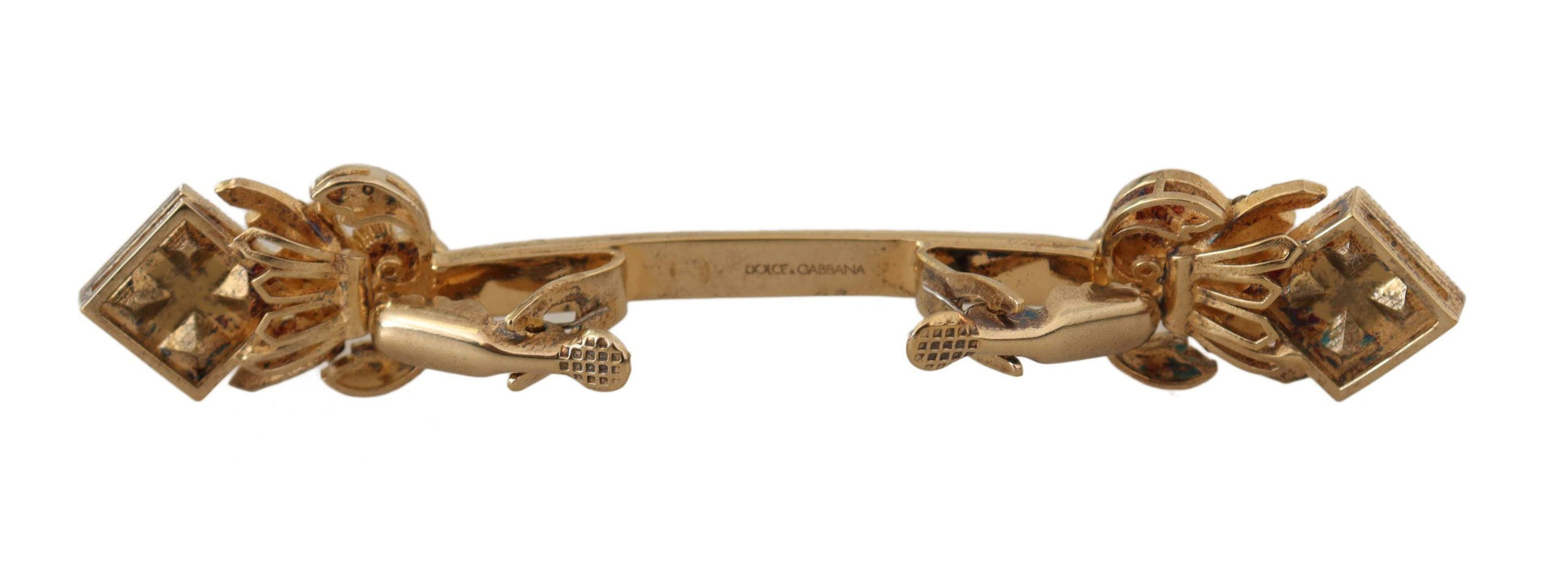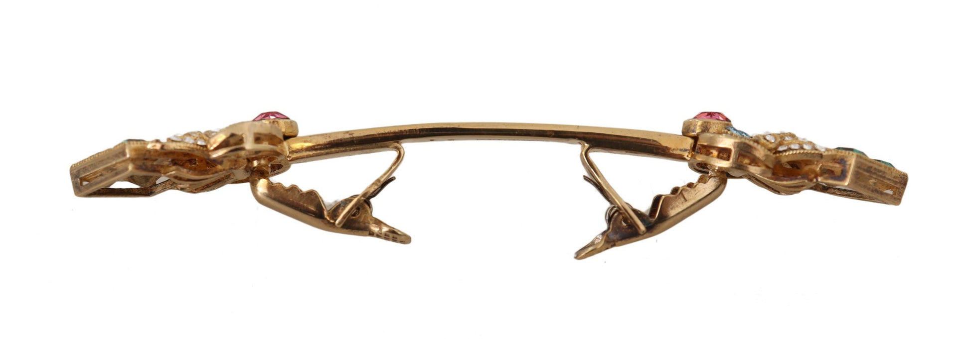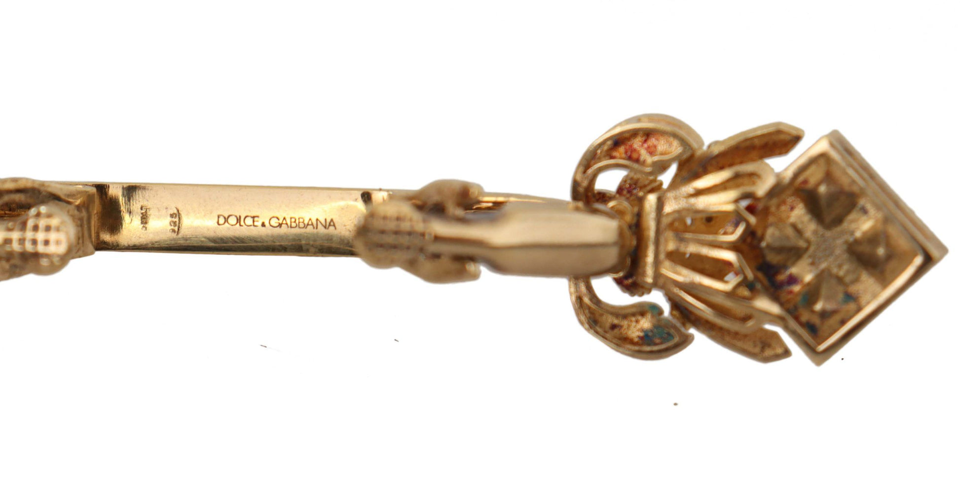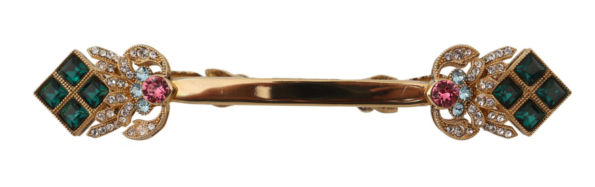 Adorn your ensemble with the opulence of a Dolce & Gabbana tie clip. This exquisite accessory features sparking multicolor crystals set in an elegant emerald green hue, perfectly accenting the polished gold tone finish. A true statement piece made in Italy that not only holds your tie in place but adds a touch of sophistication to your outfit.