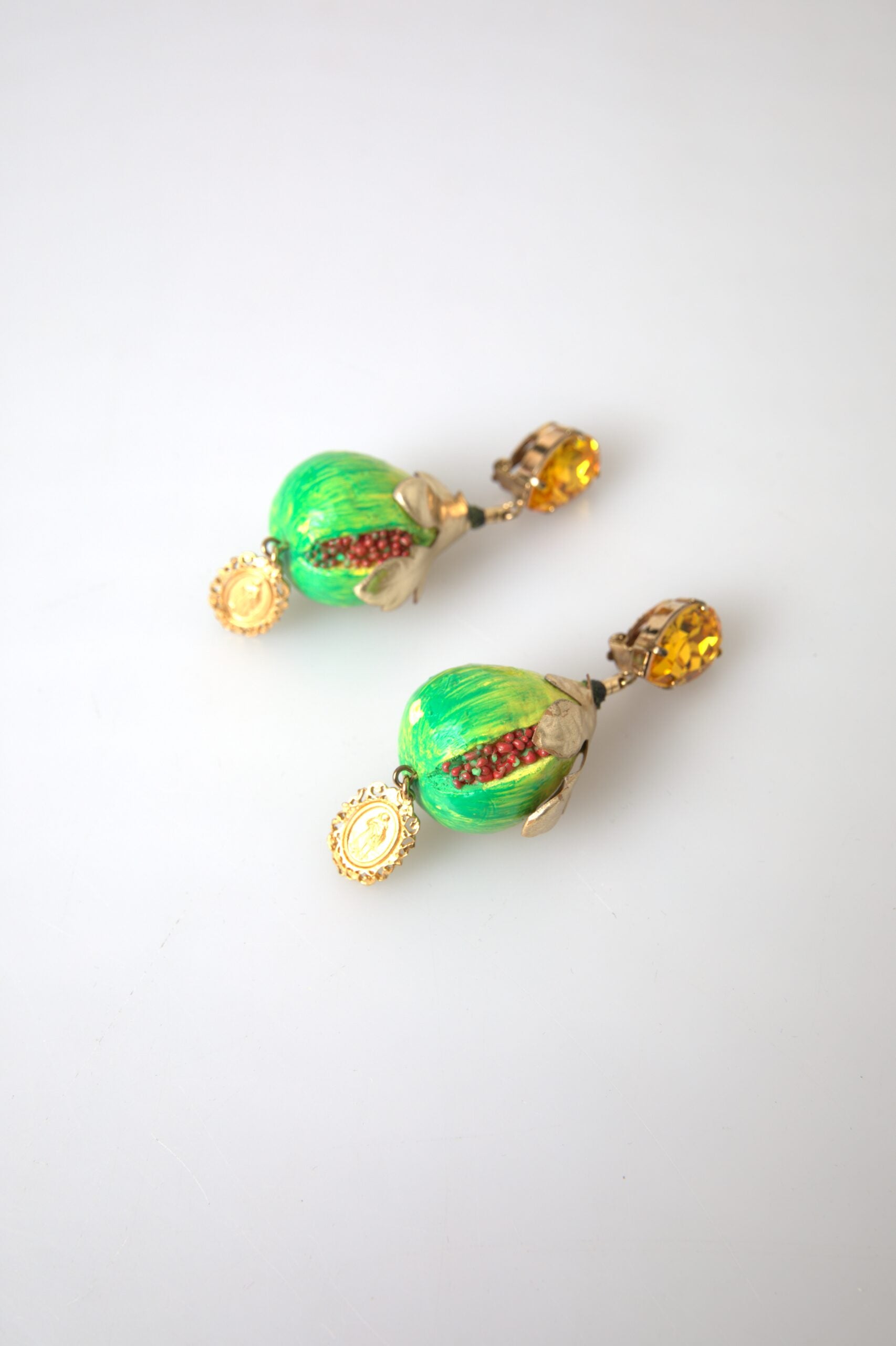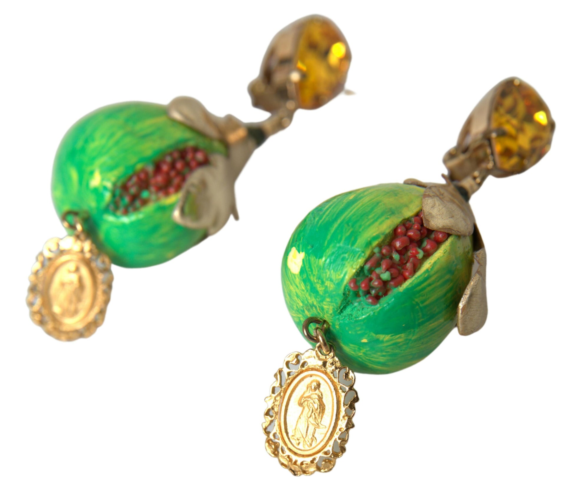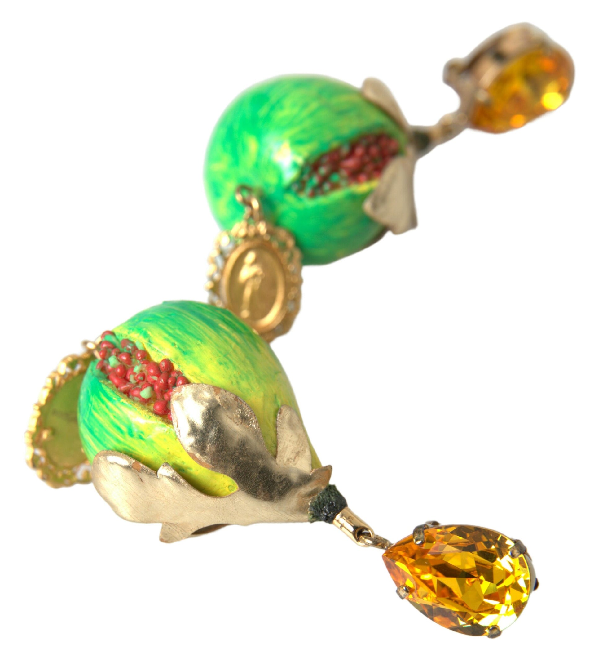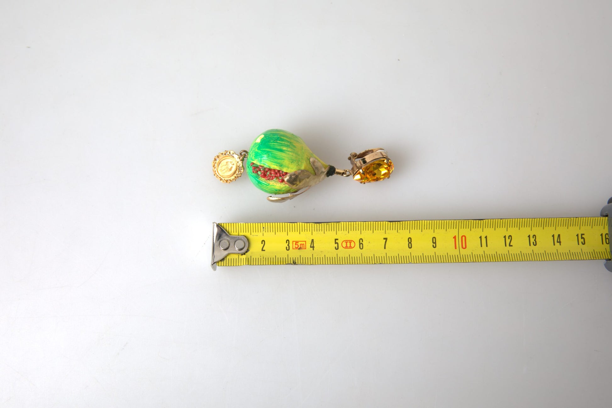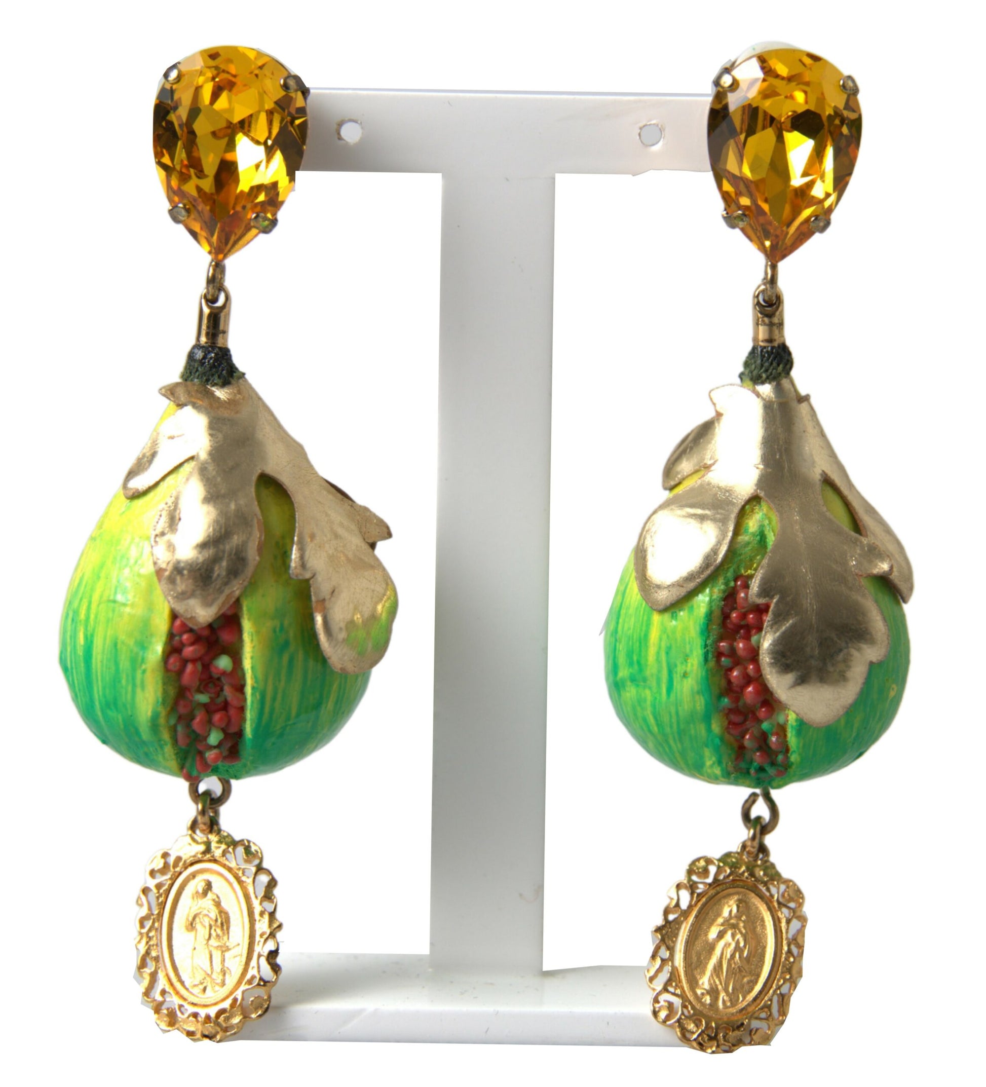 Adorn yourself with the opulence of these exquisite Dolce & Gabbana dangling earrings. A luxe addition to any outfit, these earrings boast a stunning green hue complemented by radiant yellow crystals. Crafted with intricate detail, they feature a charming fig motif, adding a touch of Mediterranean elegance to your look. Whether for a special occasion or to elevate your everyday style, these earrings are sure to turn heads.