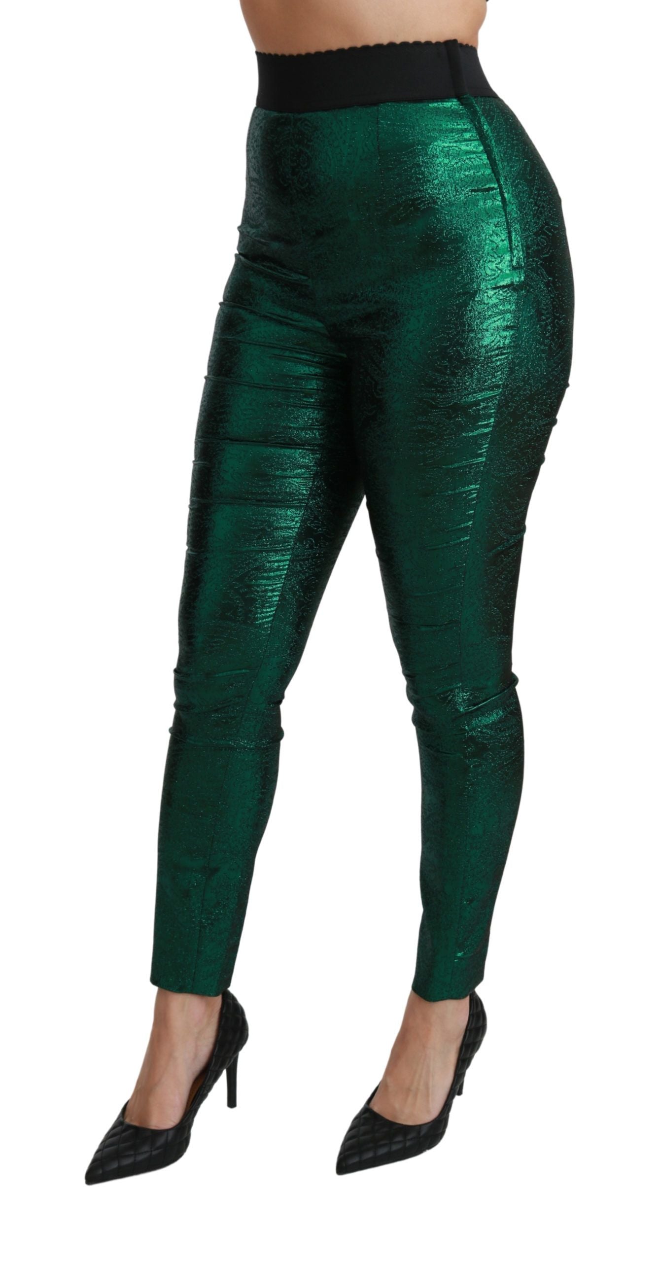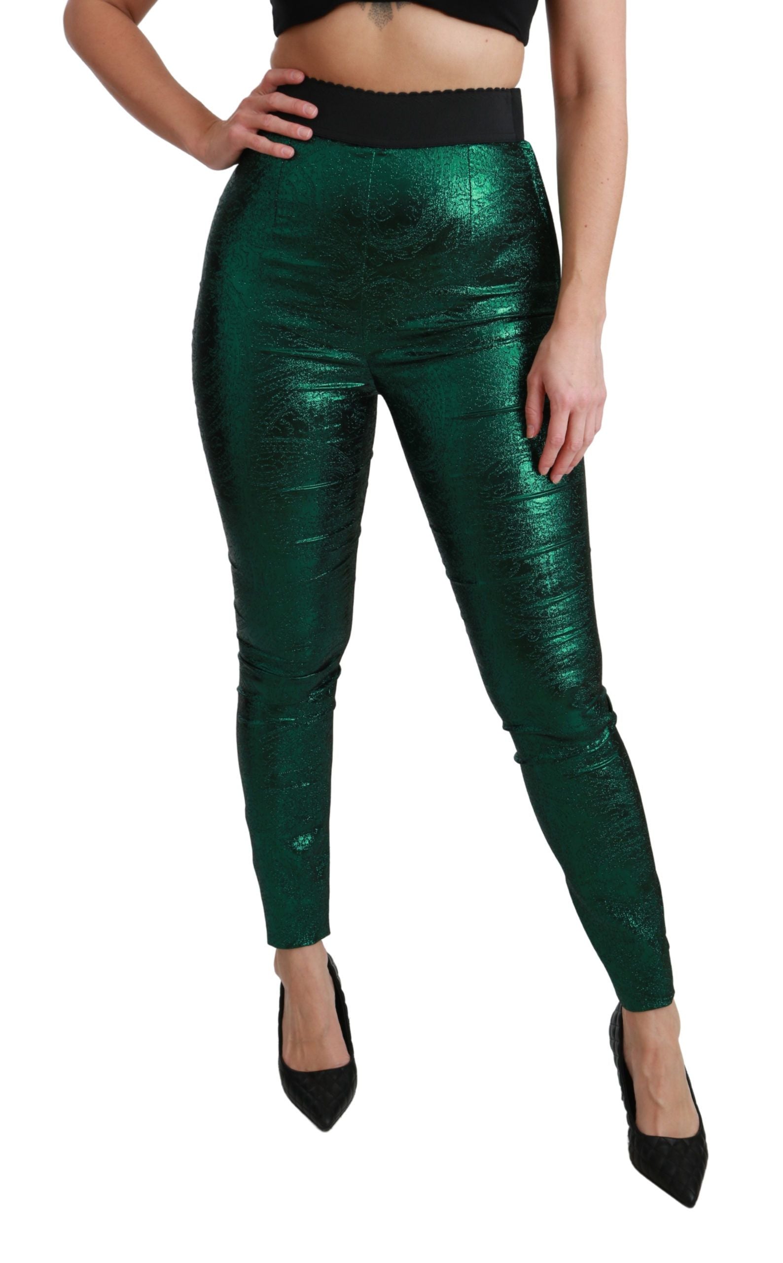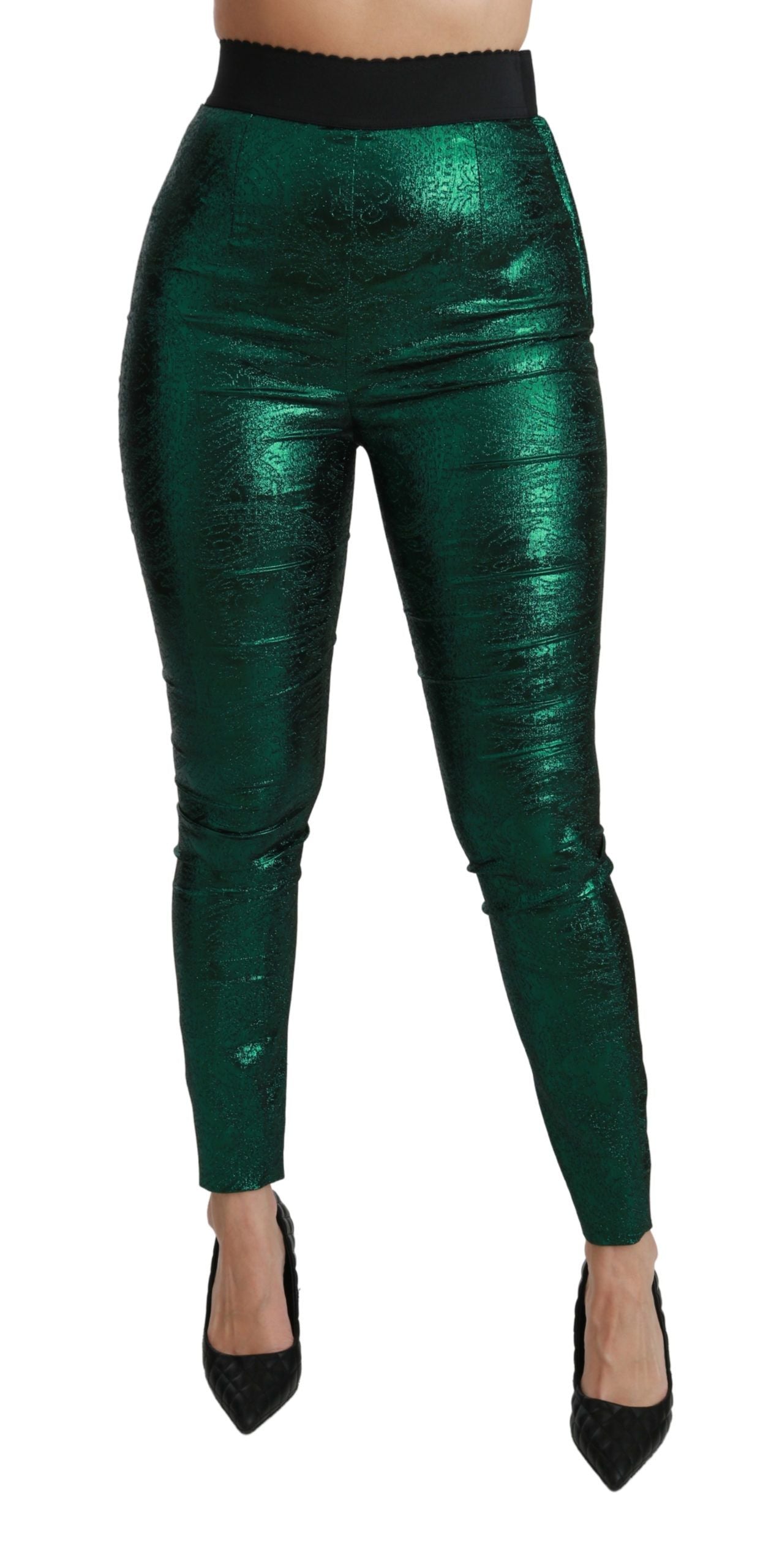 Discover the epitome of Italian craftsmanship with these high-waisted, slim-fit leggings from Dolce & Gabbana . Exuding elegance with their green jacquard design, these pants are a testament to sophisticated style and comfort. Perfect for creating a sleek silhouette, they feature a convenient side zip closure and are adorned with subtle logo details. Made in Italy, these leggings promise to be a staple in your wardrobe, seamlessly blending luxury with everyday wear.
