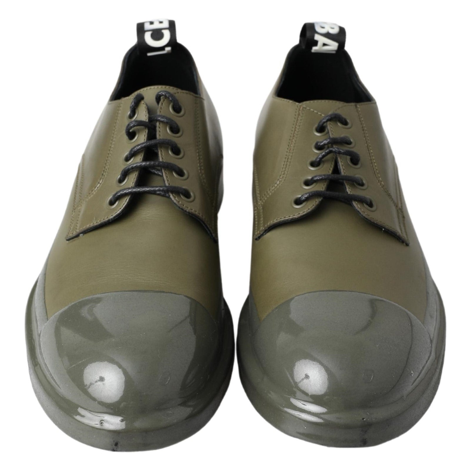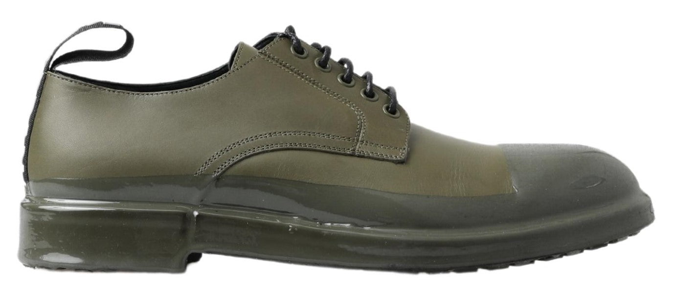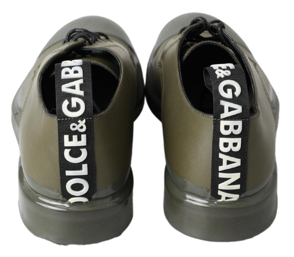 Step into sophistication with these stunning lace-up derby shoes from the prestigious Dolce & Gabbana. Crafted with the finest 100% leather, these shoes boast a vibrant green hue, perfect for those looking to make a sartorial statement. The meticulously designed rubber sole ensures both comfort and durability, while the iconic logo detail adds an extravagant touch. Made in Italy, these shoes are a testament to luxury footwear.