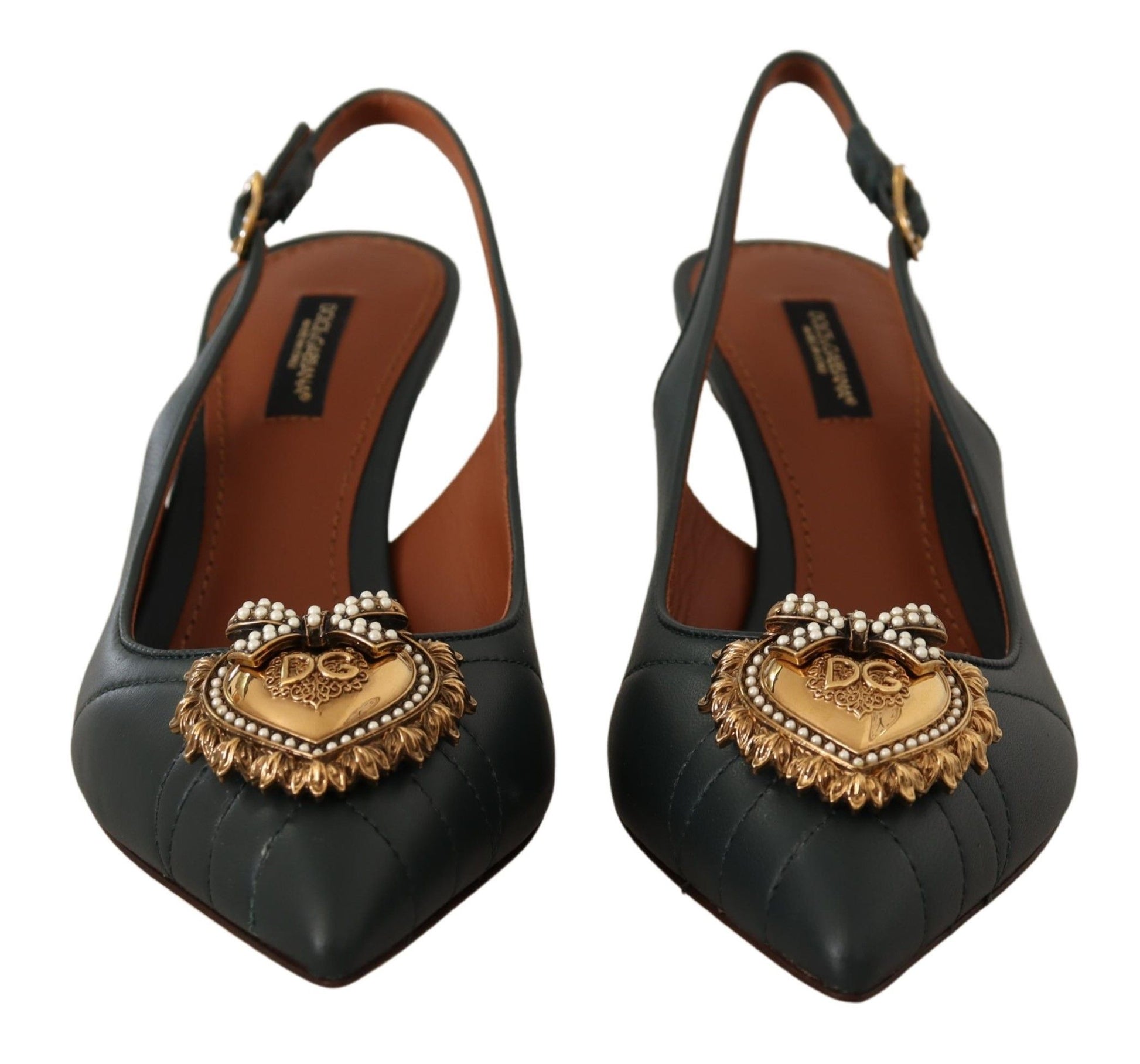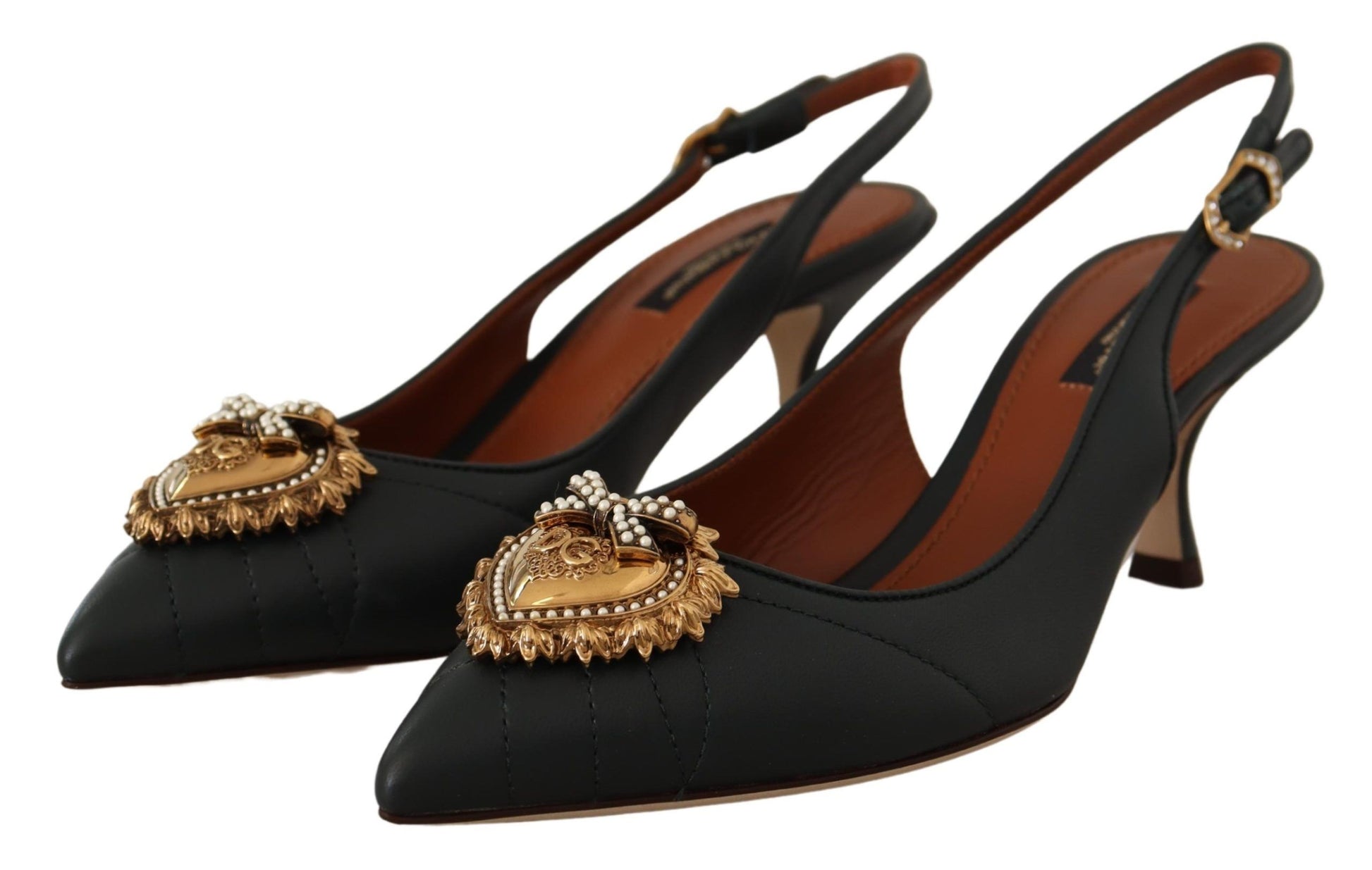 Indulge in the opulence of these Dolce & Gabbana Devotion slingback pumps, crafted for fashion connoisseurs who appreciate timeless elegance paired with a touch of glamour. These striking heels, complete with gold detailing are a testament to luxurious style and comfort. Perfect for any upscale event or adding a splash of color to your everyday wear.