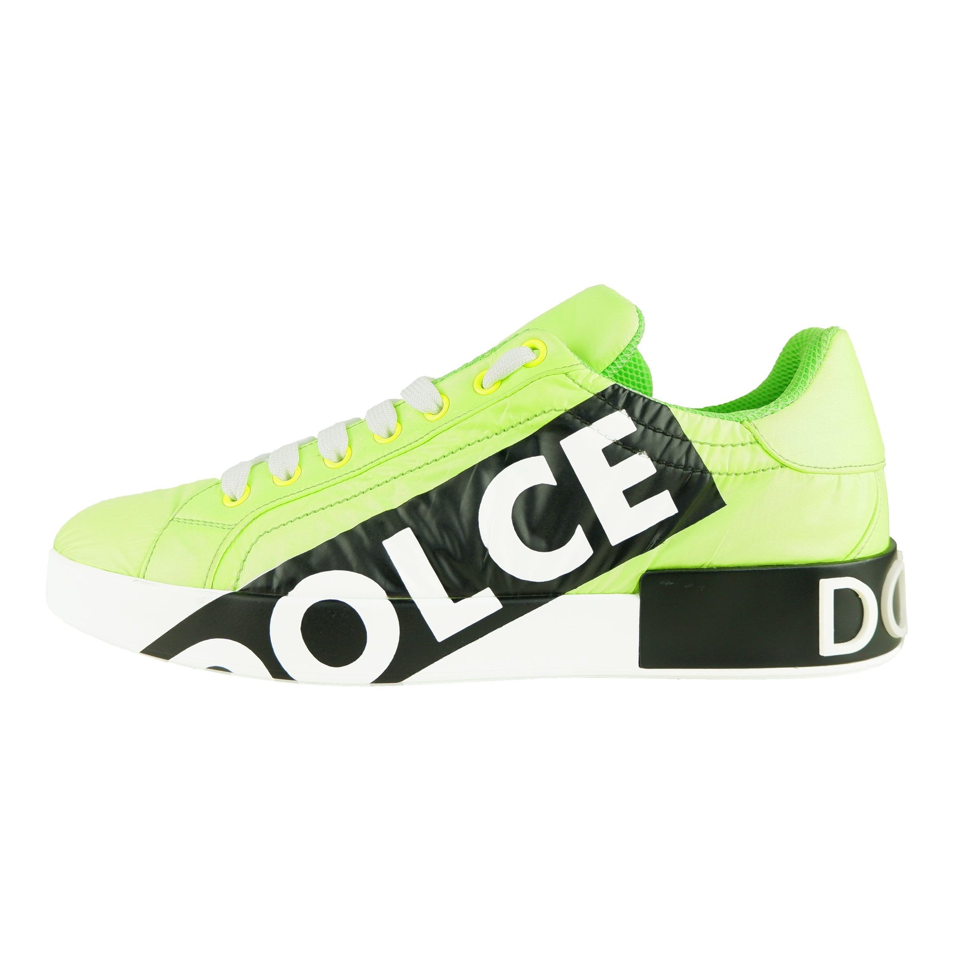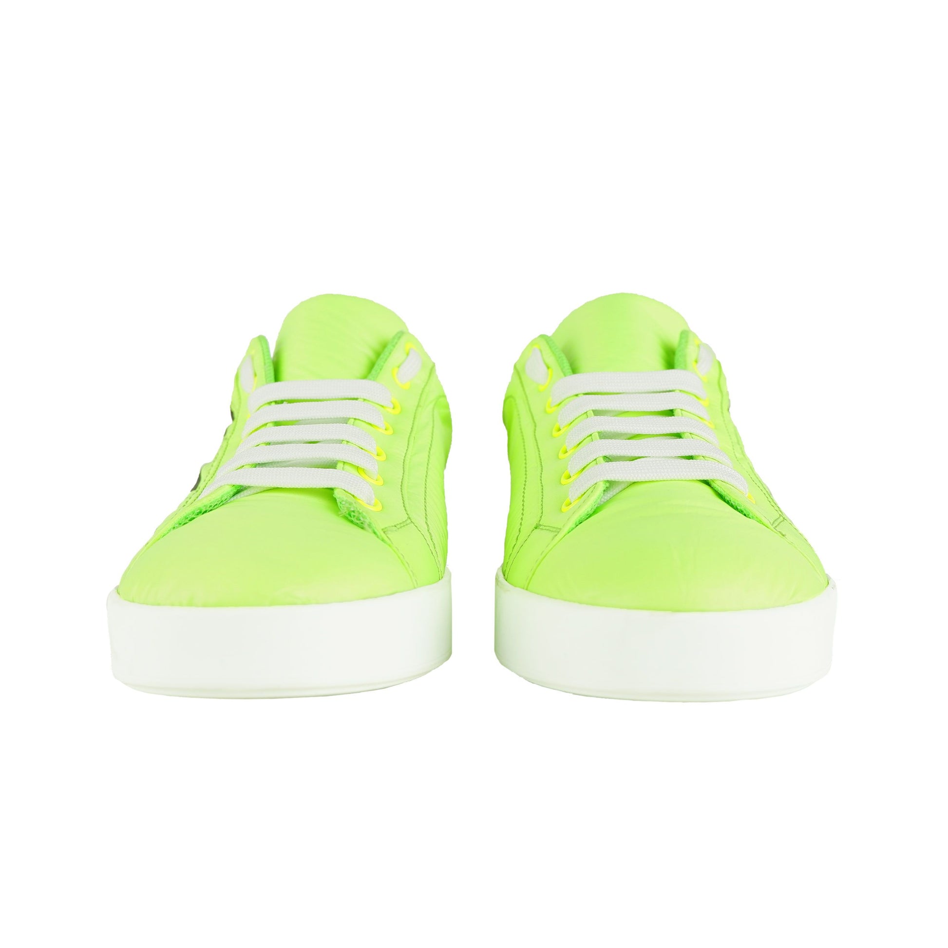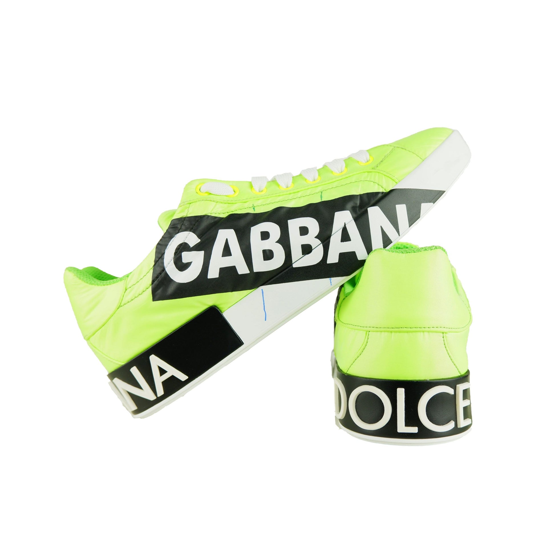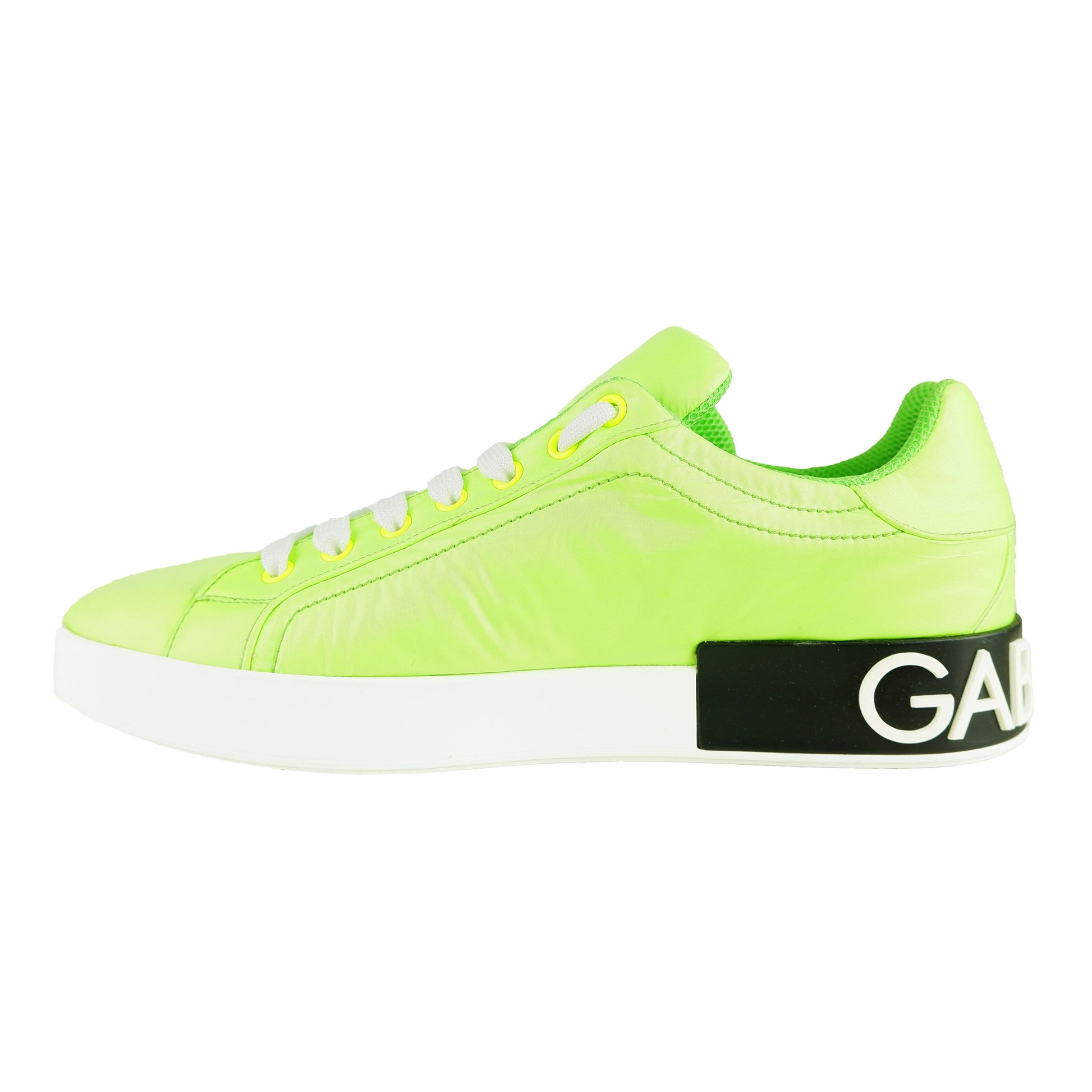 Elevate your shoe game with these bold Dolce & Gabbana men’s sneakers, featuring a fluorescent nylon coating that demands attention. Striking black stripes adorned with the iconic white brand logo accentuate the side panels, whilst the robust sole adds a statement to your stride. These Italian-made sneakers promise both luxury and longevity.