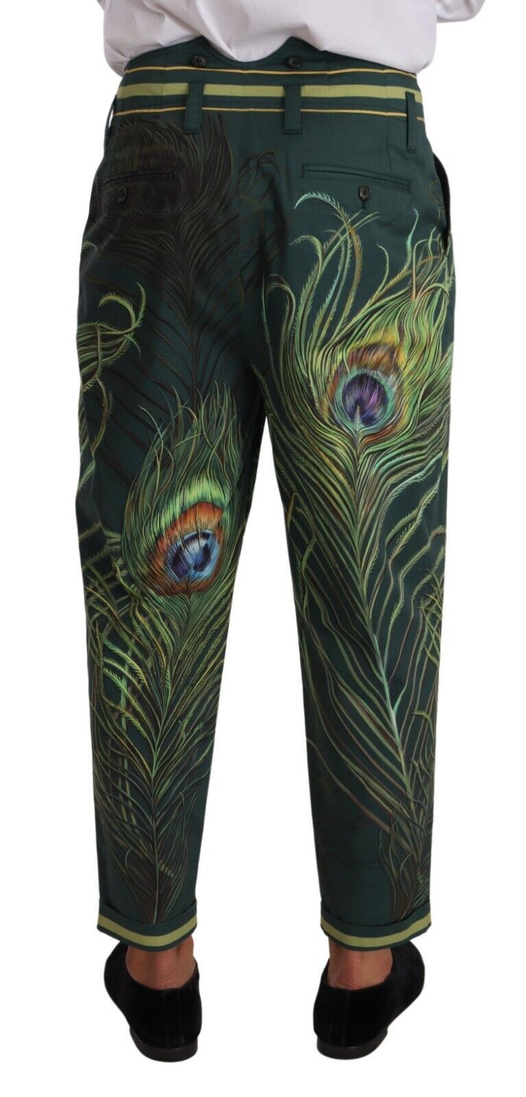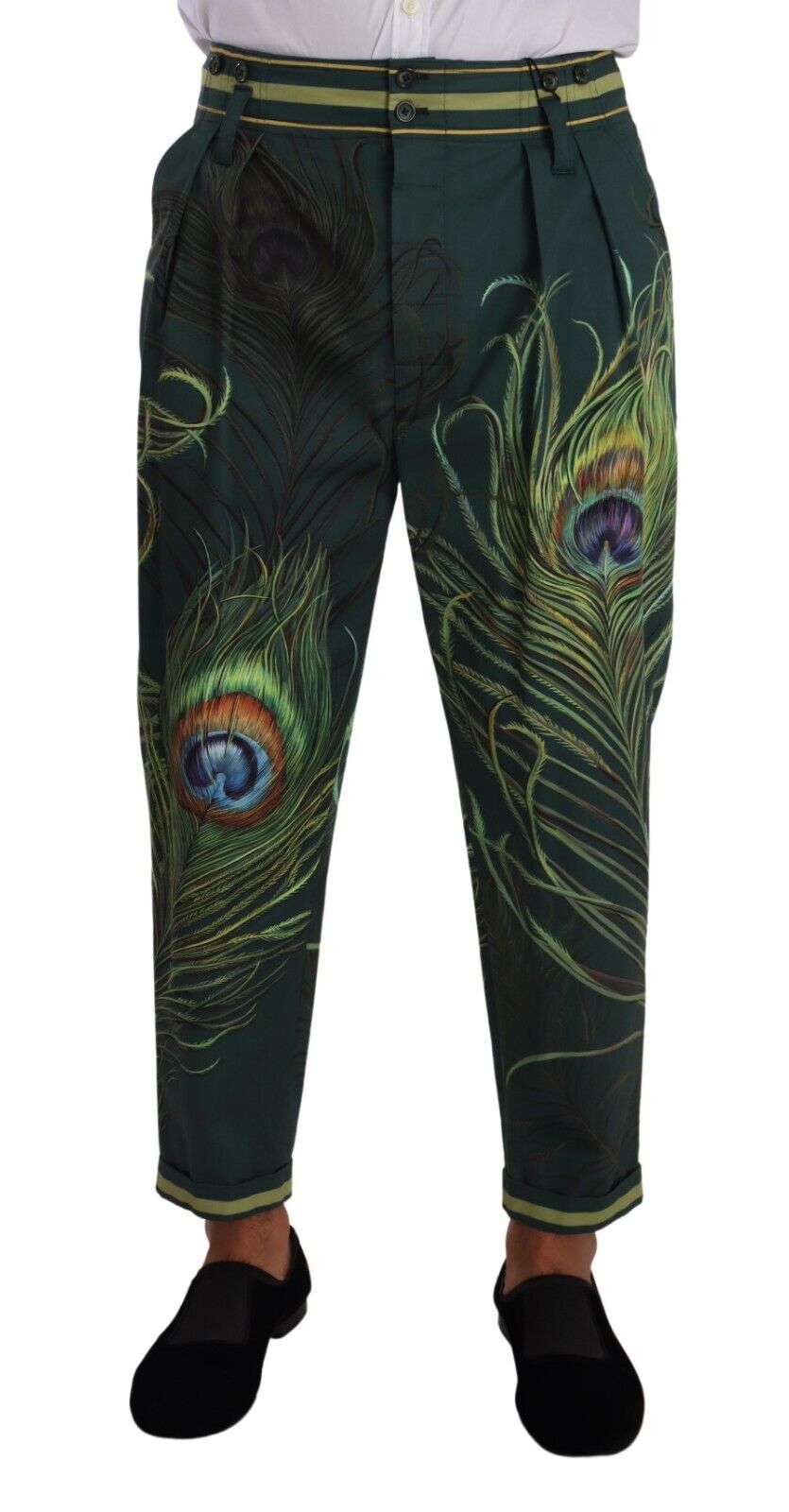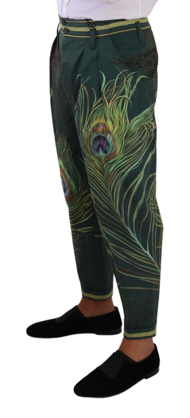 Step into luxury with these exquisite Dolce & Gabbana tapered pants, brand new with tags. Tailored from a rich blend of cotton, these pants boast a vibrant green hue with a stunning peacock feather print, designed to make a statement. With a comfortable regular fit, smart zipper and button closure, and subtle logo details, these trousers are as practical as they are stylish, perfect for any sophisticated wardrobe. Crafted in Italy, embodying the pinnacle of fashion craftsmanship.