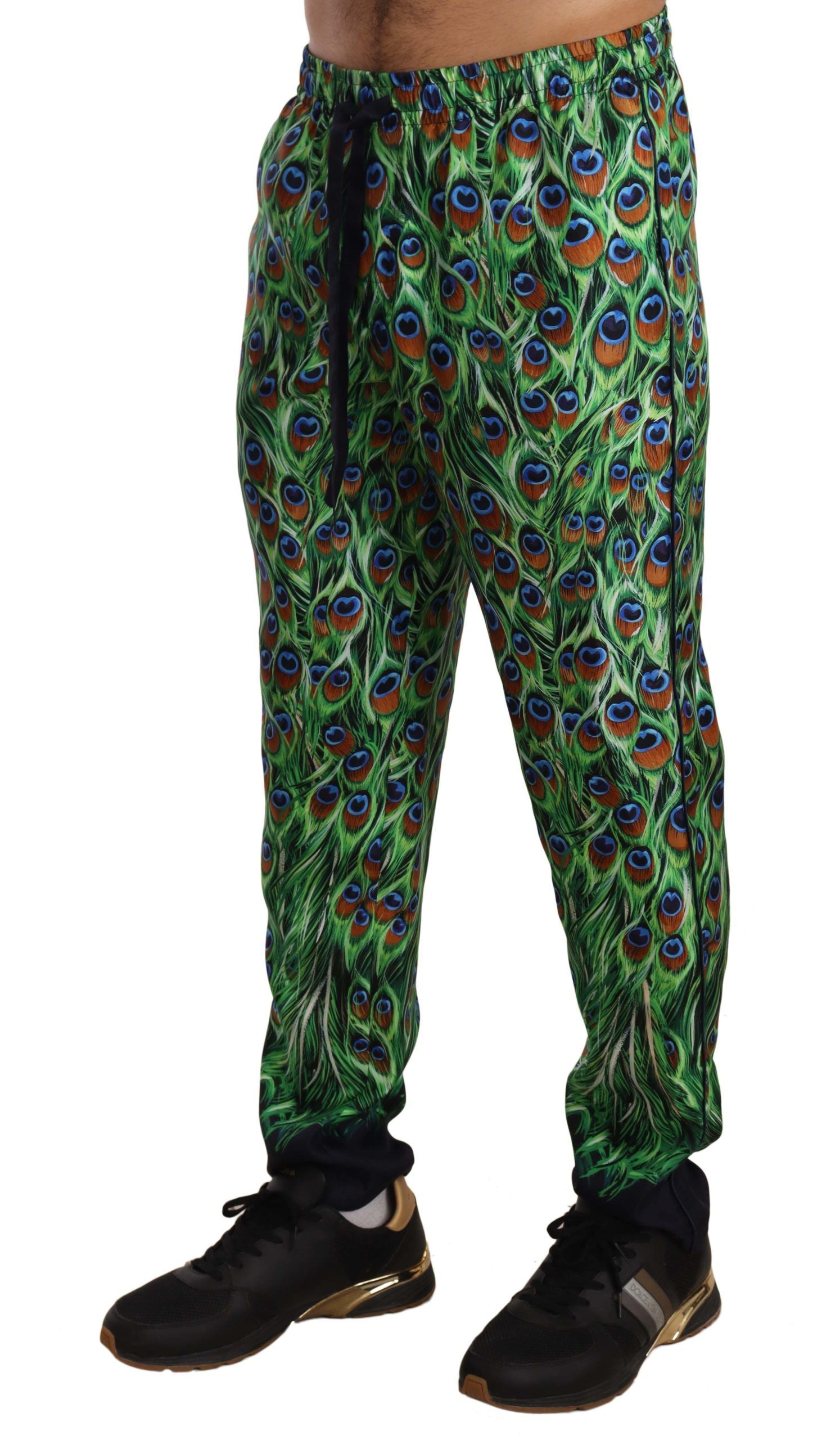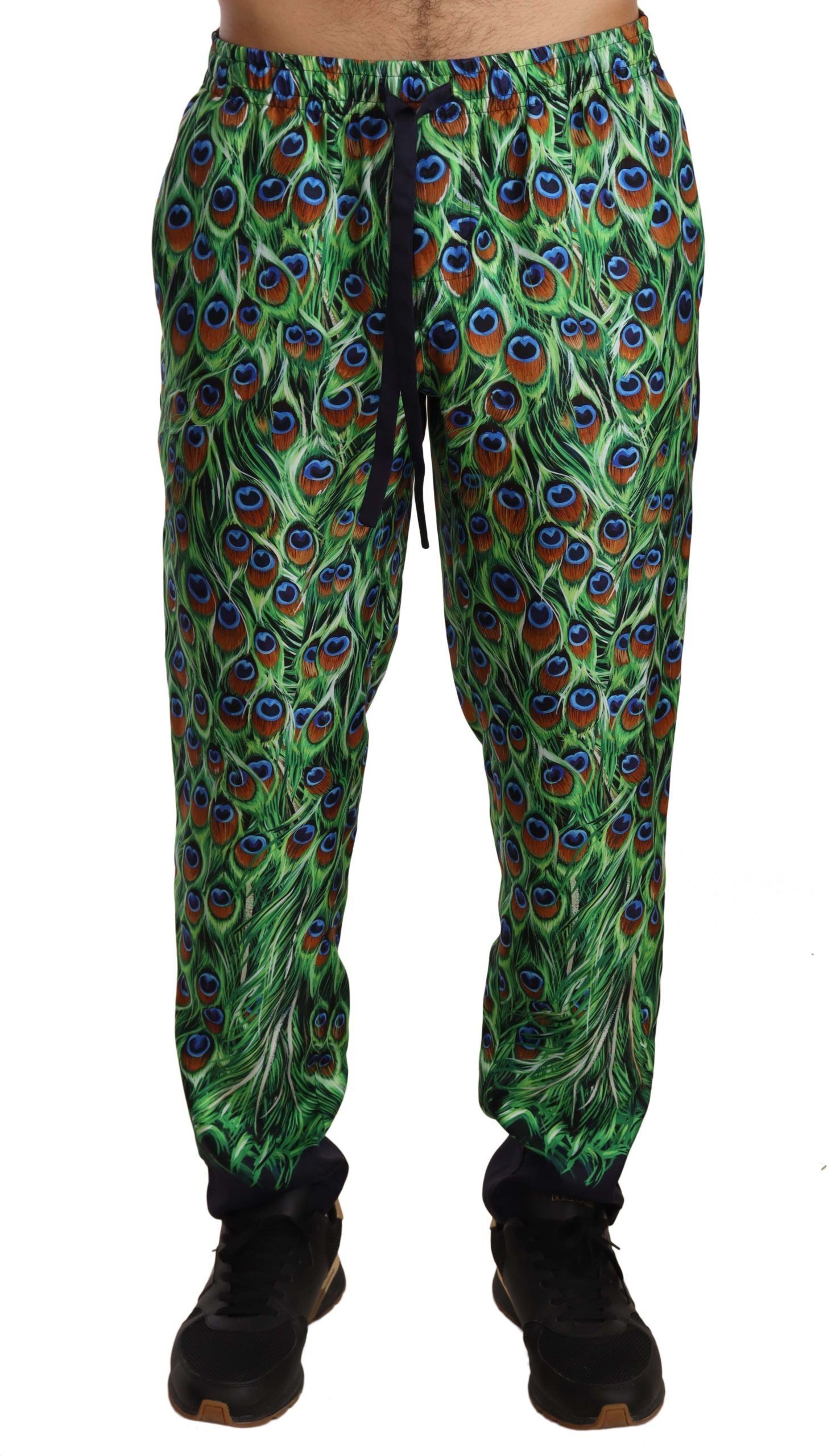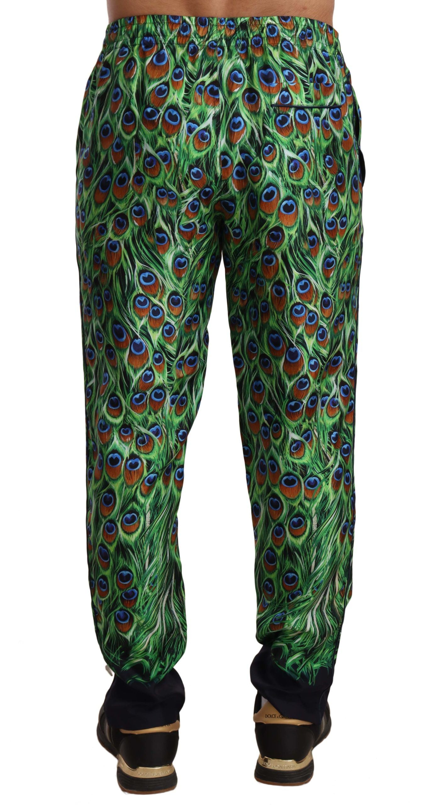 Experience the epitome of luxury loungewear with these exquisite green silk trousers from Dolce & Gabbana, featuring an elegant peacock print. Perfectly balancing comfort with high-end fashion, the trousers come with a drawstring waist for an adjustable fit and a smart straight-leg cut. A rear welt pocket adds functionality without compromising style, while the distinctive Dolce & Gabbana logo assures quality and prestige.