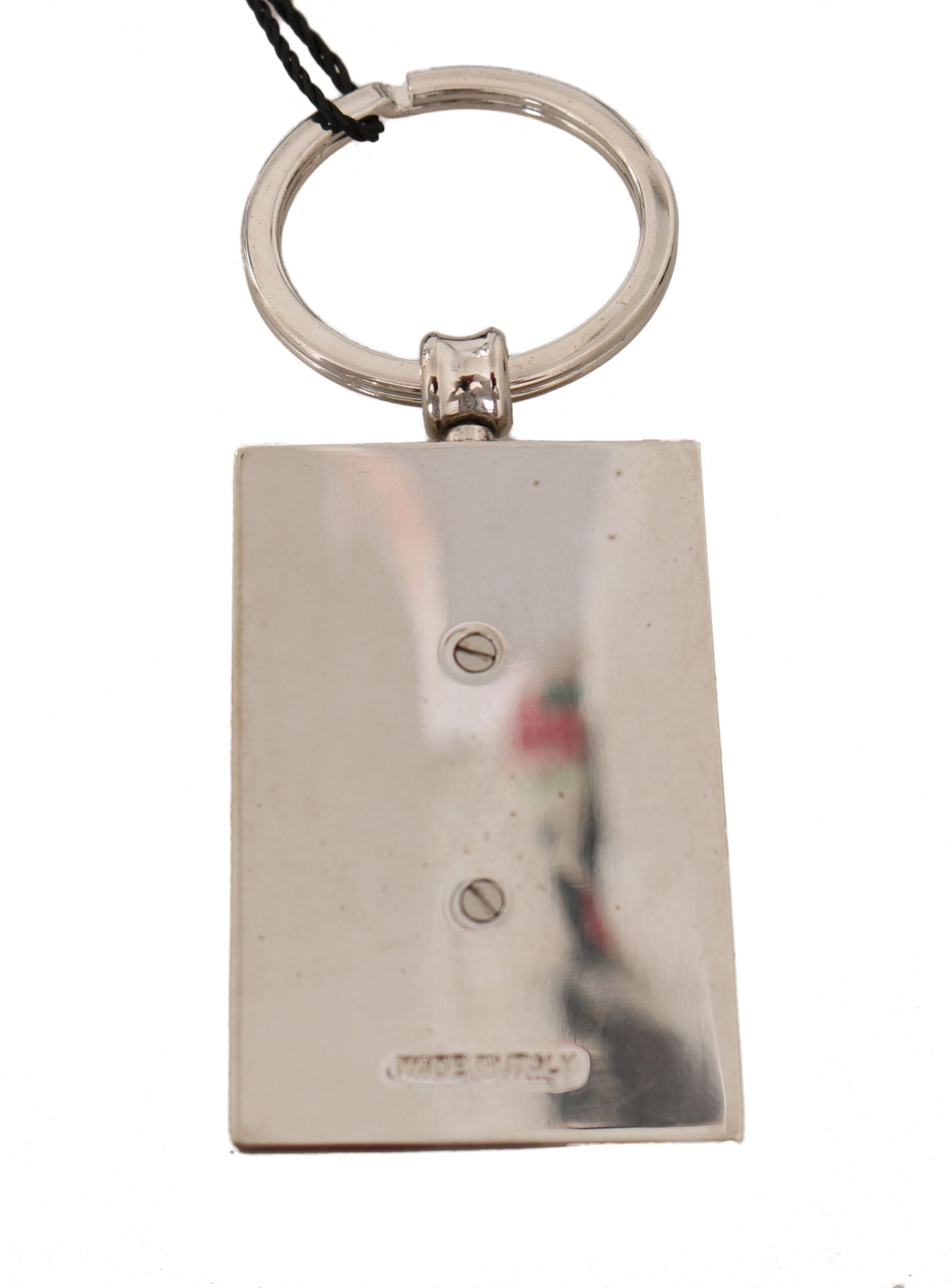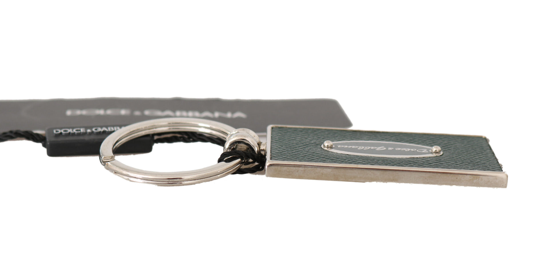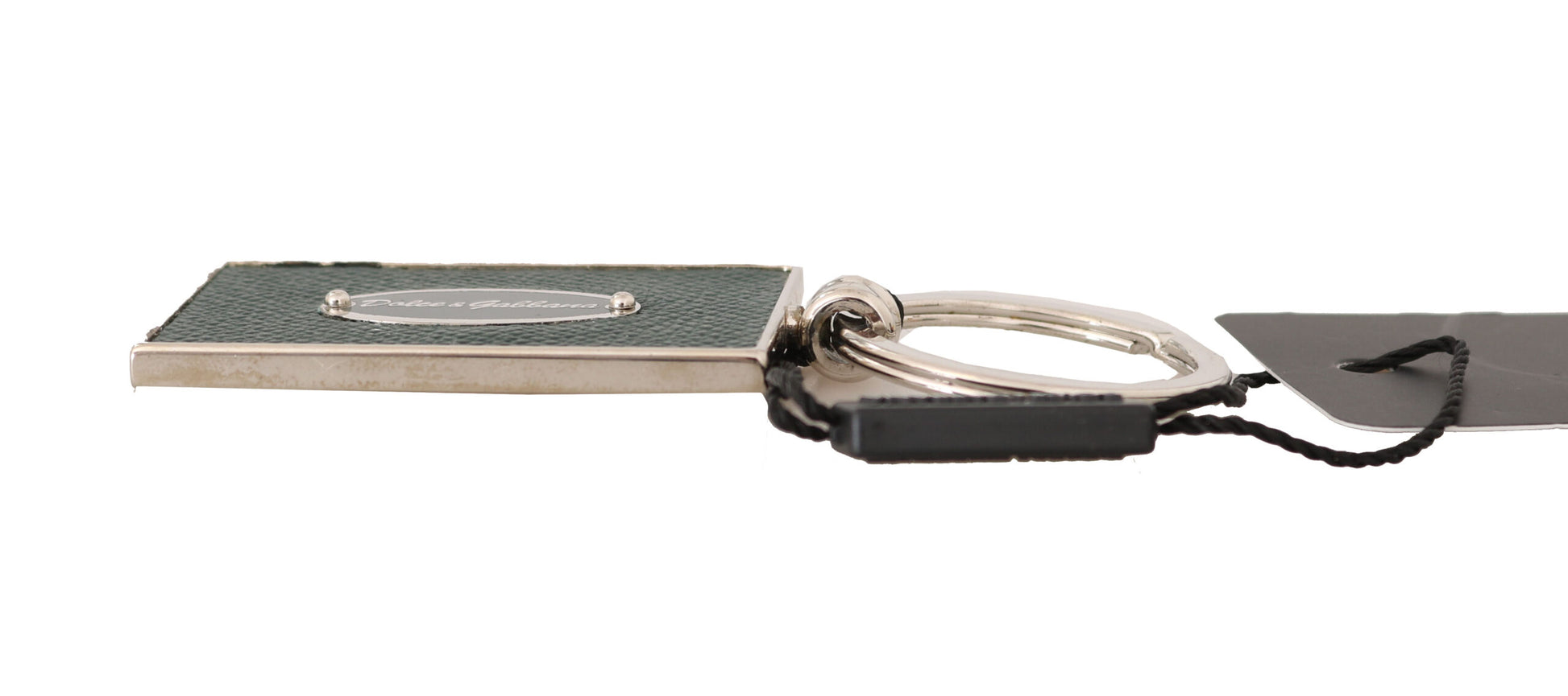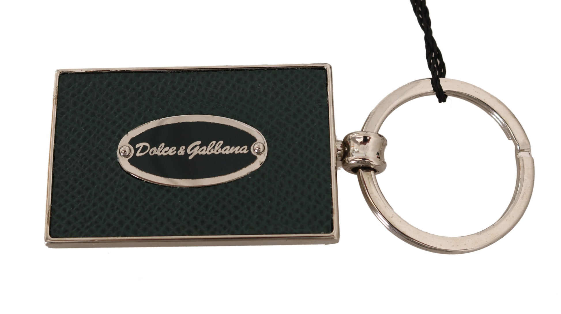 Elevate your essentials collection with this Dolce & Gabbana keychain. Crafted from sumptuous leather in a vibrant green hue and complemented by silver accents, this accessory exudes sophistication while keeping your keys secure. Its logo-engraved metal hardware reflects the brand’s attention to detail, making it a perfect blend of functionality and style. Handmade in Italy, it’s not just a keychain but a statement of luxury.