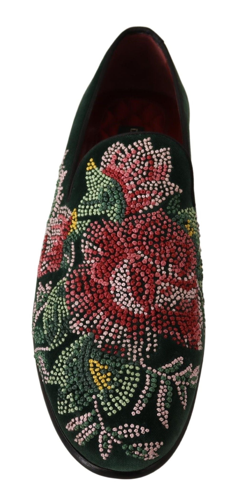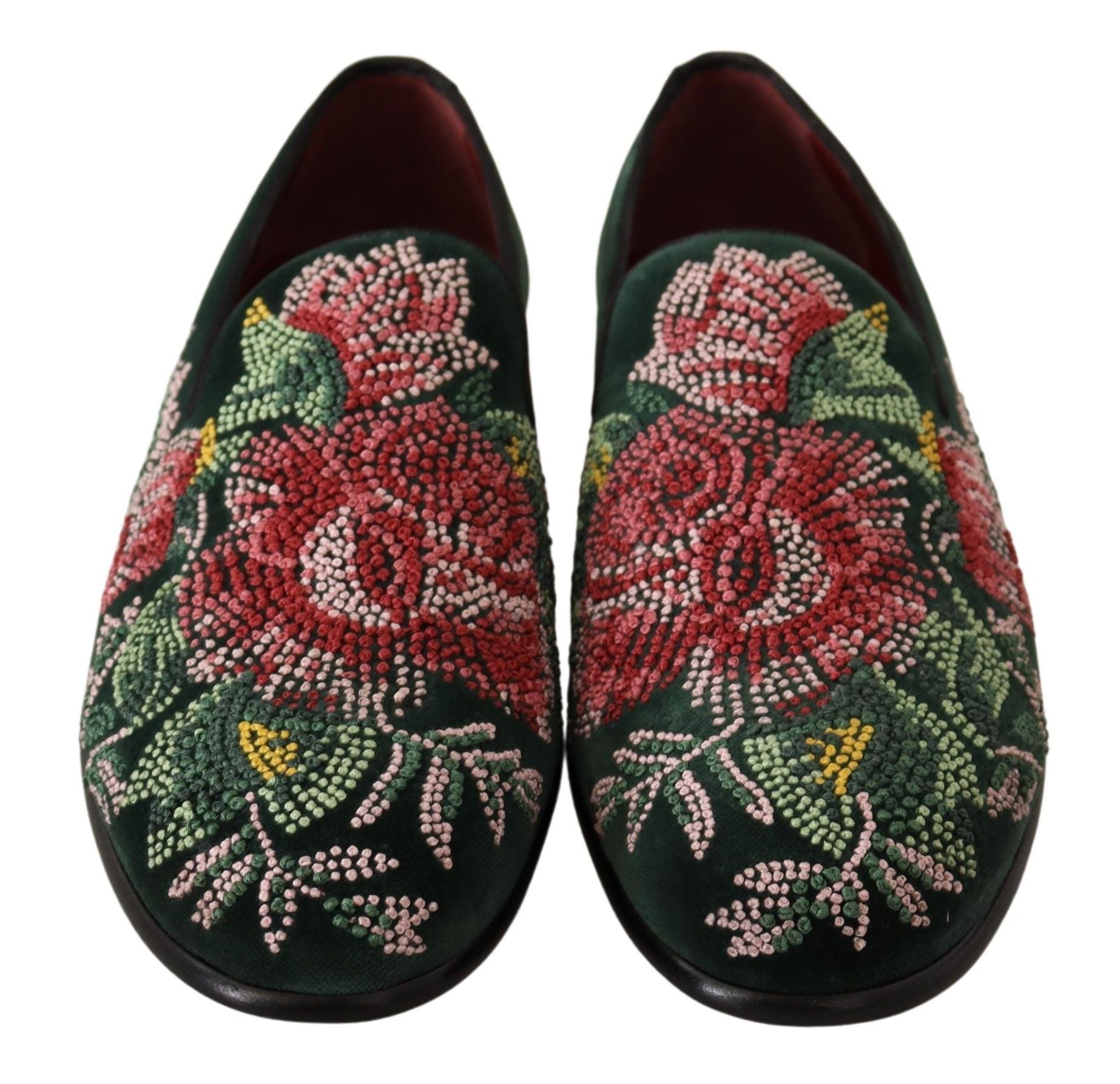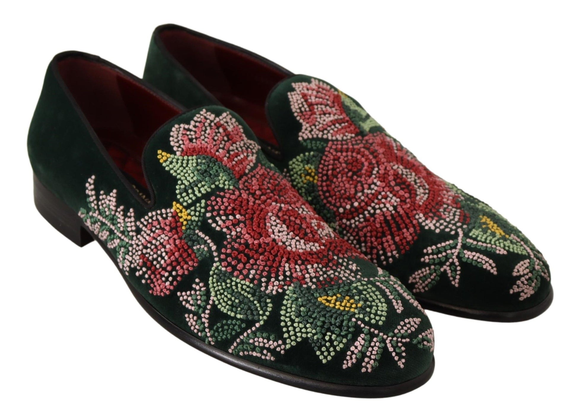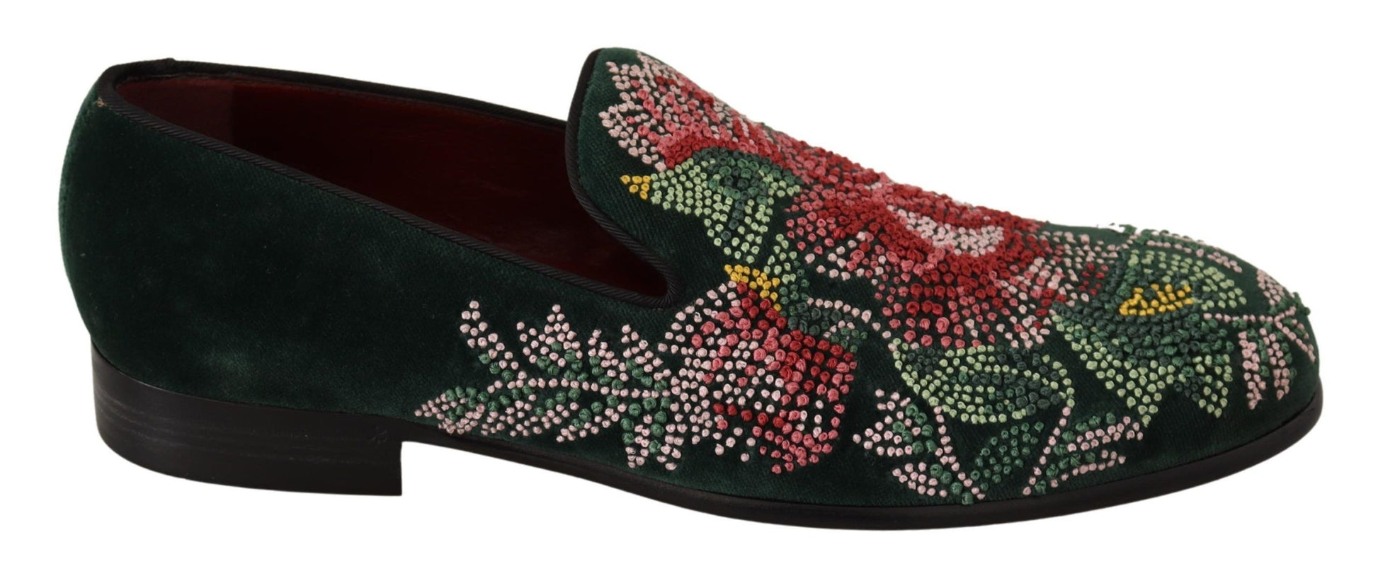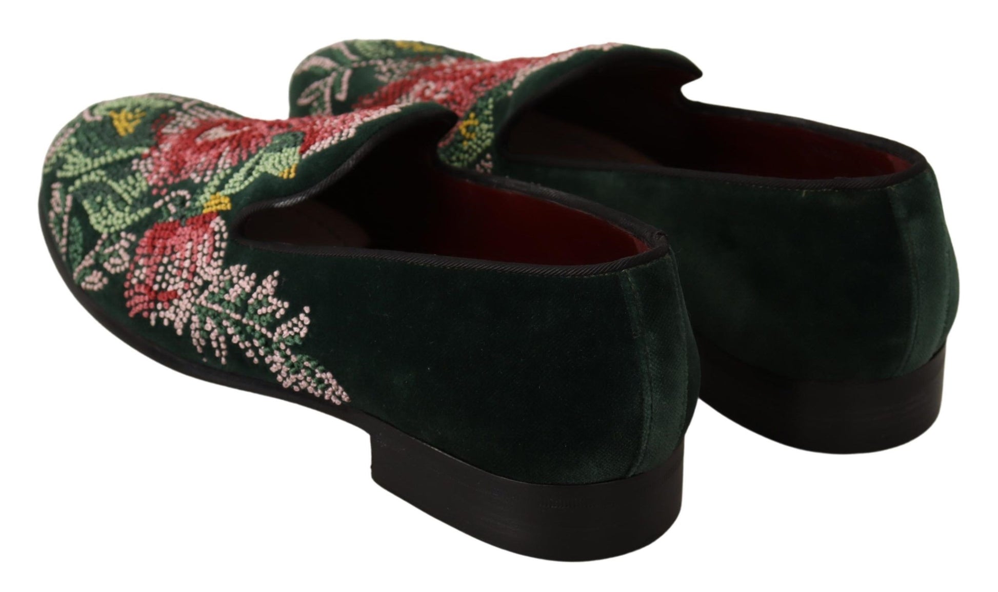 Step into luxurious comfort with these opulent Emerald Velvet Embroidered Loafers by Dolce & Gabbana. Meticulously crafted with a plush velvet cotton material, these shoes don’t just whisper but shout high craftsmanship and exclusive style. The vibrant green hue serves as the perfect backdrop to multicolored embroidery and sequined details that elevate this footwear to a piece of art. Constructed with a refined leather sole and adorned with logo details, these loafers are a true testament to Italian artisanship, ready to enhance your wardrobe.