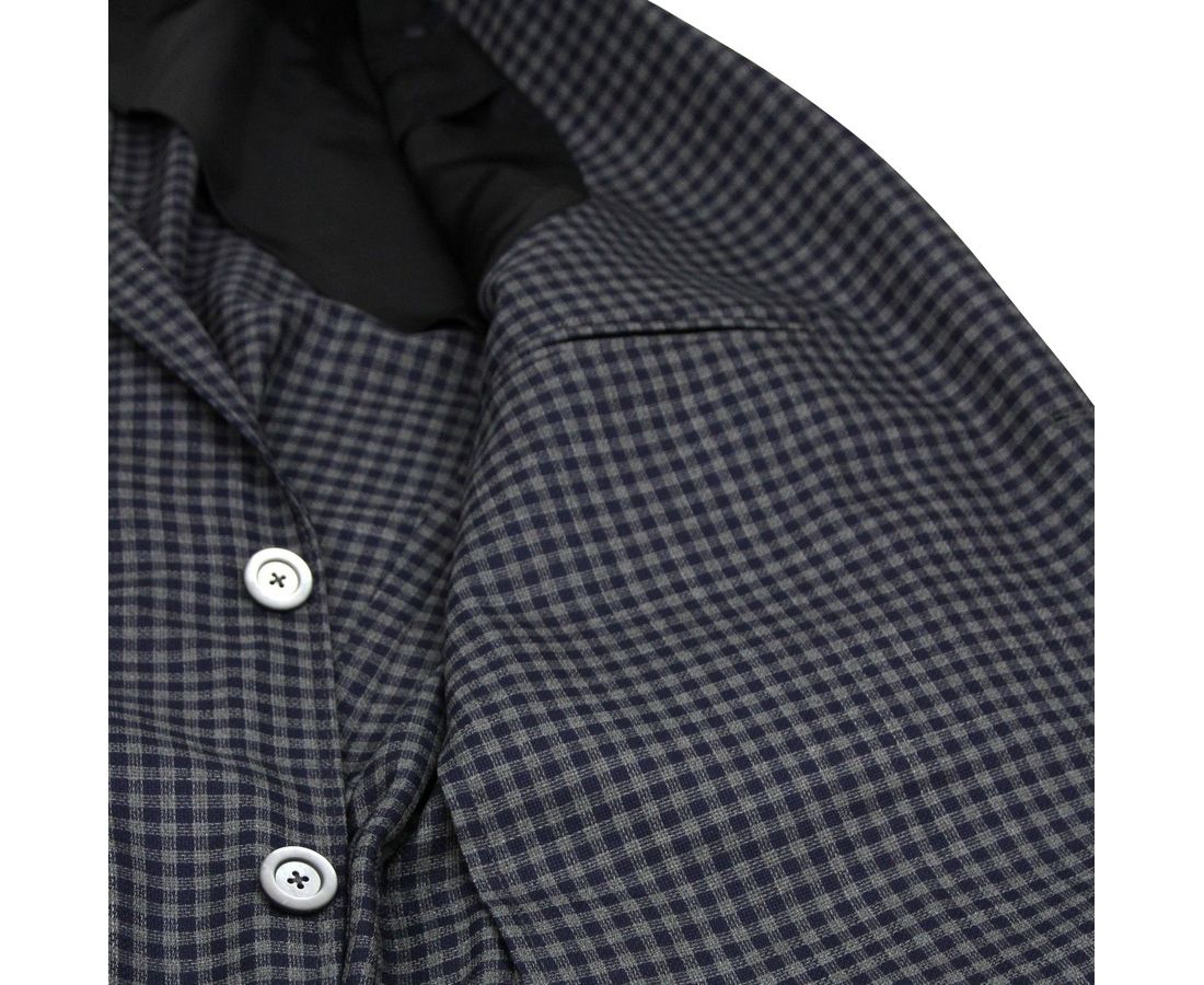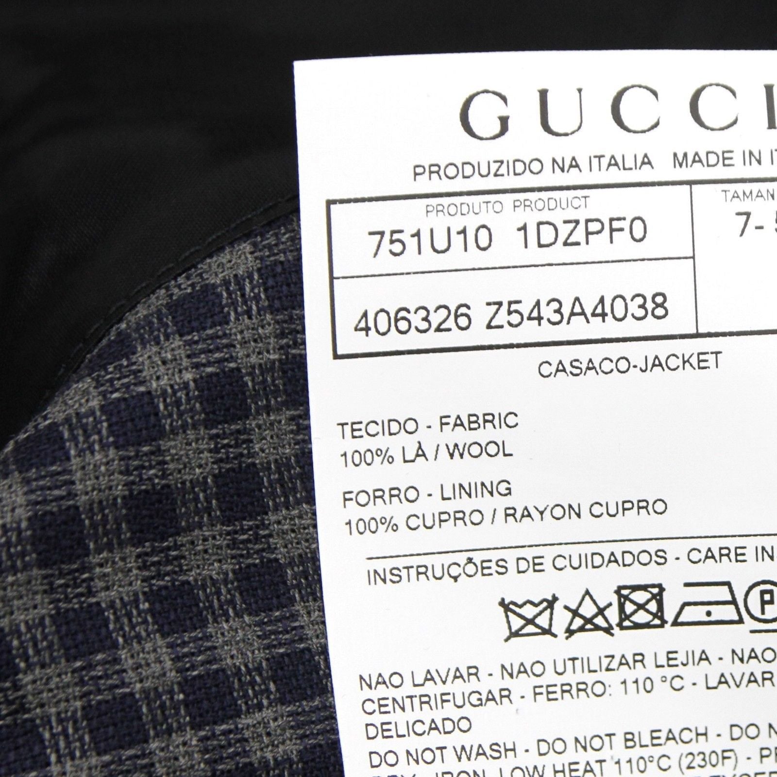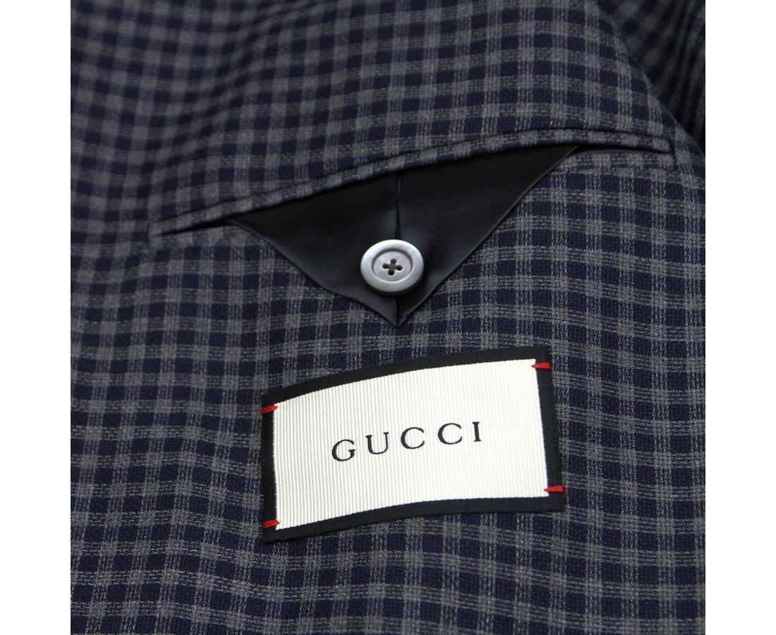 100% Wool, Checkered formal jacket; Jacket Length: Regular; No lining, 2 buttons, 1 vent; Style: Two Button; Measurements: 52 R; Shoulder: 18 4/8; Sleeve: 28; Chest: 22; Waist: 20 2/8; Total Length: 29 6/8 inches; Original Gucci tags and authenticity card included; Made in Italy