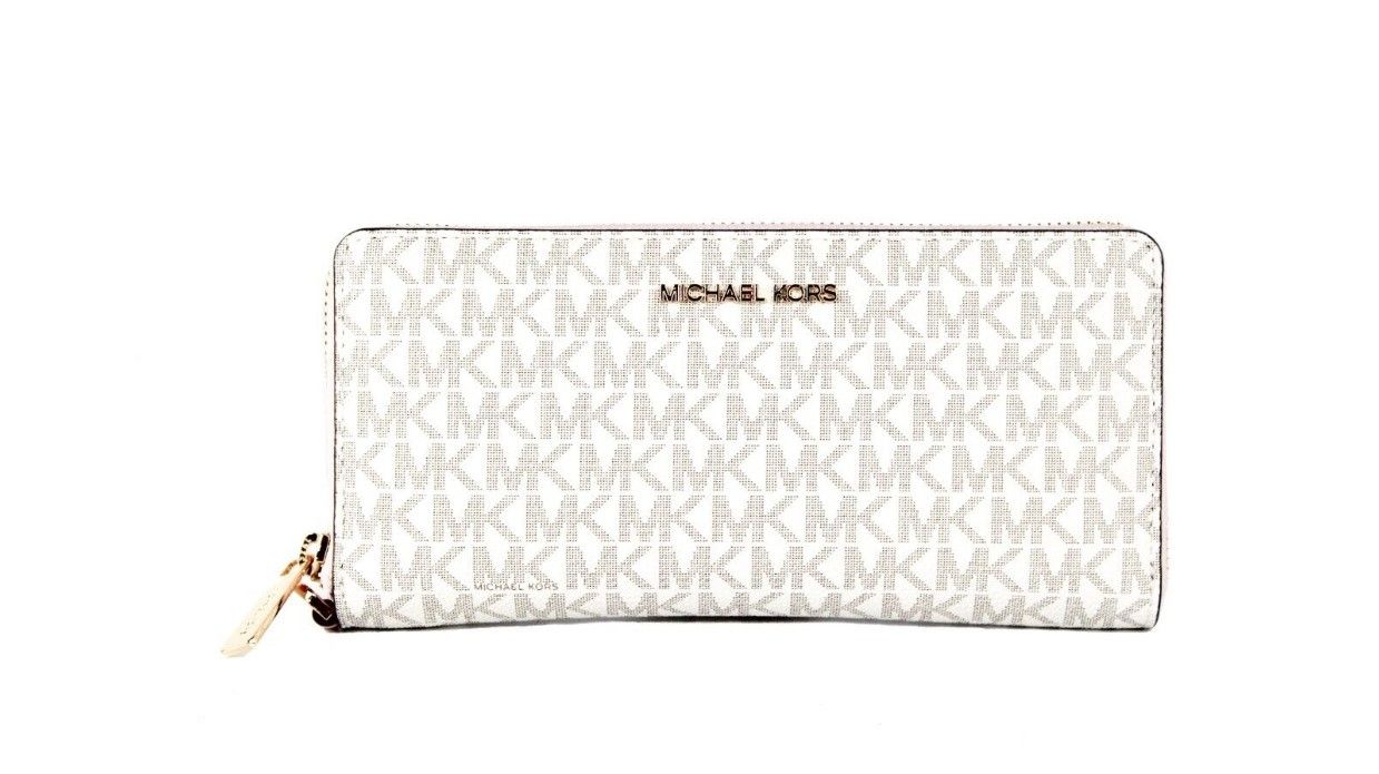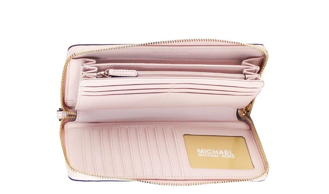 Features: Michael Kors Front Logo Plate, 5.5" Detachable Wristlet Strap, 16 Card Slots, 1 ID Window, 1 Zip Coin Compartment, 5 Full Length Bill Slots