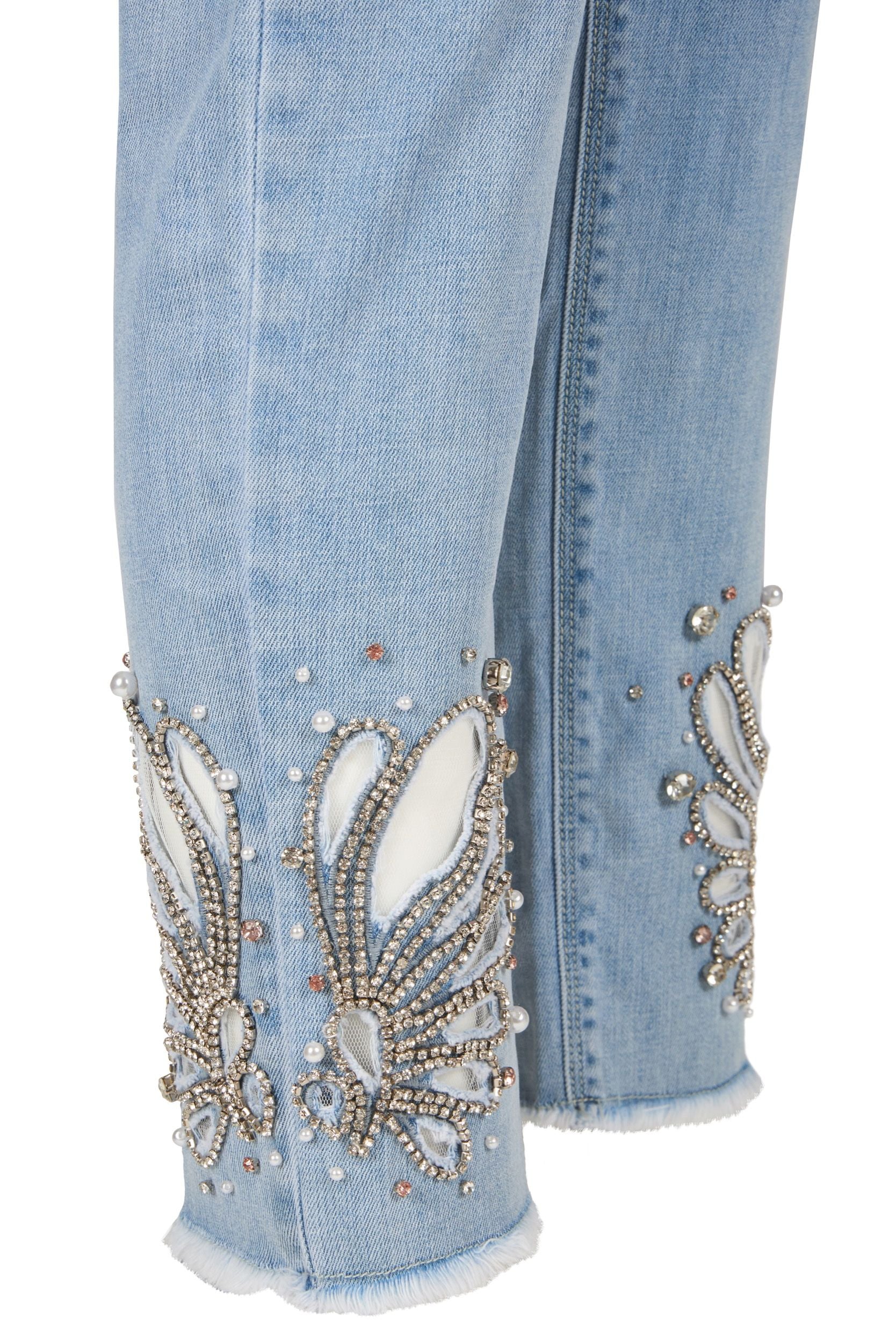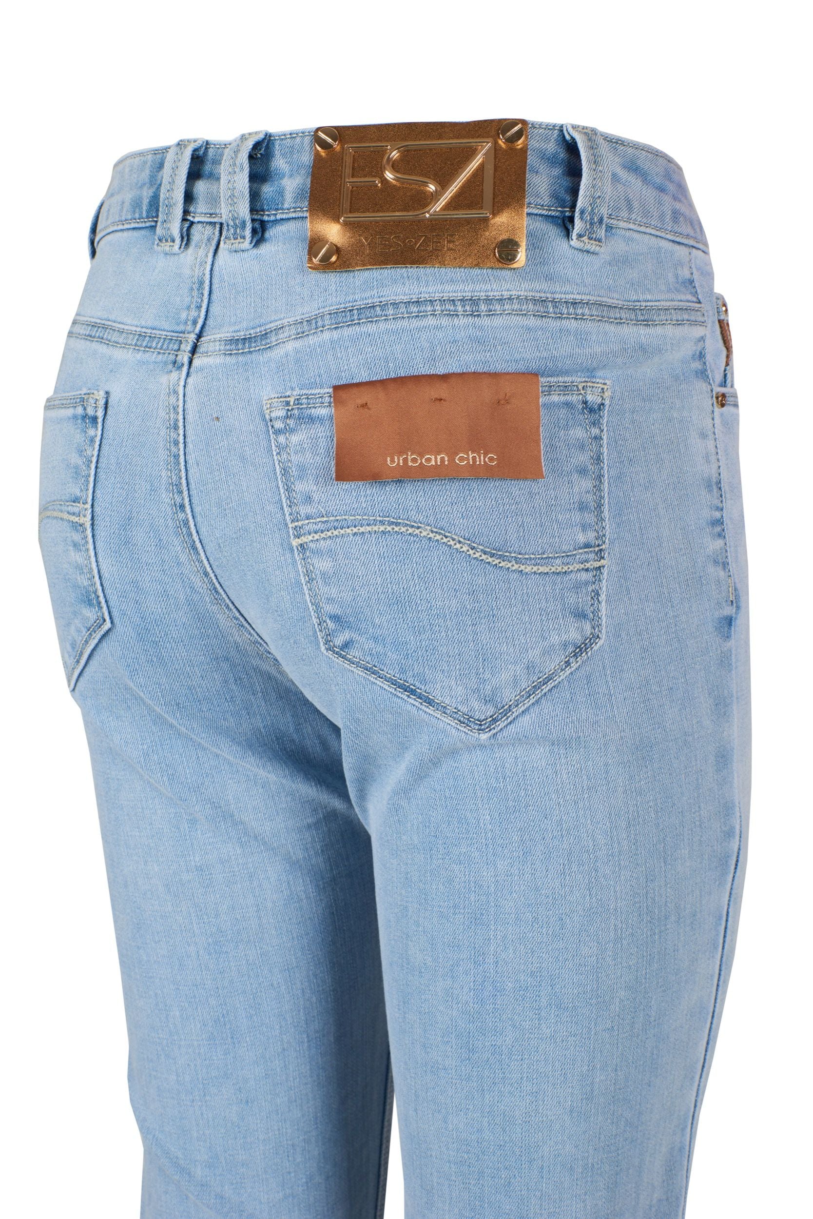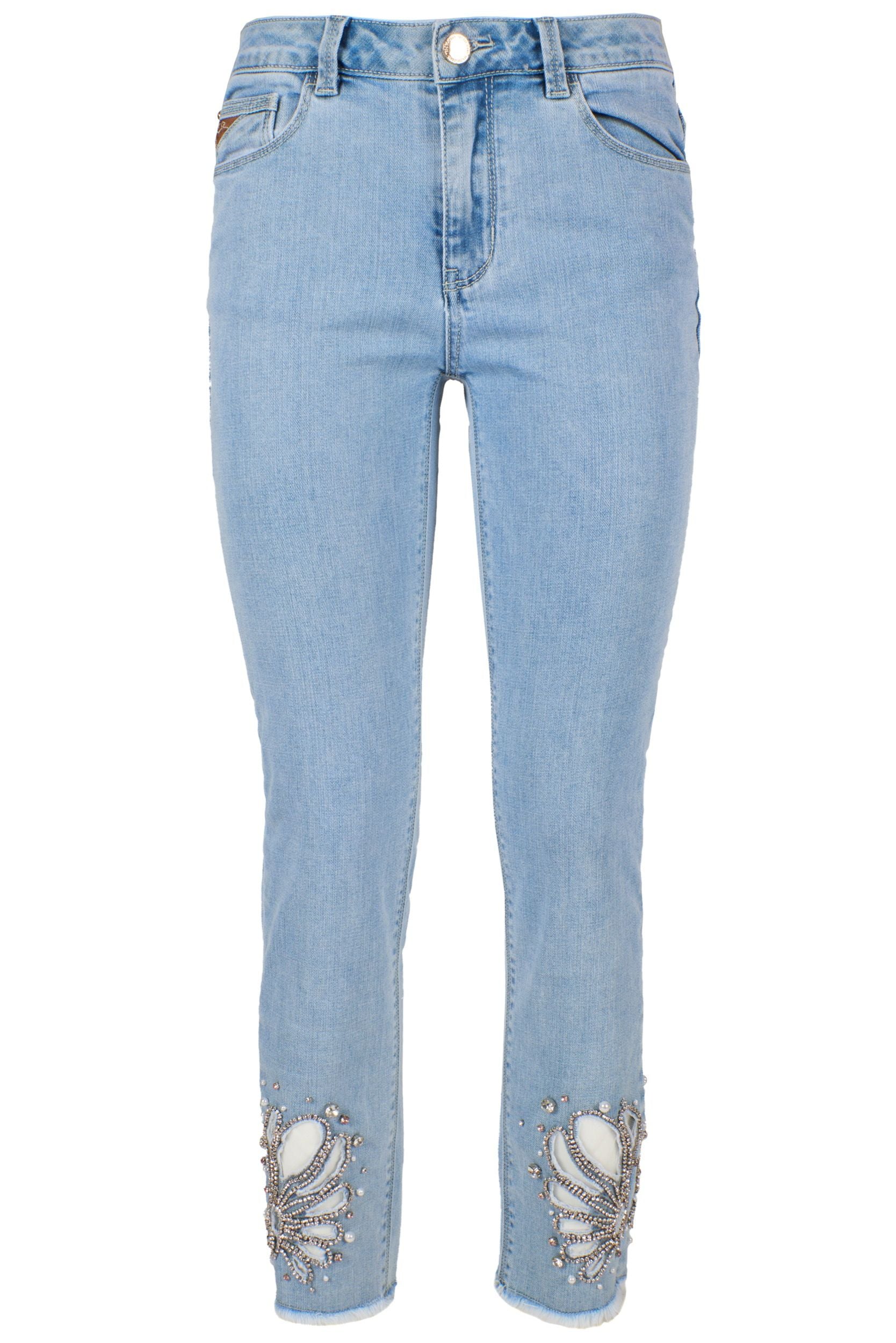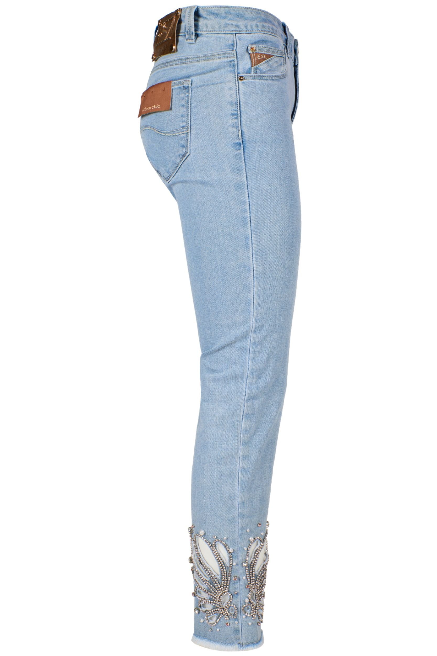 Step out in style with our light blue slim-fit denim, adorned with a gold patch for an elevated touch. The lower part of the jeans dazzles with shining strass, adding a playful sparkle to your every move. Crafted for both comfort and fashion, these jeans are a versatile addition to your wardrobe, perfect for day-to-night looks.