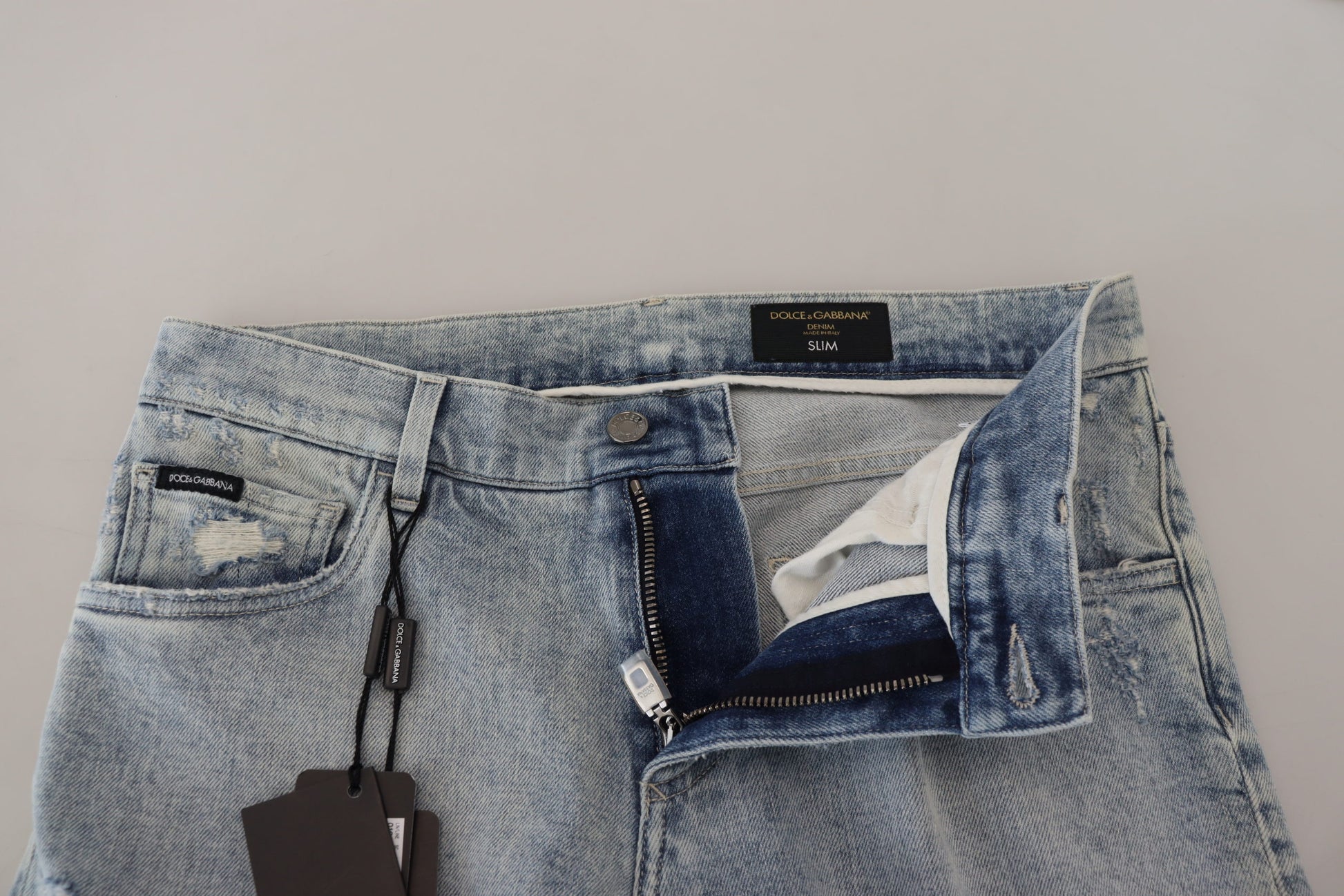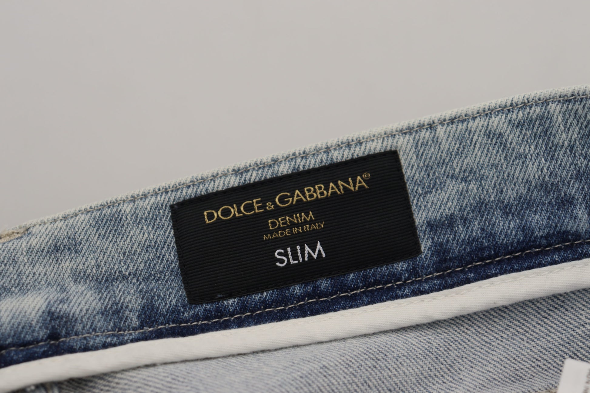 Elevate your wardrobe with these essential slim-fit denim pants, a staple for any style-conscious individual. Crafted from high-quality cotton blend for comfort and durability, these jeans feature a classic light blue hue that pairs seamlessly with any ensemble. Designed by the renowned fashion house, Dolce & Gabbana, these pants are a testament to chic sophistication and casual elegance.