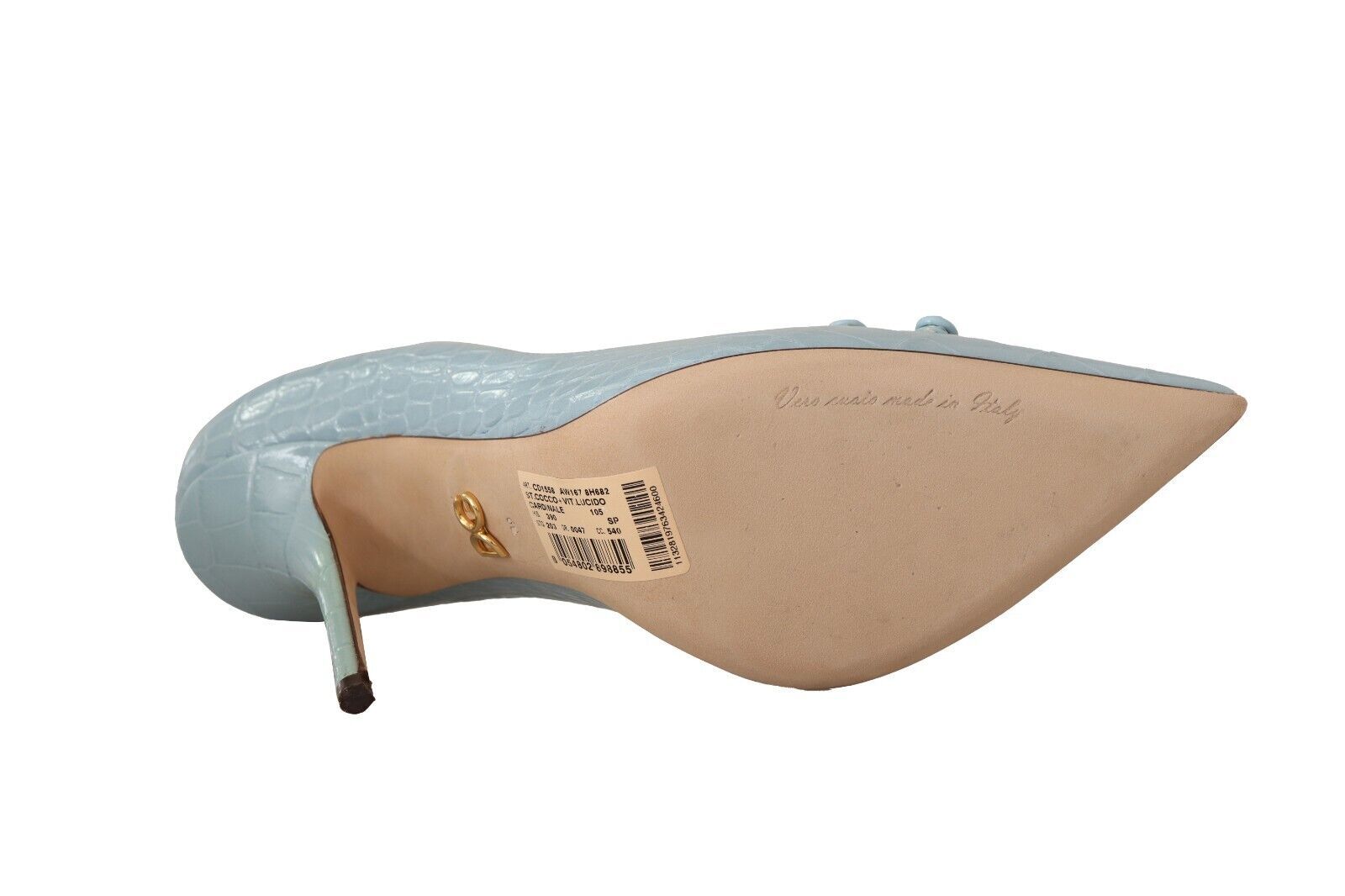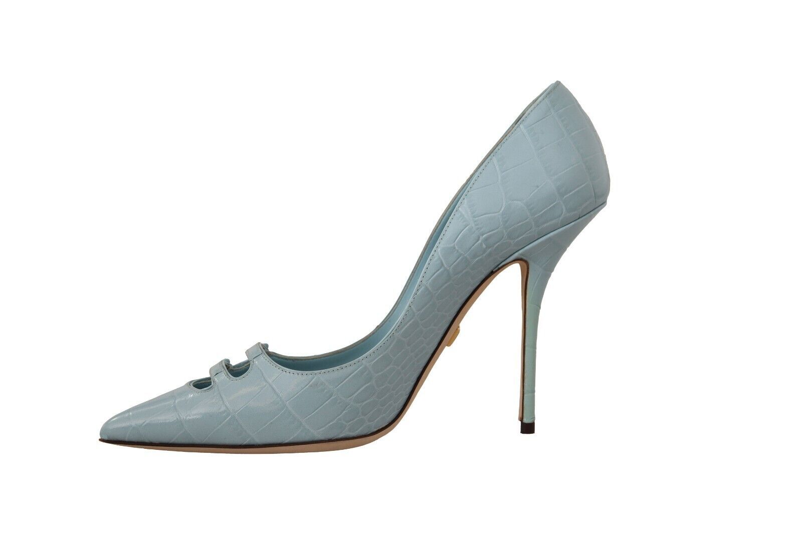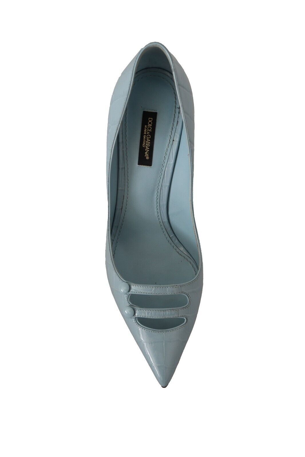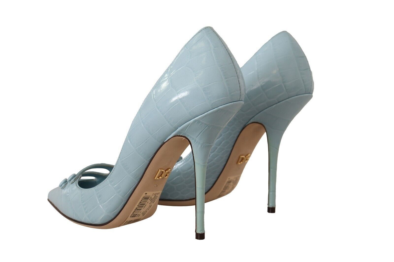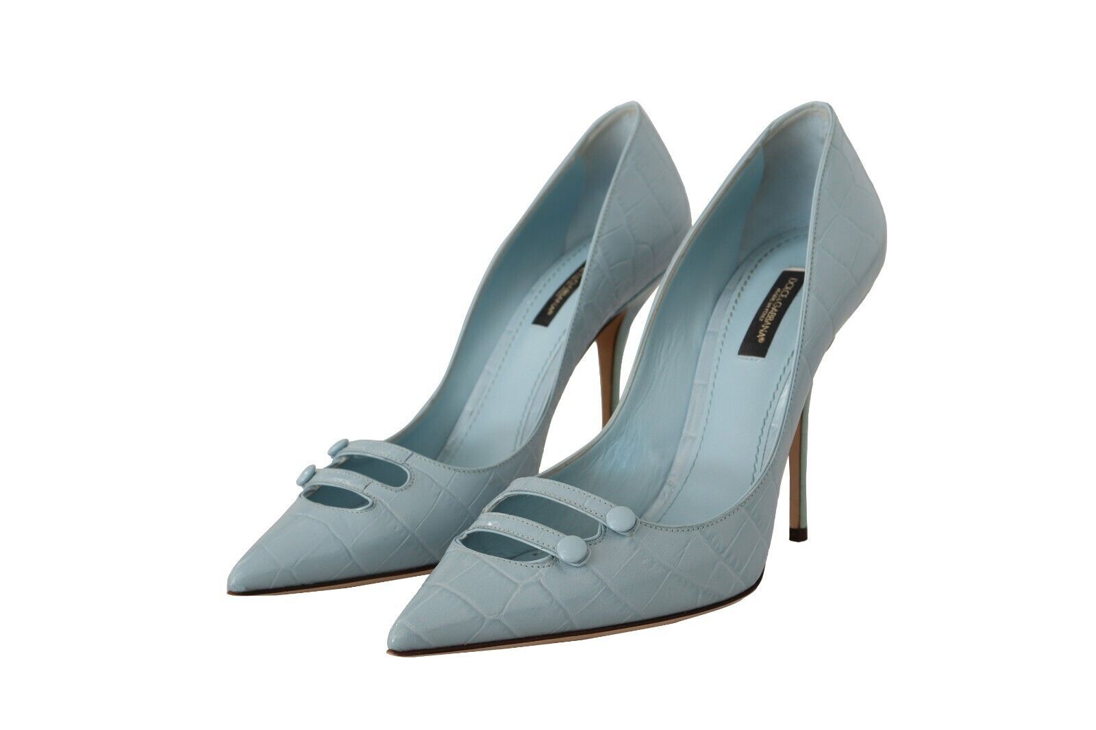 Experience luxury and sophistication with these stunning 100% Authentic Dolce & Gabbana leather pumps. Perfectly crafted with a crocco pattern, these light blue heels feature a sleek, pointed toe and a comfortable leather sole. Indulge in the impeccable Italian craftsmanship and elevate your footwear collection with these exquisite high heels, detailed with the iconic logo for an added touch of elegance.