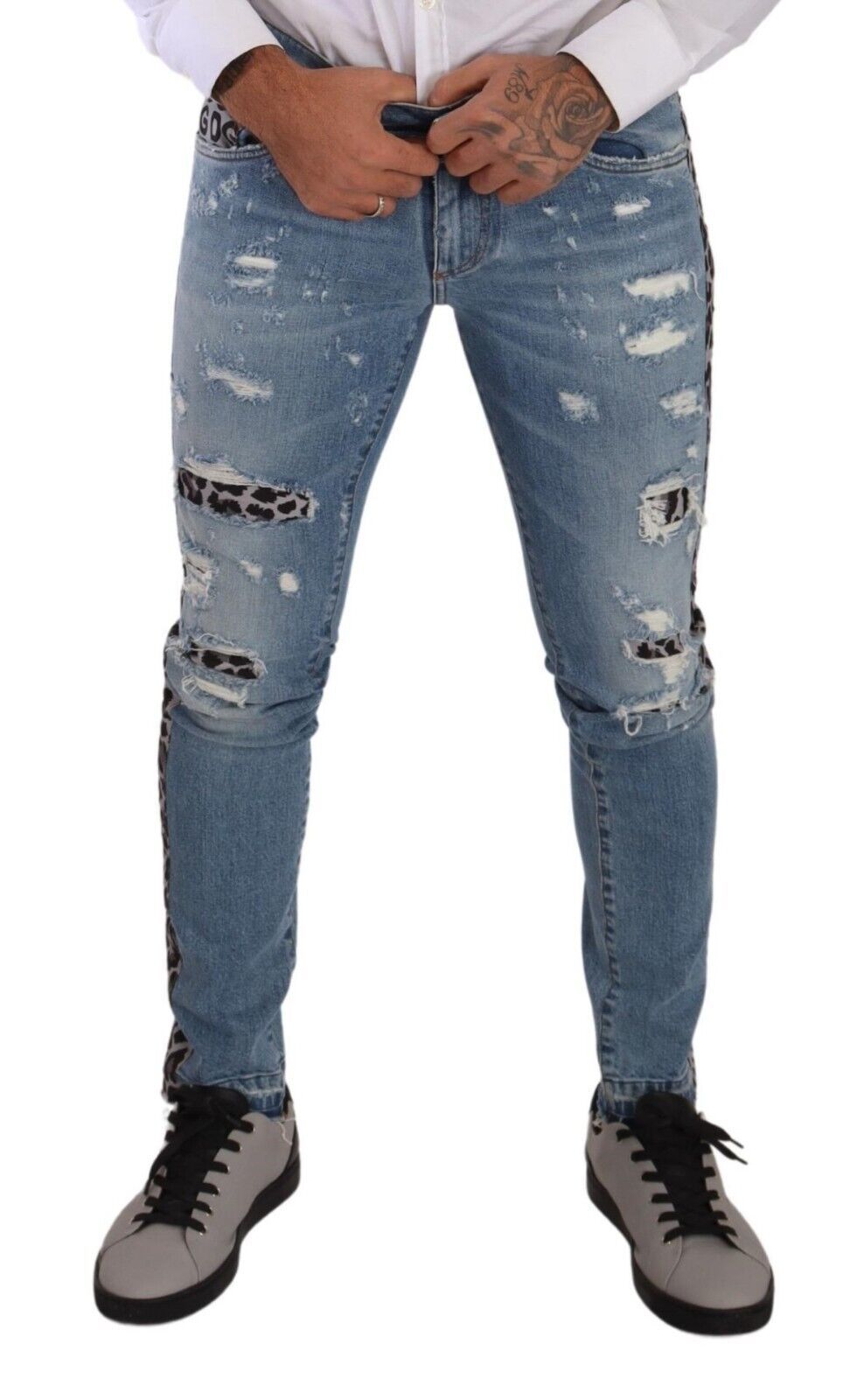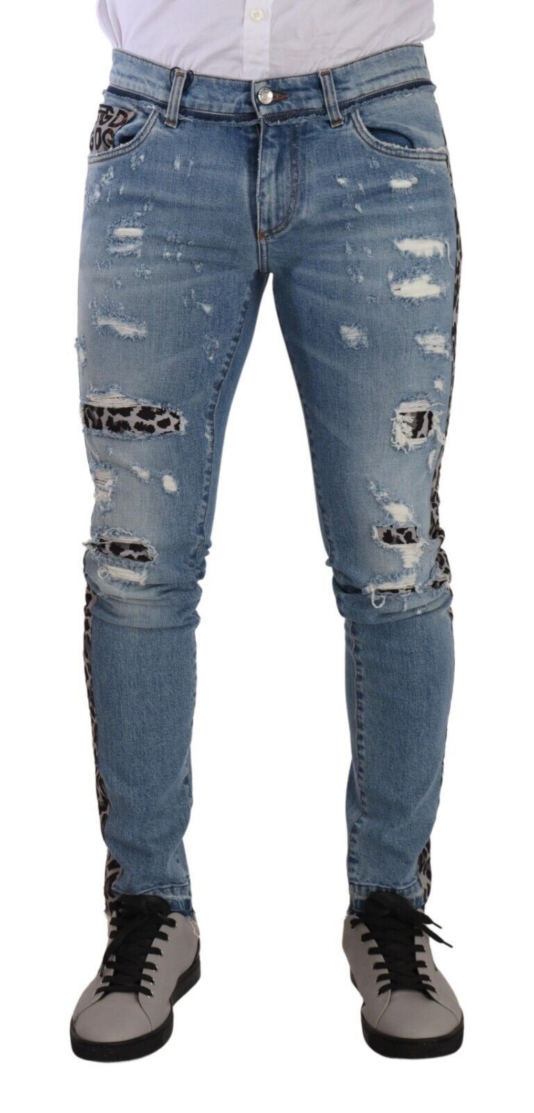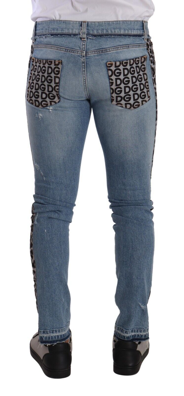 Embark on a journey of style with these exquisite Dolce & Gabbana skinny jeans. Perfectly tailored to flatter your physique, these light blue denim jeans come with a subtle yet striking leopard pattern detailing for an added touch of opulence. Crafted in Italy, they exude luxury and promise to be a versatile addition to your wardrobe, assuring comfort with their carefully constituted blend of cotton, polyester, and a hint of elastane for that perfect stretch. Complete with a classic zip and button closure and the iconic logo details, these jeans are a true representation of high-end fashion and craftsmanship.