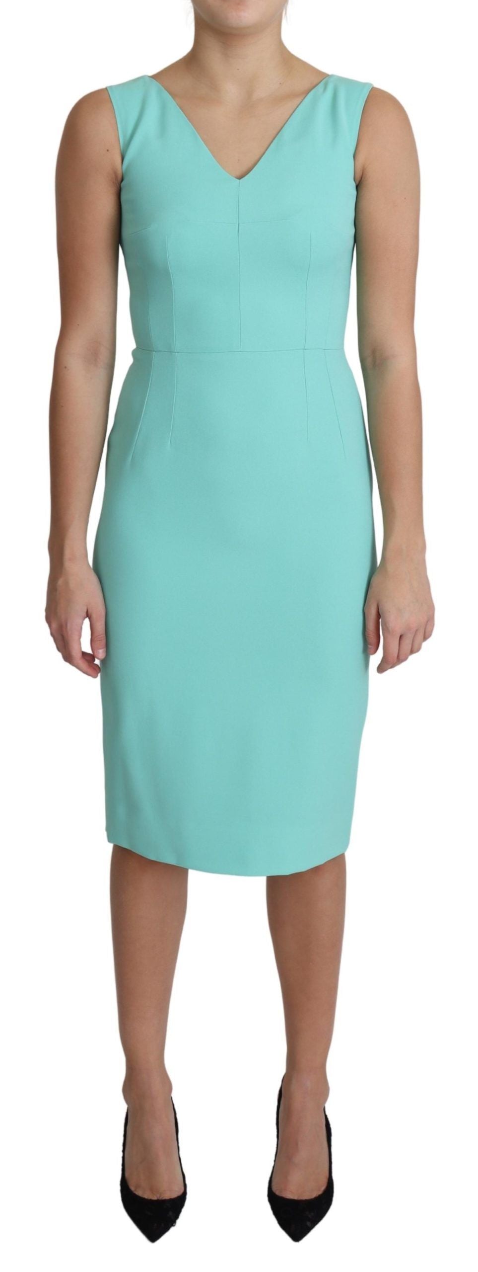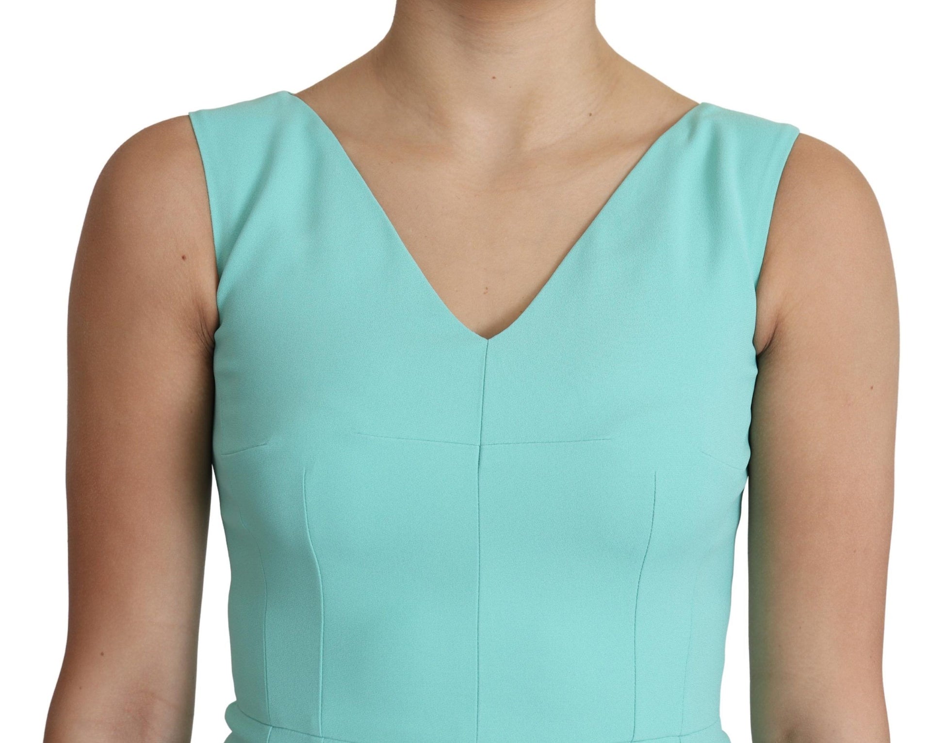 Step into a world of luxury and style with this exquisite light blue midi dress from Dolce & Gabbana. The perfect blend of modern elegance and classic design, this sleeveless shift dress is crafted from a premium blend of viscose and elastane, offering a flattering stretch fit. The v-neck cut adds a touch of sophistication to your ensemble, while the meticulous Italian craftsmanship ensures an exclusive garment of the highest quality. Adorned with subtle logo details and designed with a convenient zipper closure at the back, this dress is a composition of elegance and comfort. Ideal for your next upscale event or an elegant day out.