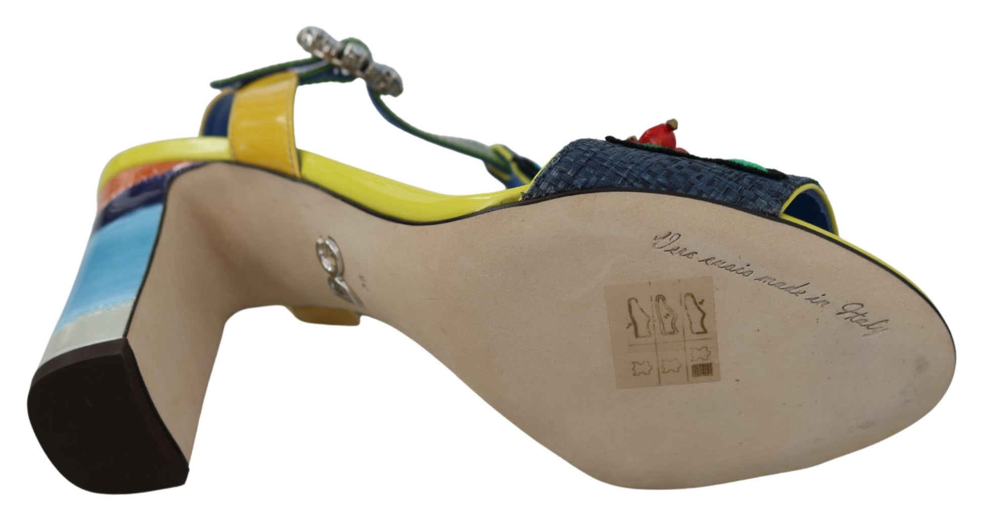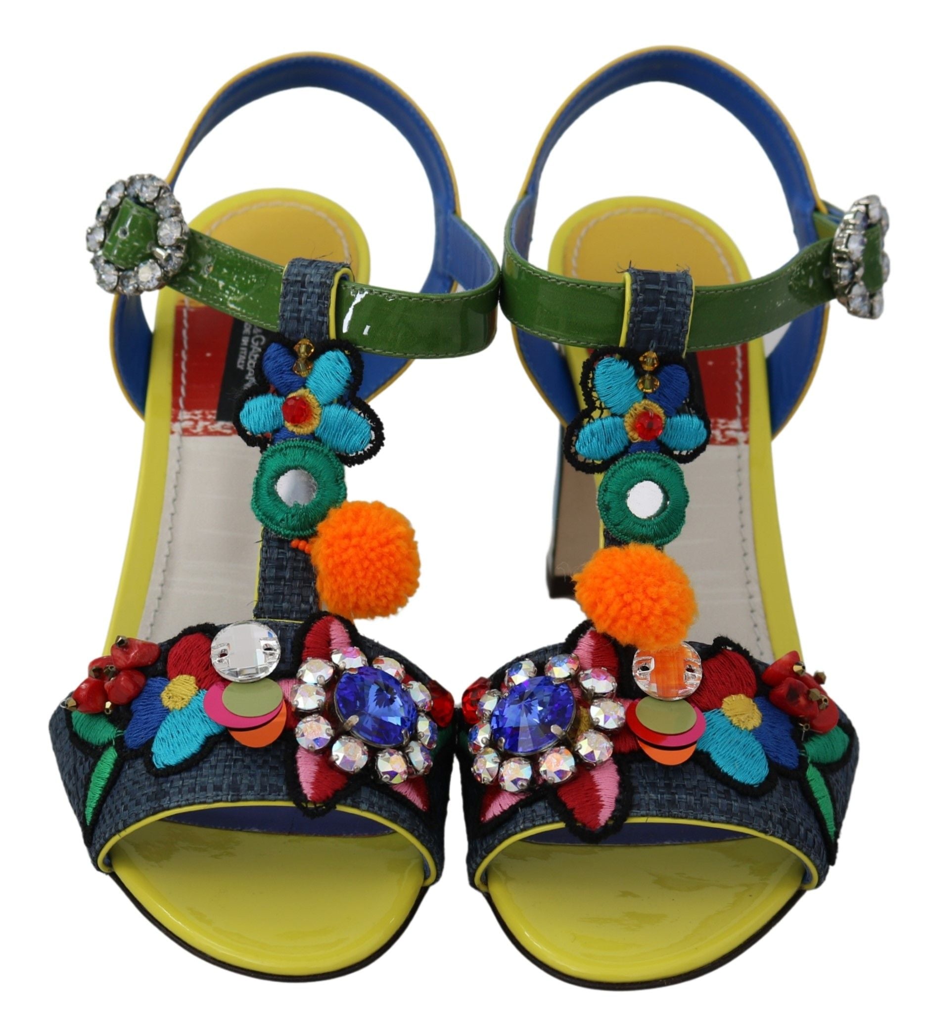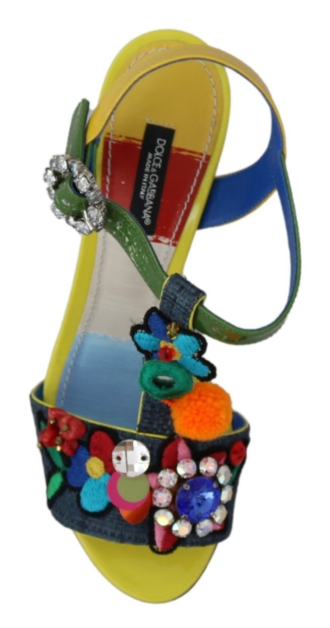 Step into luxury with these exquisite Dolce & Gabbana ankle strap sandals. Adorned with sparkling clear and blue crystals and showcasing a vibrant Majolica pattern, these sandals are the perfect blend of opulence and artisanal craftsmanship. Crafted from a mix of materials including straw, leather, and cotton, they promise both comfort and style. Made in Italy, these sandals are a testament to the elegant aesthetics and superior quality that Dolce & Gabbana is renowned for.