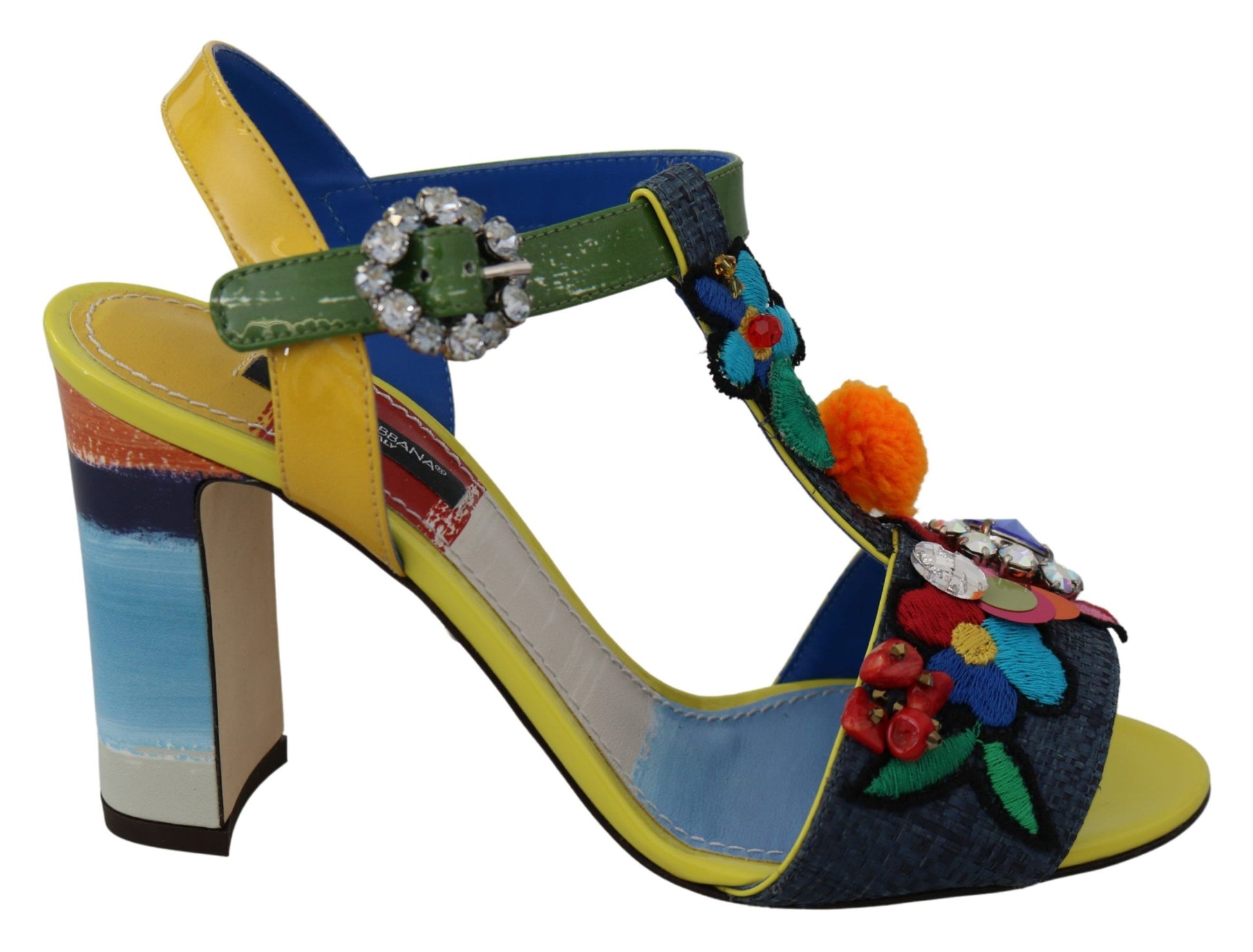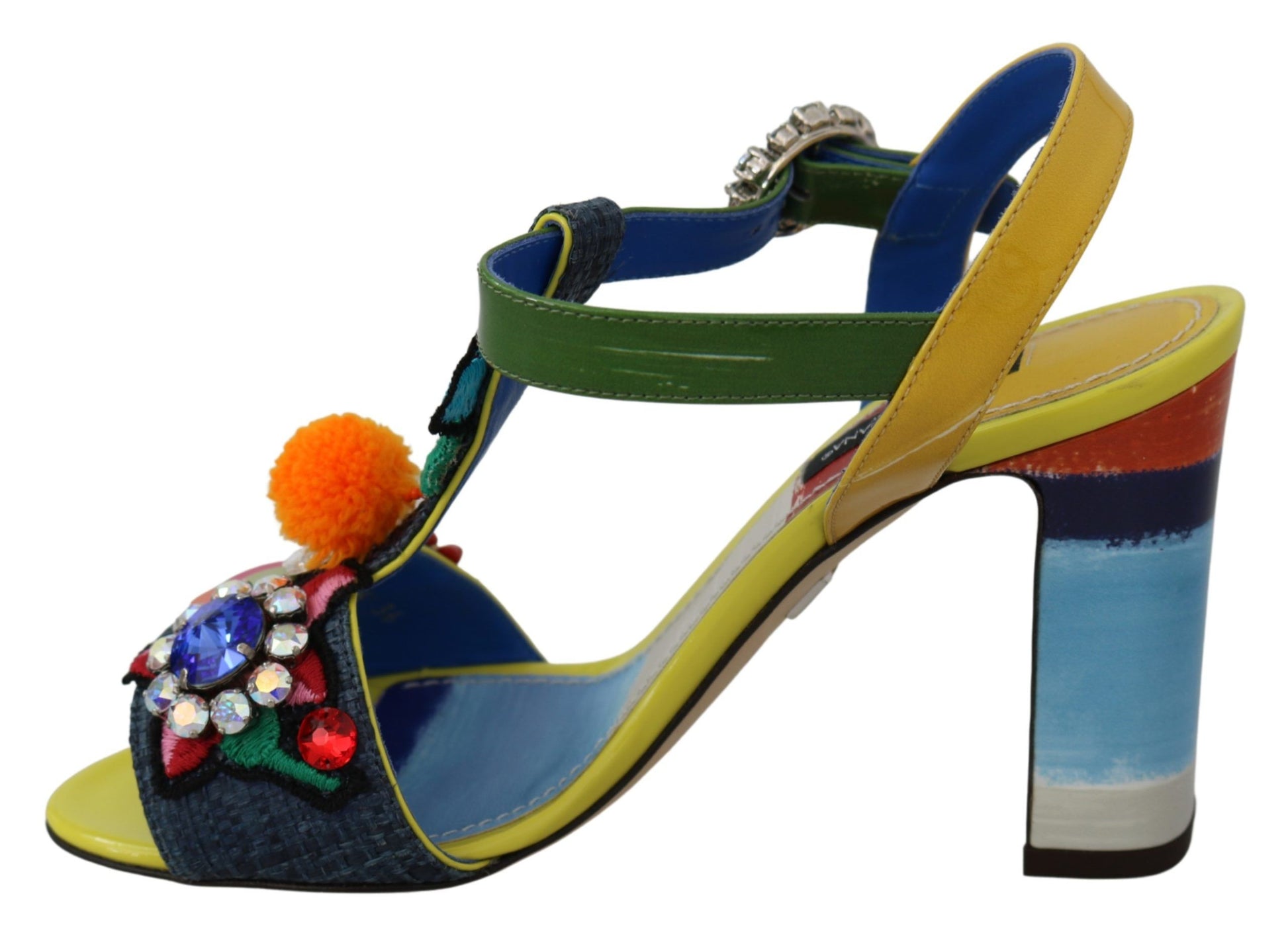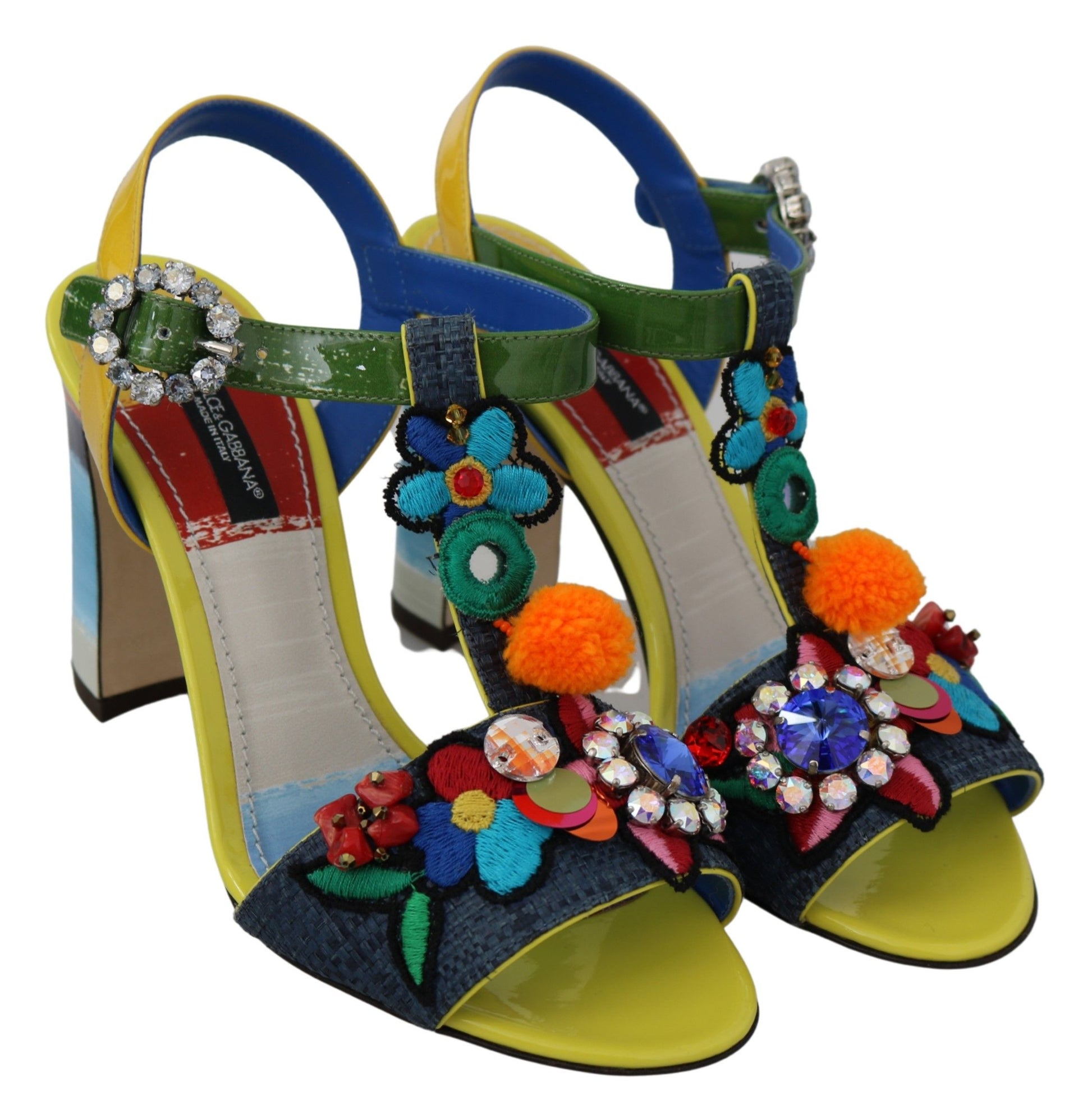 Step into luxury with these exquisite Dolce & Gabbana ankle strap sandals. Adorned with sparkling clear and blue crystals and showcasing a vibrant Majolica pattern, these sandals are the perfect blend of opulence and artisanal craftsmanship. Crafted from a mix of materials including straw, leather, and cotton, they promise both comfort and style. Made in Italy, these sandals are a testament to the elegant aesthetics and superior quality that Dolce & Gabbana is renowned for.