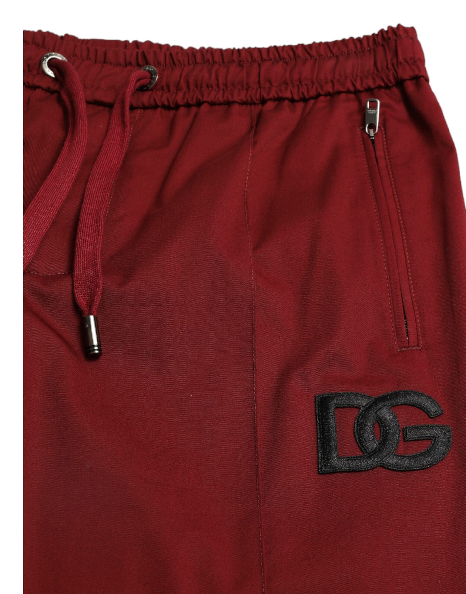 Step up your casual wear with these Dolce & Gabbana maroon jogger pants, perfect for adding a touch of luxury to your everyday ensemble. These pants boast a skinny fit, crafted with a comfortable cotton stretch blend. The design features an elastic waist with drawstring closure for an adjustable fit, and flaunts the iconic logo detailing as a nod to its esteemed brand heritage. Made in Italy, these joggers promise both style and supreme tailoring.