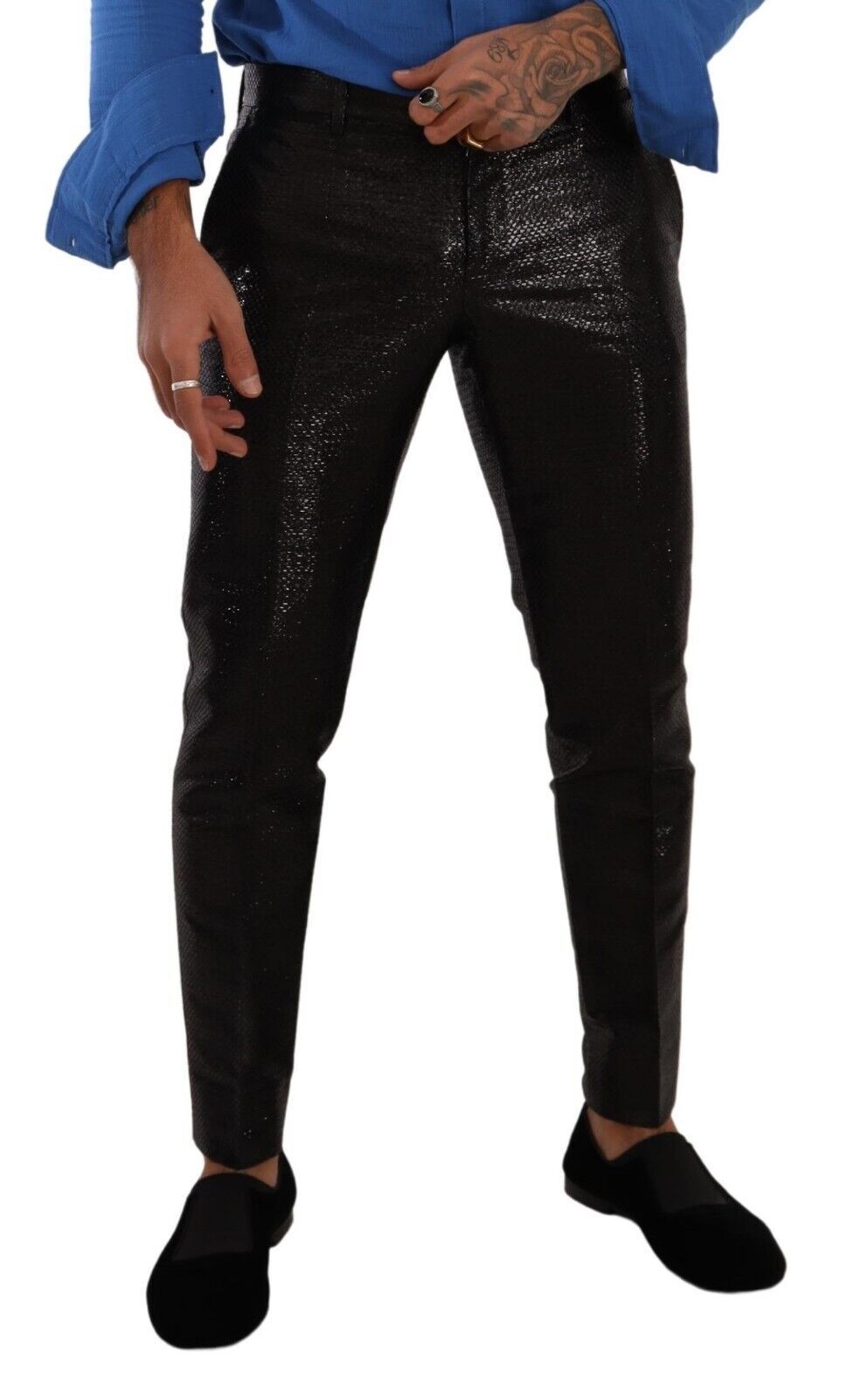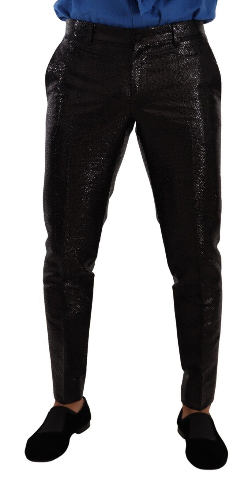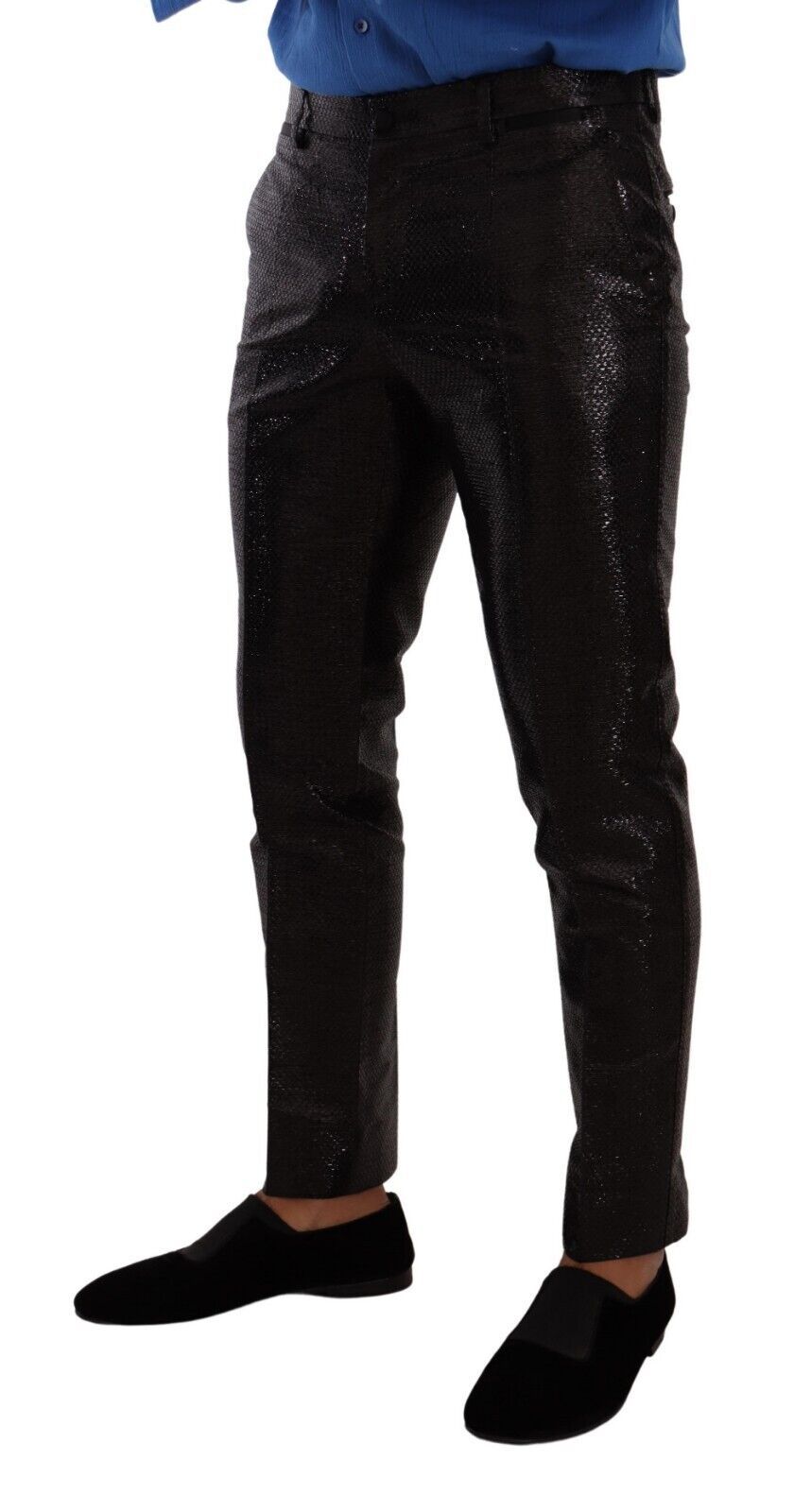 Step into elegance with these stunning Metallic Black Slim Fit Dress Pants from the prestigious house of Dolce & Gabbana. These pants are not only a touchstone of sophistication, but they also promise unparalleled comfort and style. With a composition that boasts a blend of high-quality materials, they feature a sleek zipper and button closure, and they’re tailored for a slim-fit silhouette that will accentuate your form in the most flattering way. Effortless to dress up for formal events or down for a smart-casual look, they’re an essential piece in any discerning gentleman’s wardrobe.