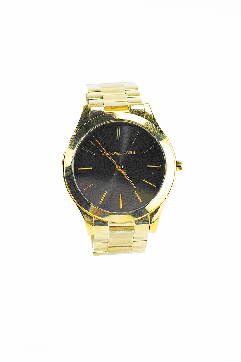 Style: Michael Kors (MK3478) Slim Runway Gold Toned Stainless Steel Black Dial Watch