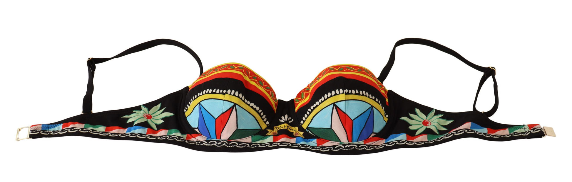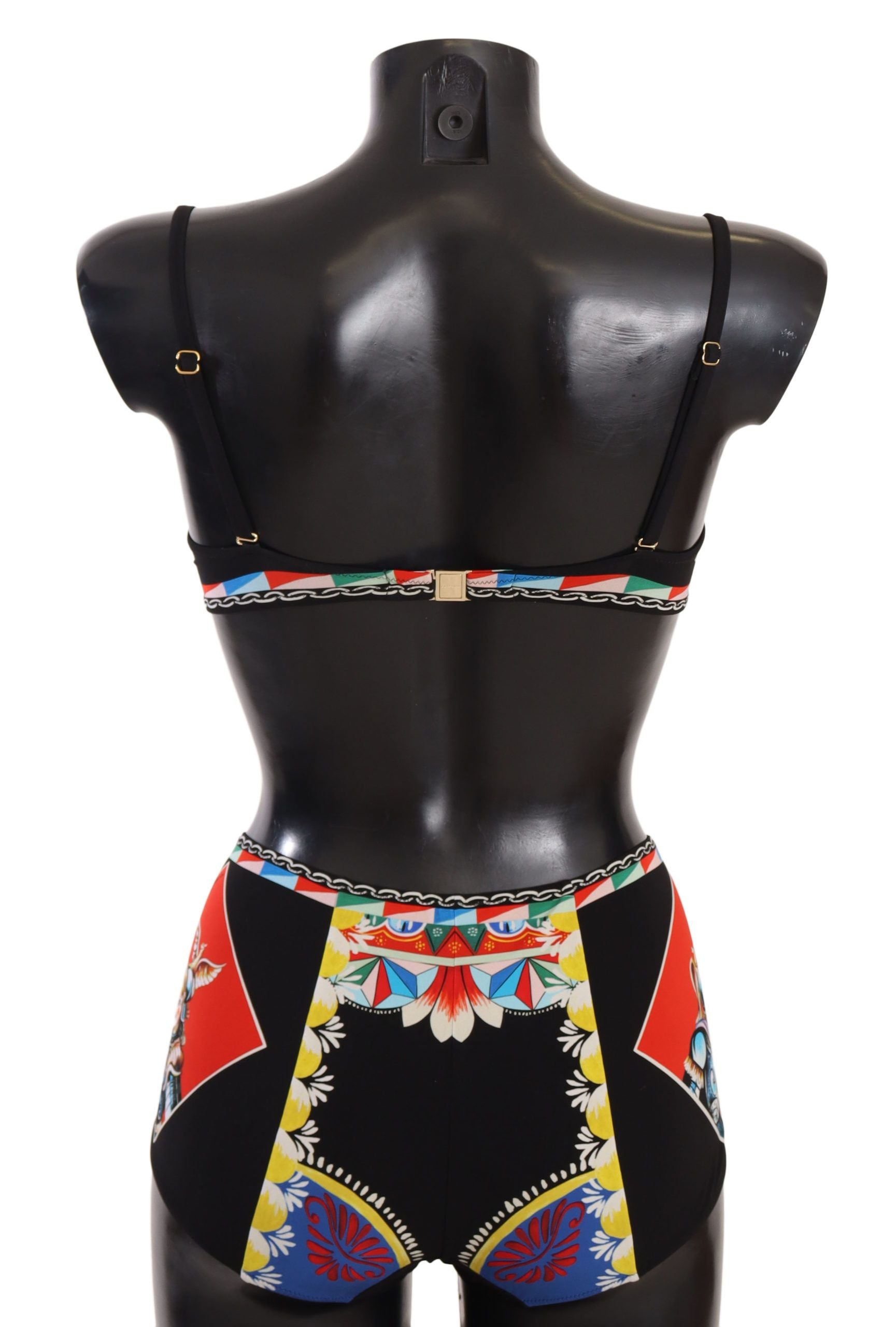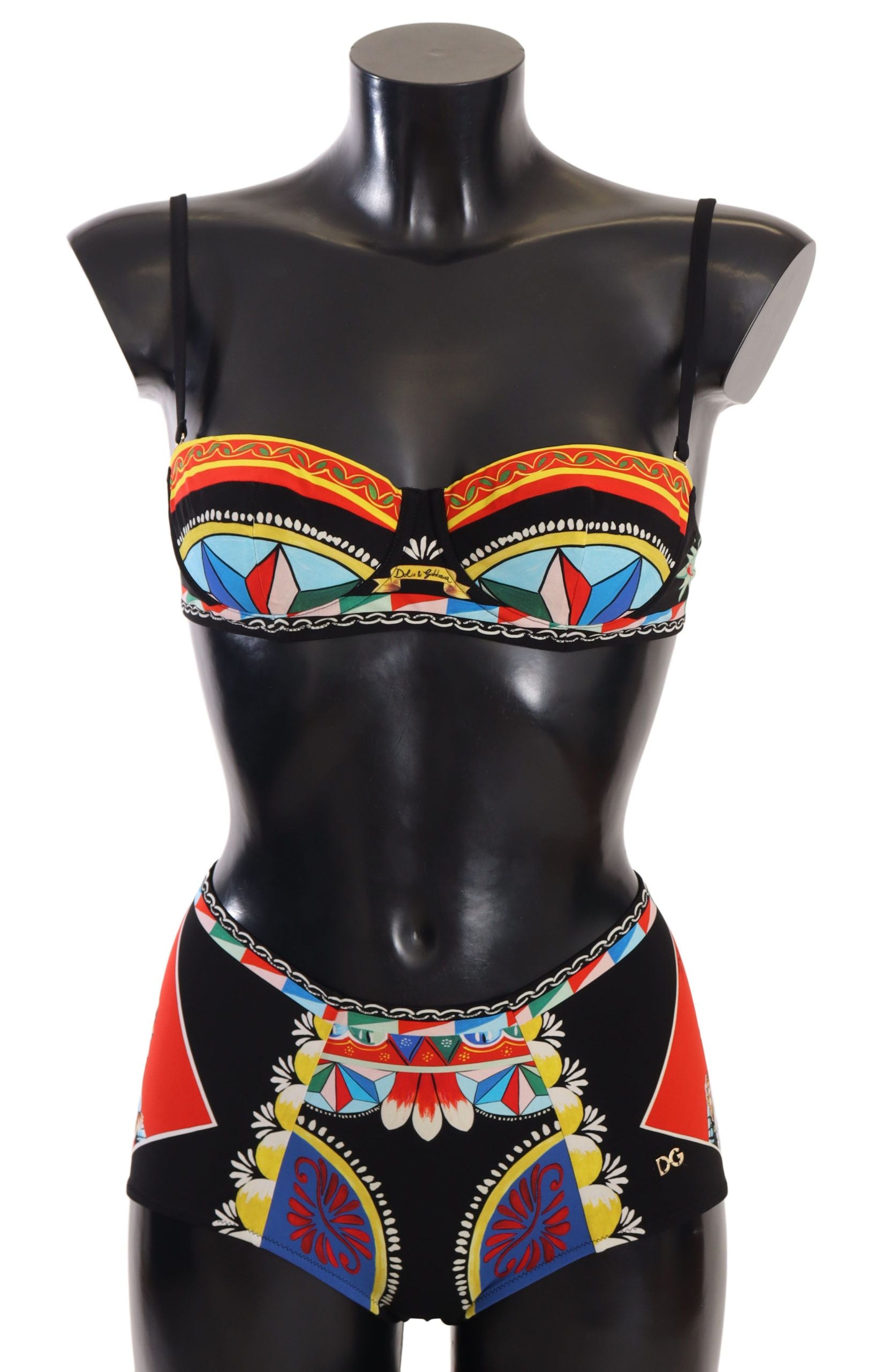 Embrace the sun with the stunning Graphic Print Two-Piece Swimsuit by Dolce & Gabbana. With its vibrant multicolor Carretto design, this swimwear not only offers style but the comfort and support you desire. The top features adjustable shoulder straps and padded cups for a tailored fit, while the back fastener ensures everything stays in place. The high-waisted bottoms accentuate your curves and are adorned with a gold-tone monogram plaque, adding that touch of luxury. Crafted in Italy from a quality blend of materials, this bikini set is perfect for making a statement at the beach or pool.